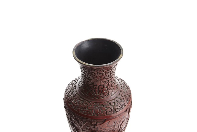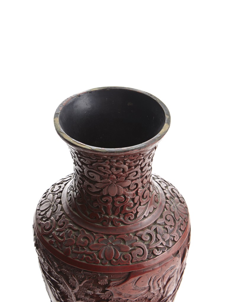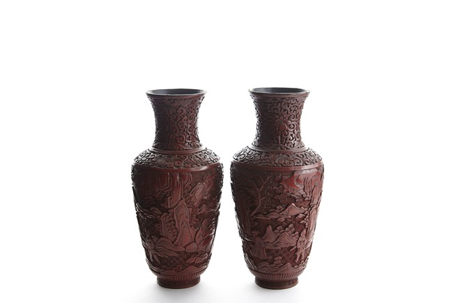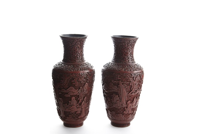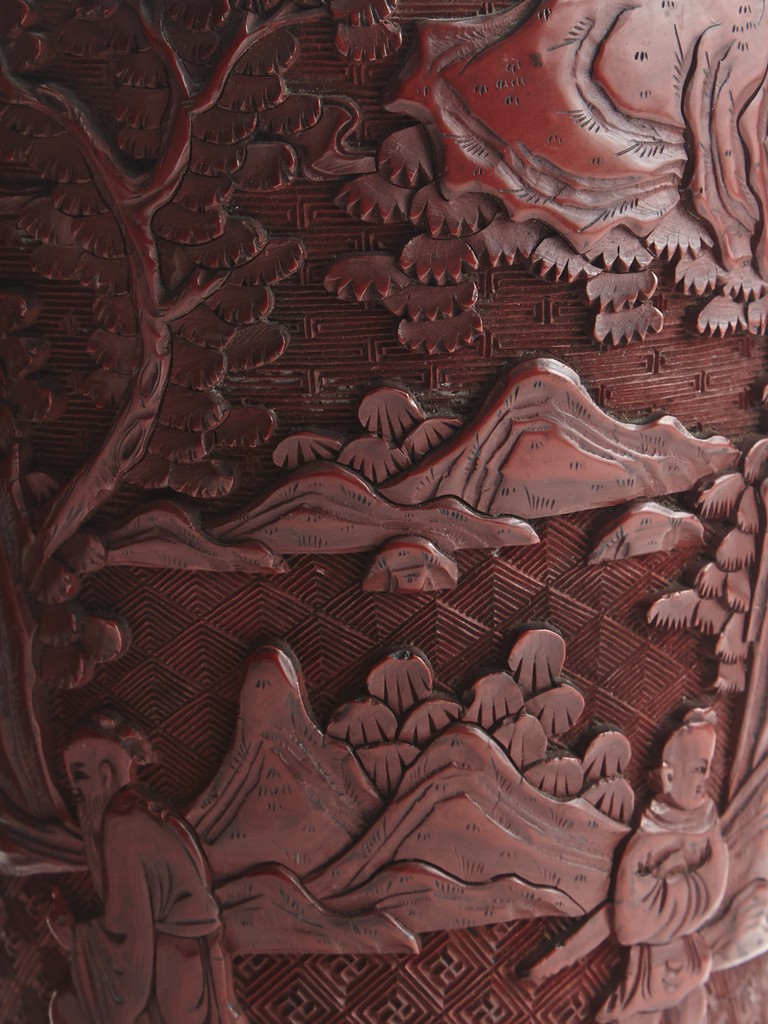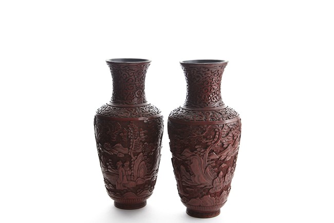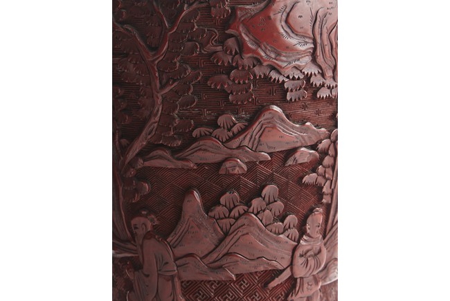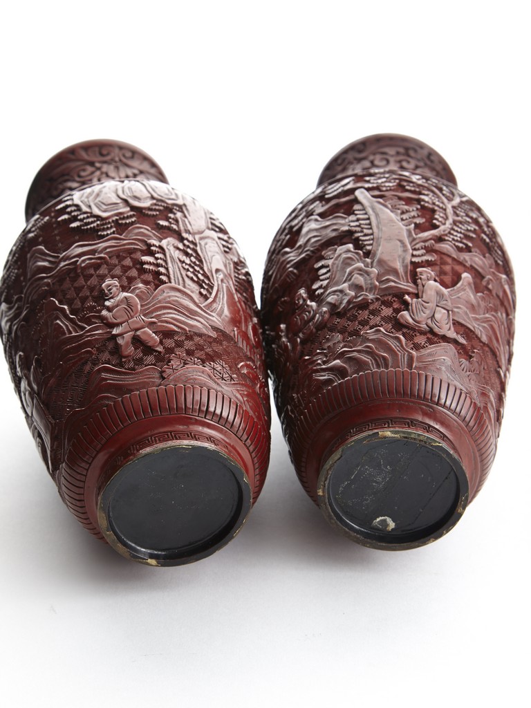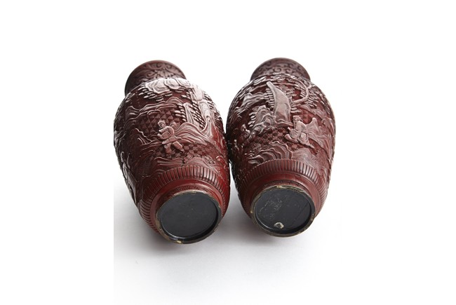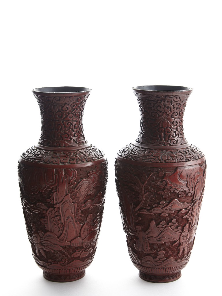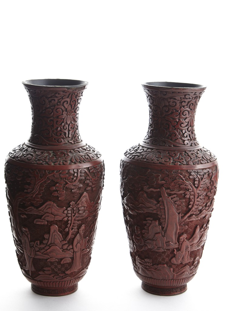 Each of baluster form, the body deeply carved with different continuous scene of elderly scholars and young attendants within a rocky mountainous landscape amongst trees and rocky outcrops, all reserved on dense diaper ground, the neck and shoulder finely carved with scrolled foliate pattern. Qing Dynasty period.
