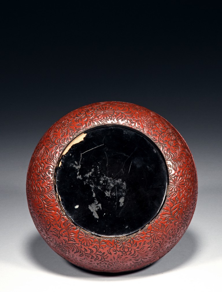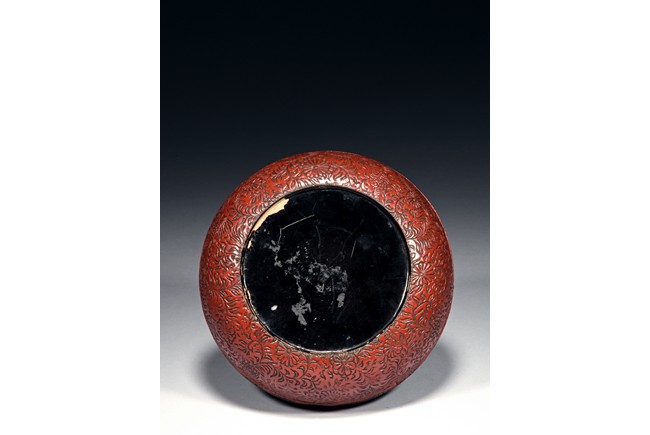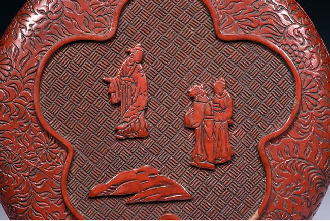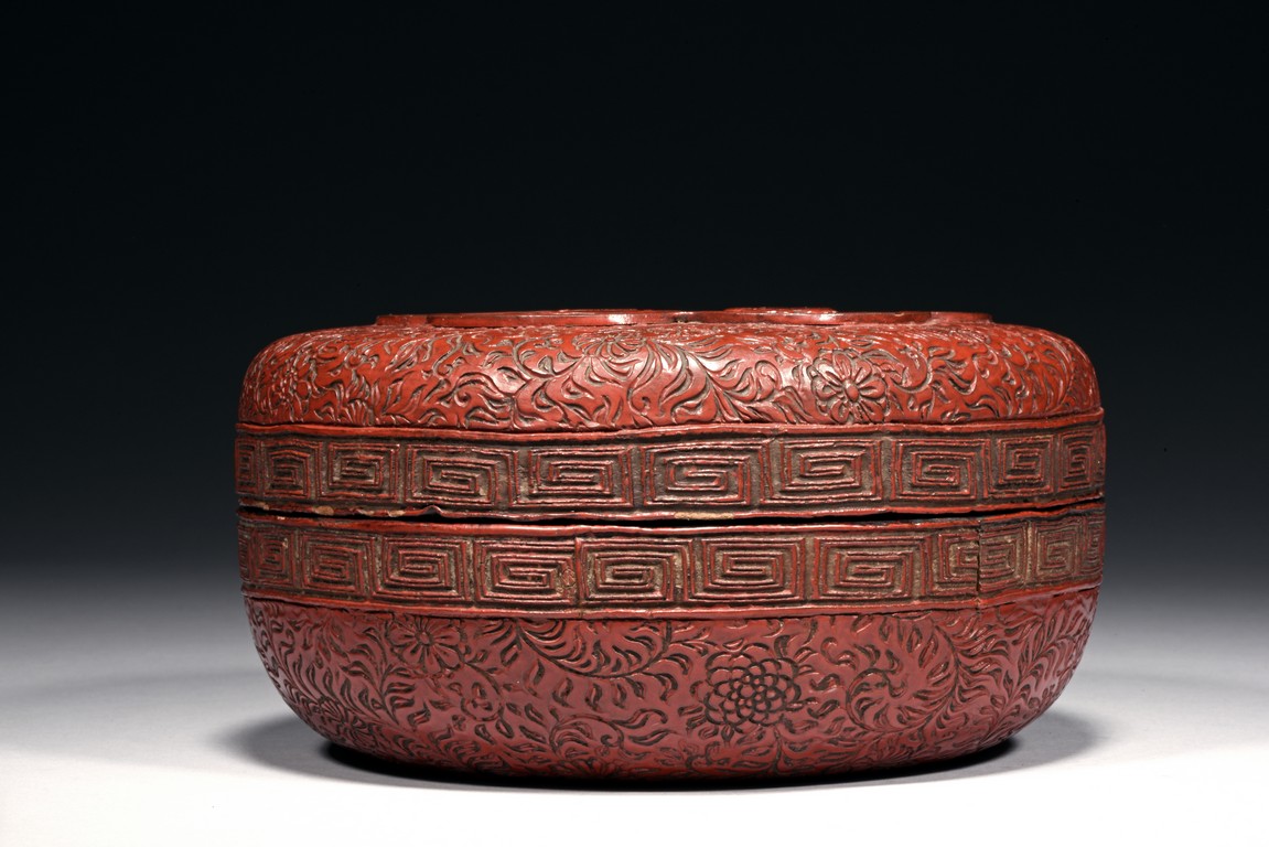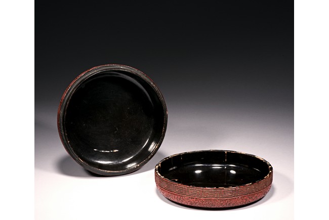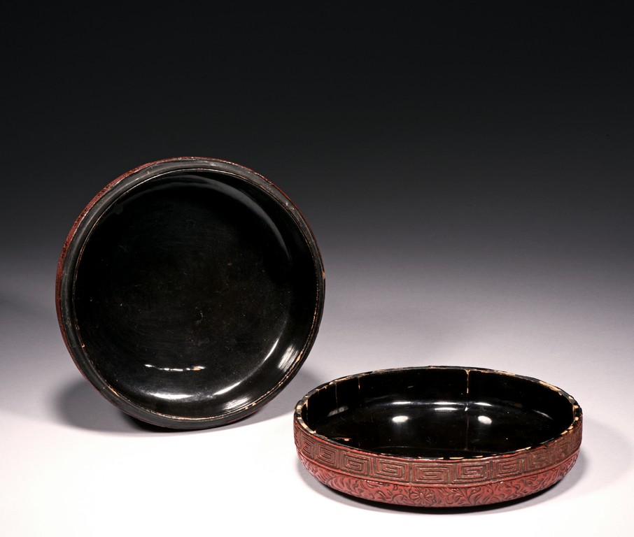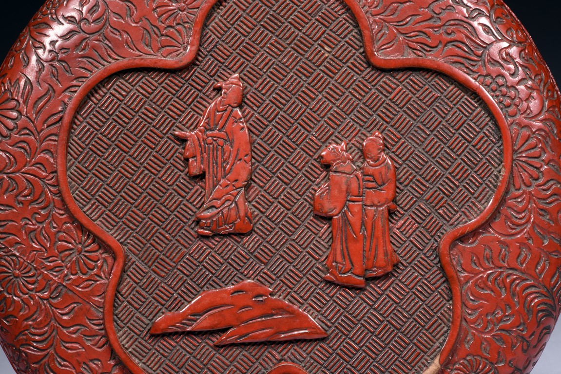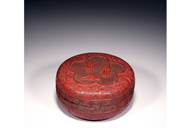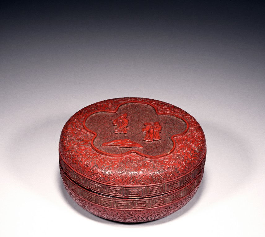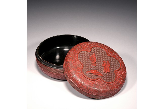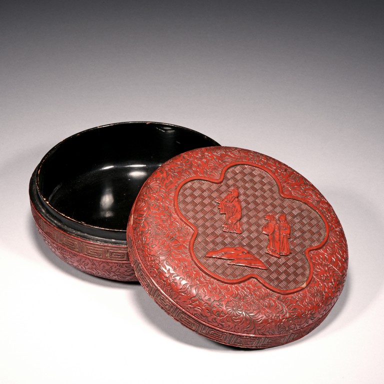 The cover carved with a three scholar figures in an outdoor setting reserved on diaper ground and enclosed by pentafoil border, the sides carved with dense scrolling foliate ground and key-fret band, the base similarly carved, the interior lacquered in black. Qing Dynasty period.