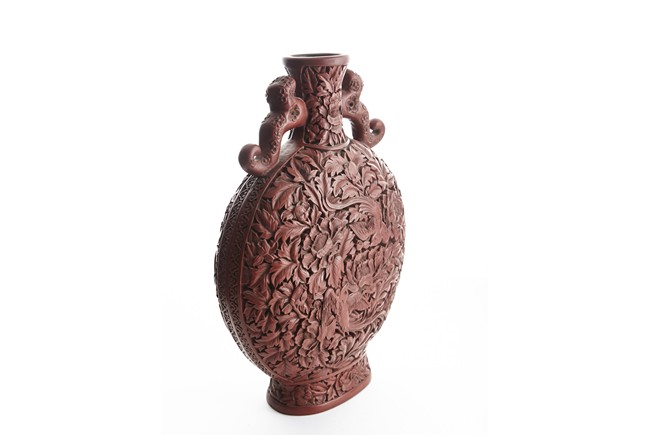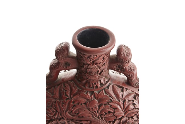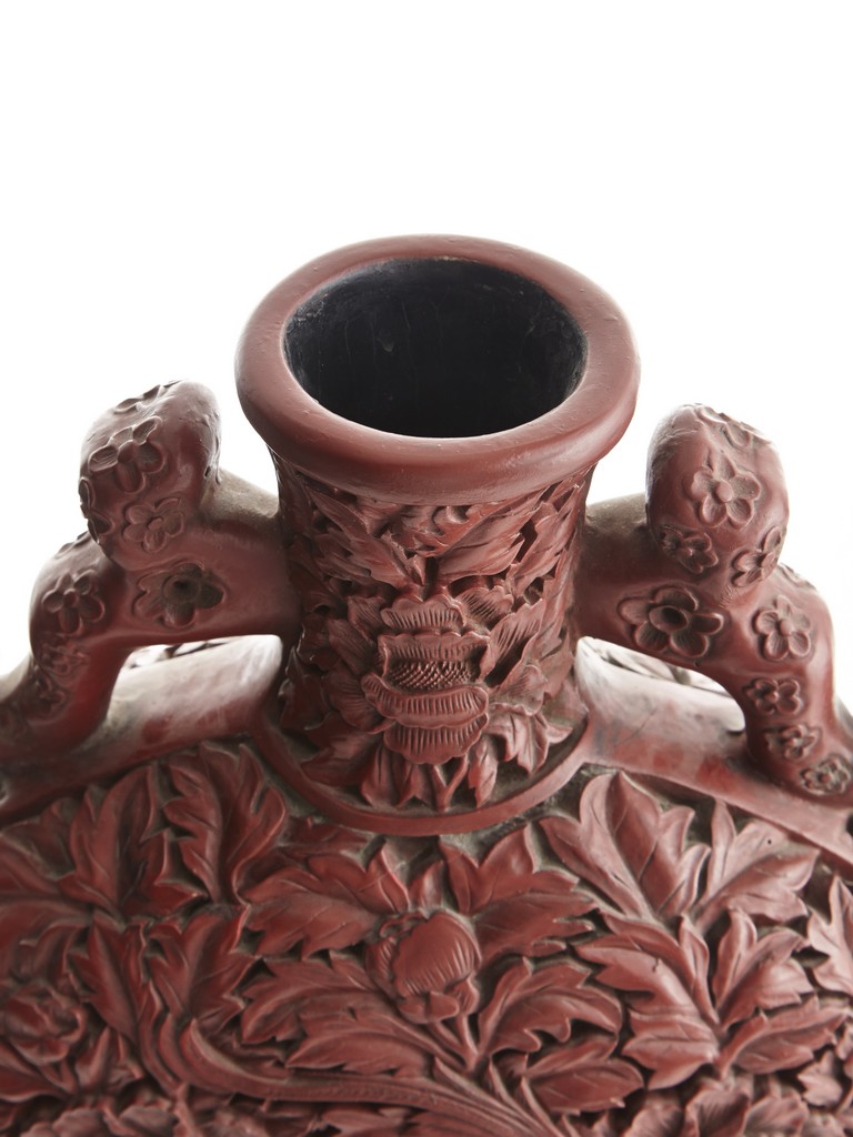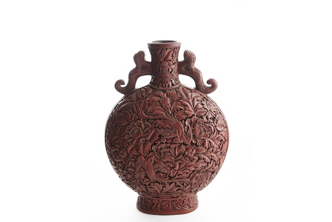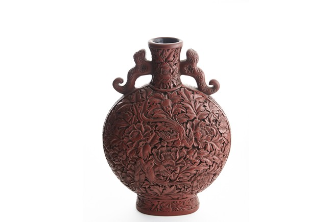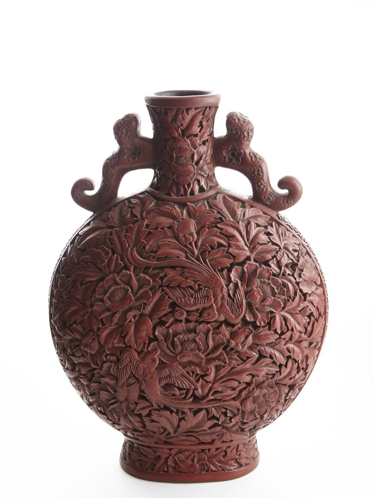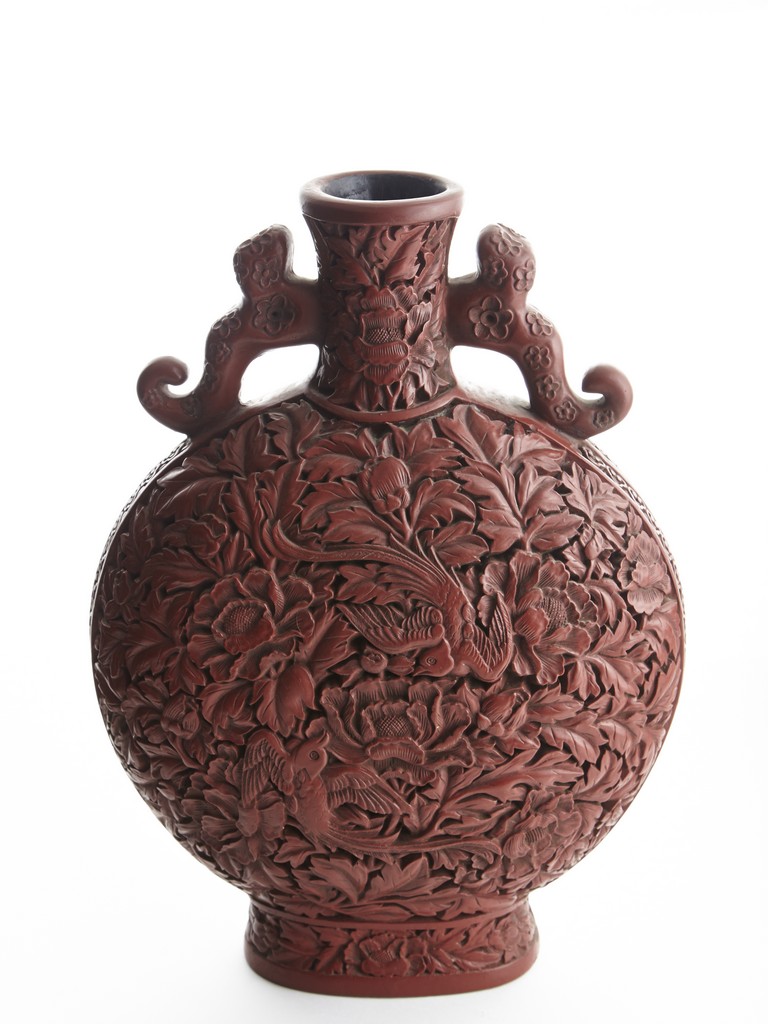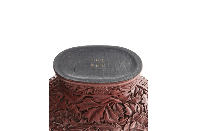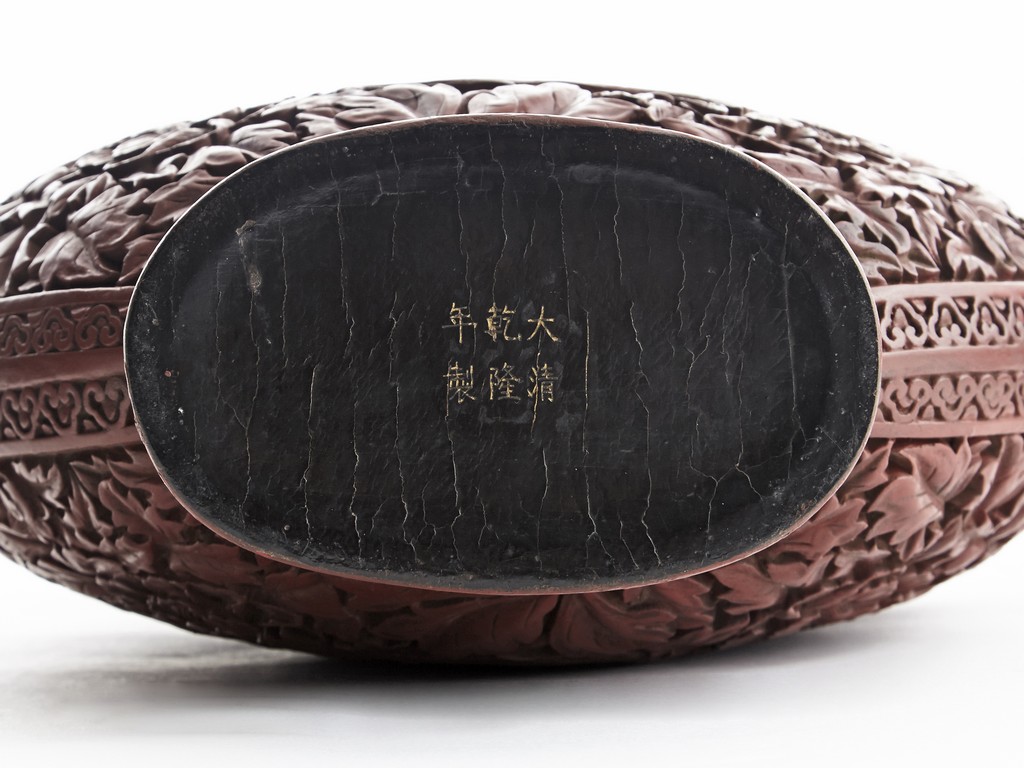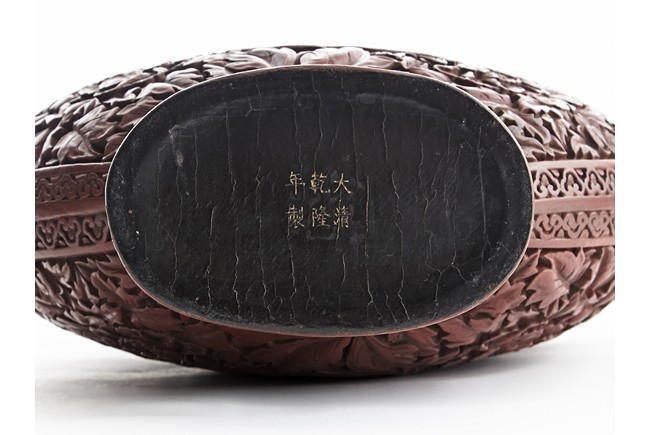 Raised on ovoid foot ring, the flattened and rounded body finely carved in relief throught the layers of lacquer with dense flowering branches and two birds in flight to the front and reverse, and continuing up onto the neck which is flanked by a pair of lacquered handles. The base bears six character 'QIANLONG' mark in gilt. Qing Dynasty period.