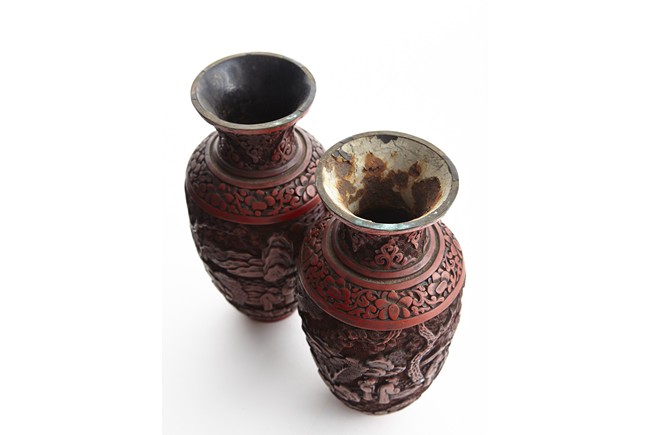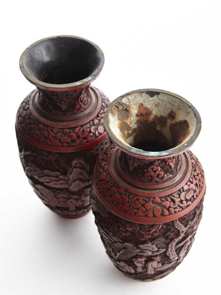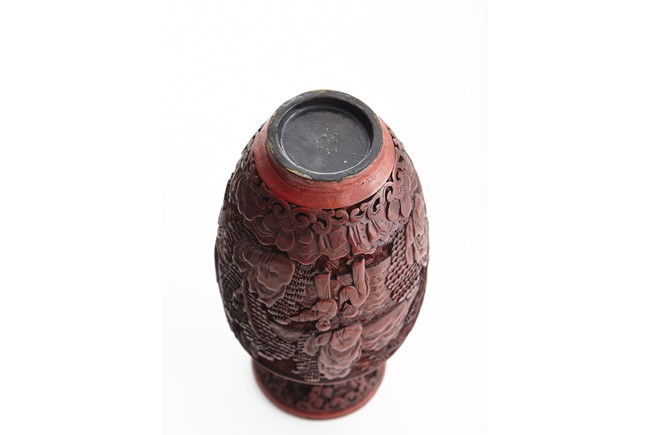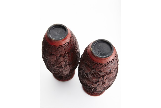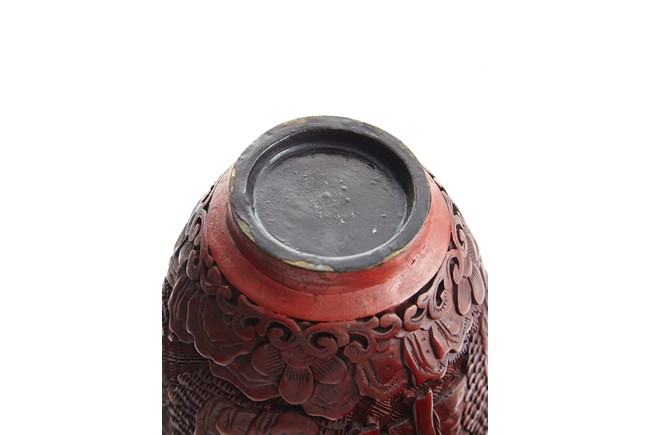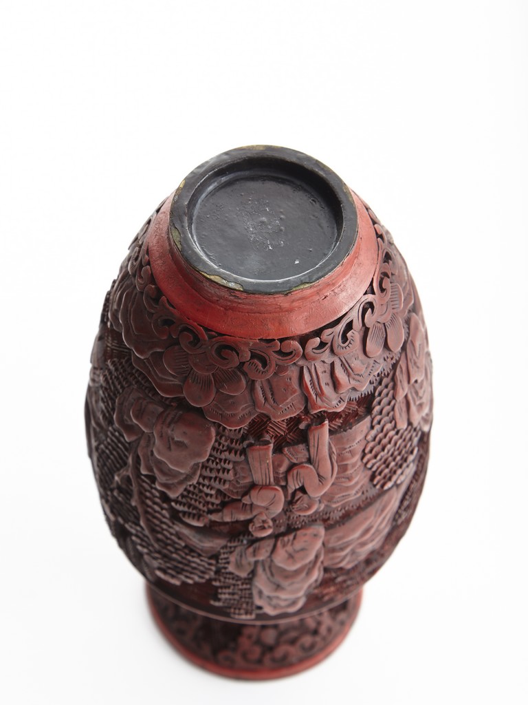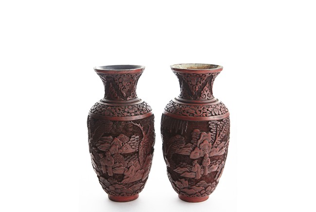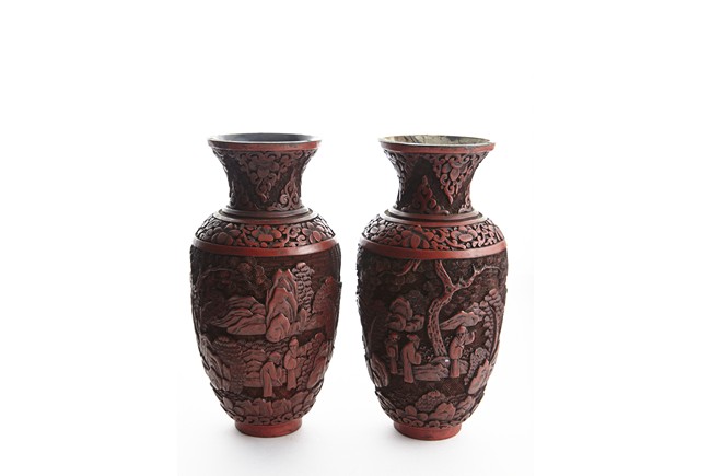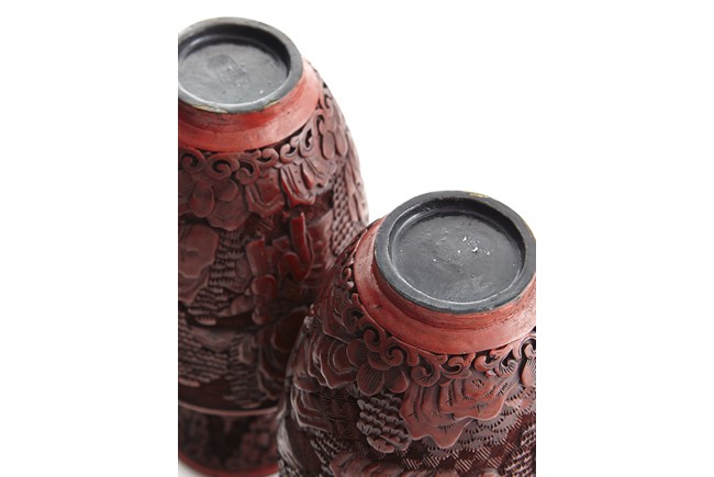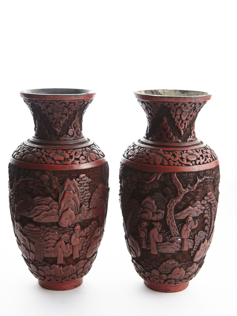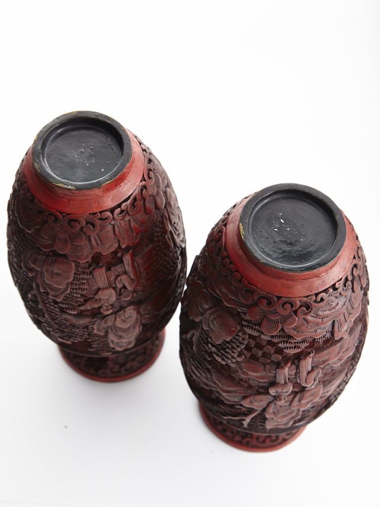 Each rises from circular foot ring, the body finely carved through layers with a garden landscape scene of elderly literati in conversation under tall pine tree, amongst rockworks and various trees, the far distance with hills and rocks, all reserved on dense diaper ground, the shoulder and neck with stylized floral pattern. Qing Dynasty period.