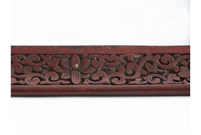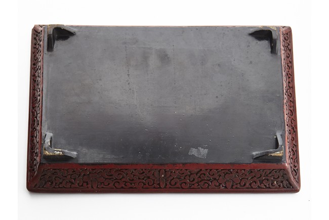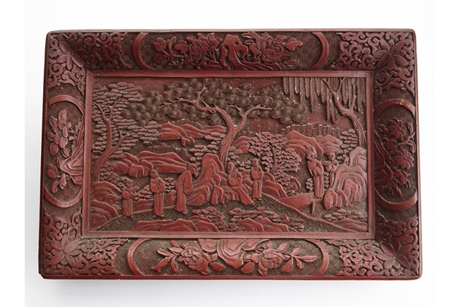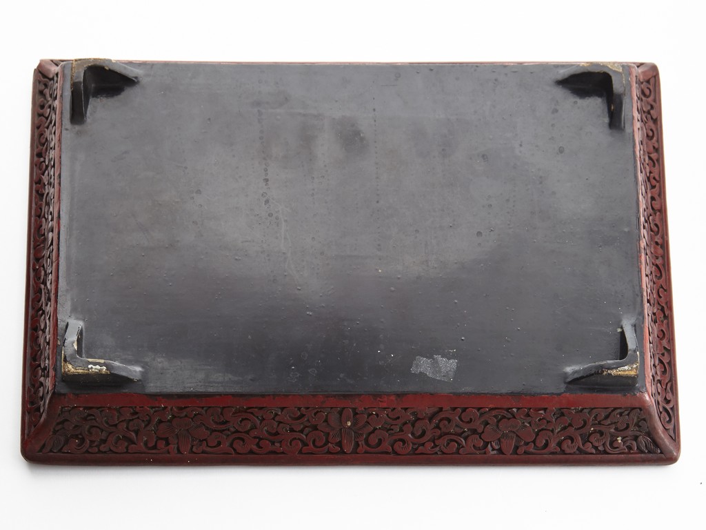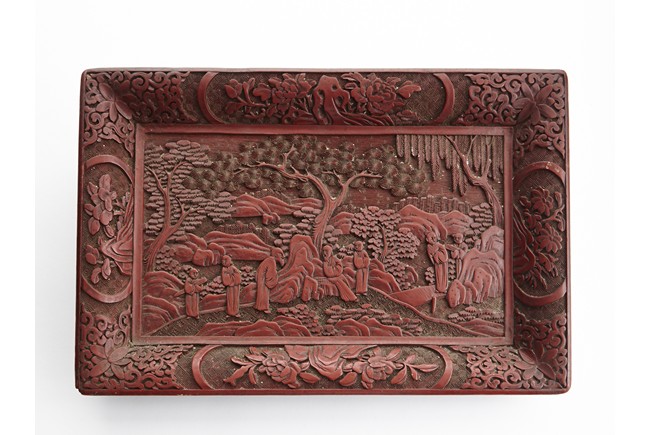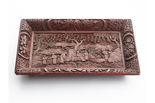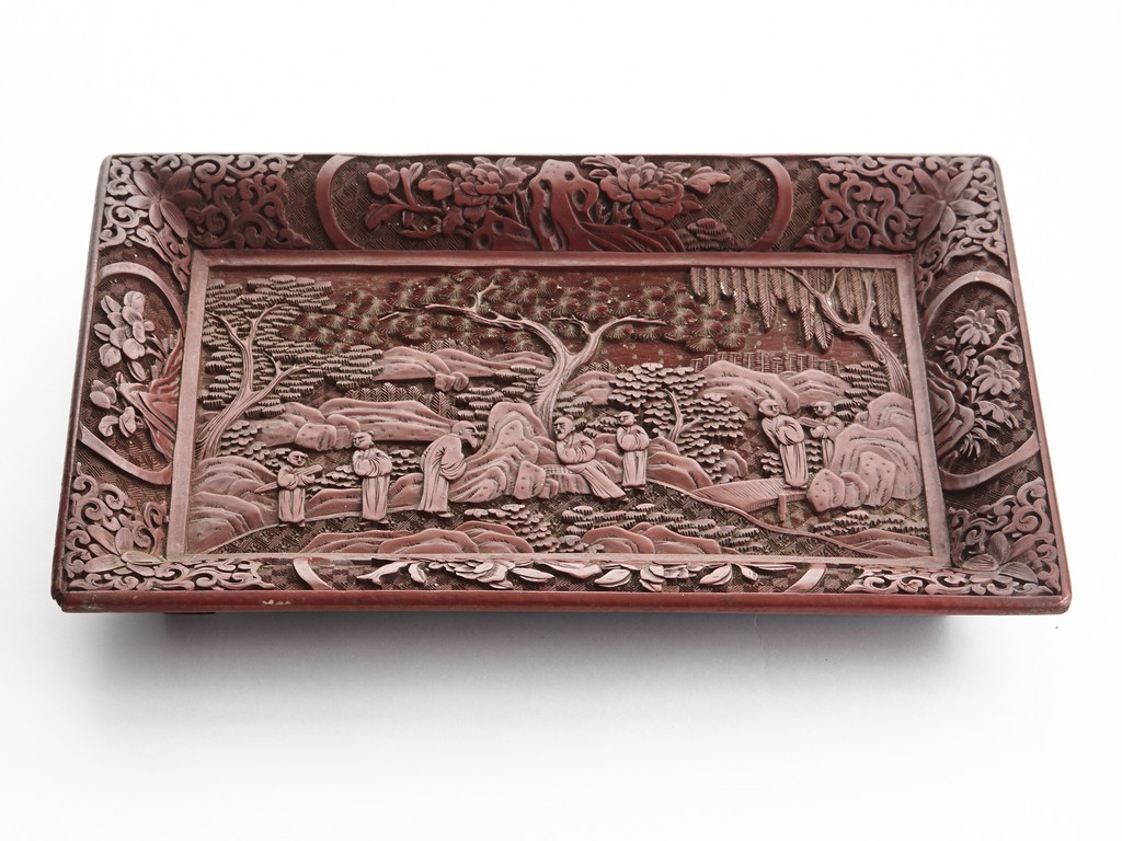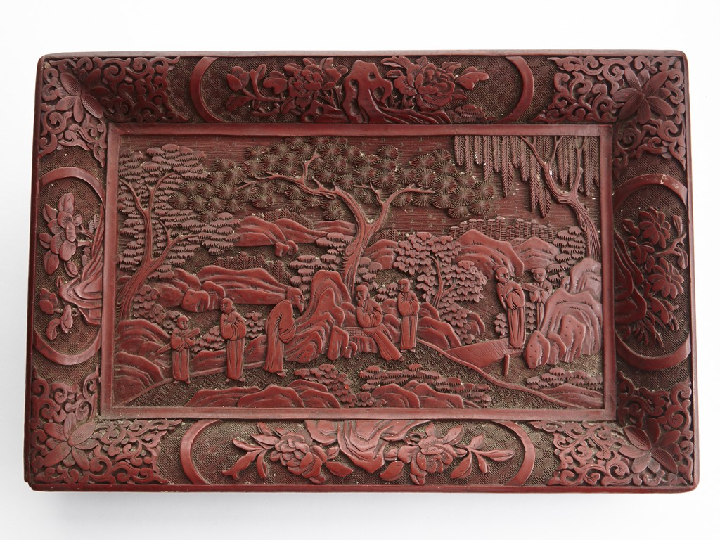 Of rectangular form, the dish is finely carved with a band of panels enclosing leafy flowers issuing from rocky outcrops and lotus scrolls, surrounding a courtyard scene, depicting two elderly gentlemen discussing under a tall pine tree, accompanied by young attendants, with various trees and hills in the far distance, all in relief on intricately carved diaper grounds. Qing Dynasty period.
