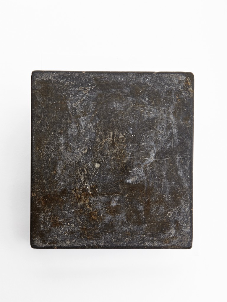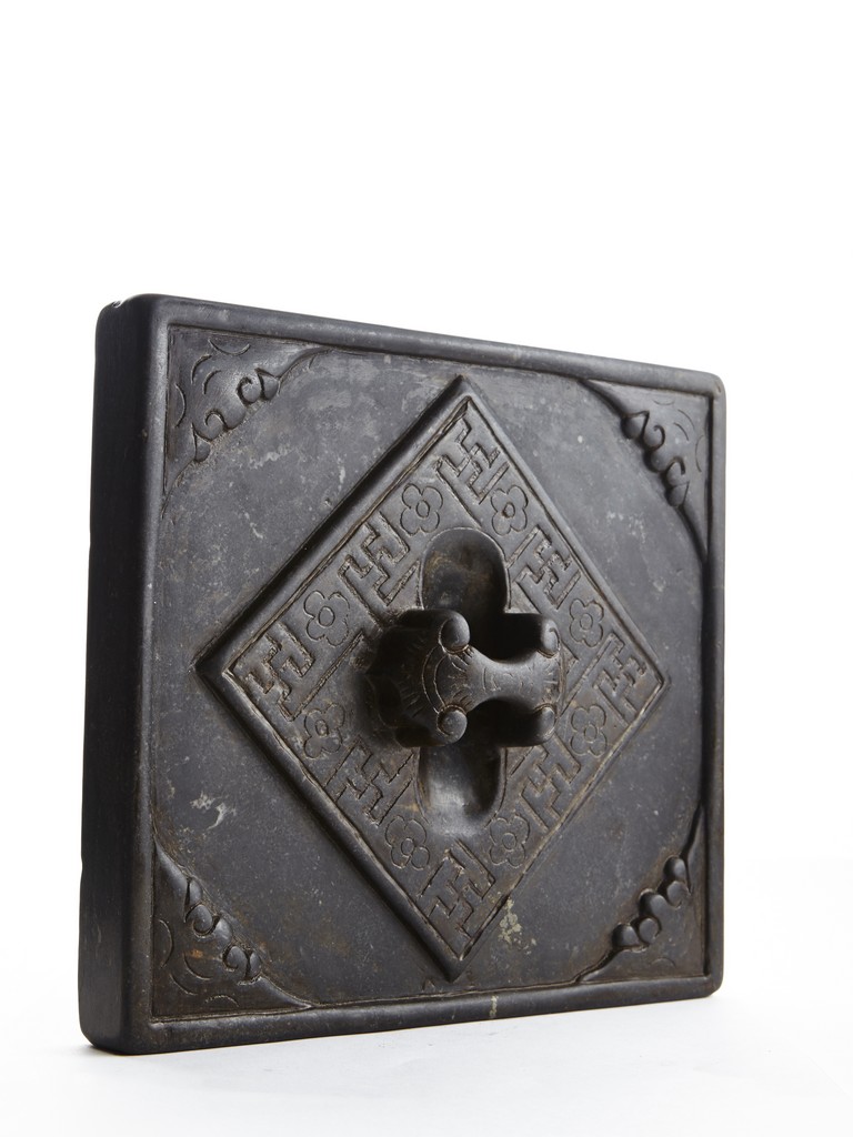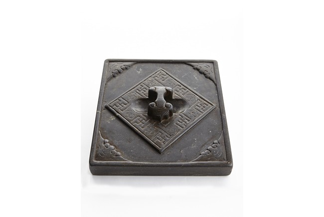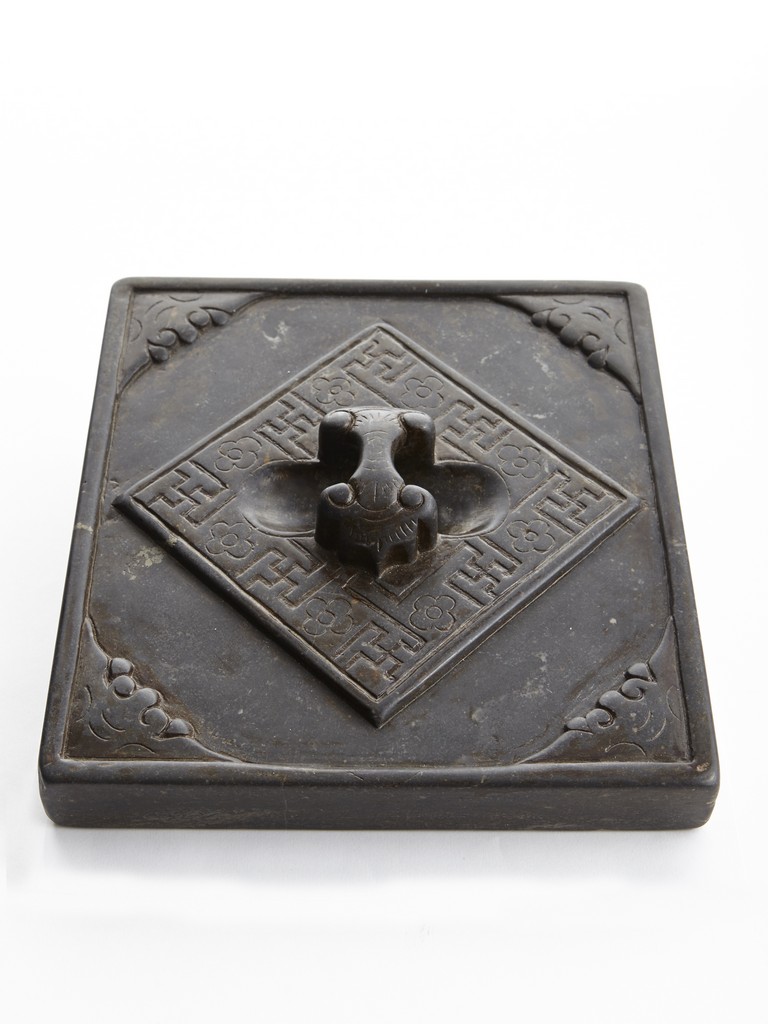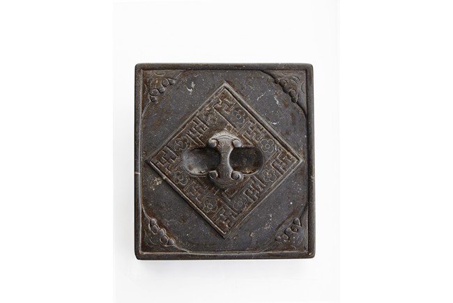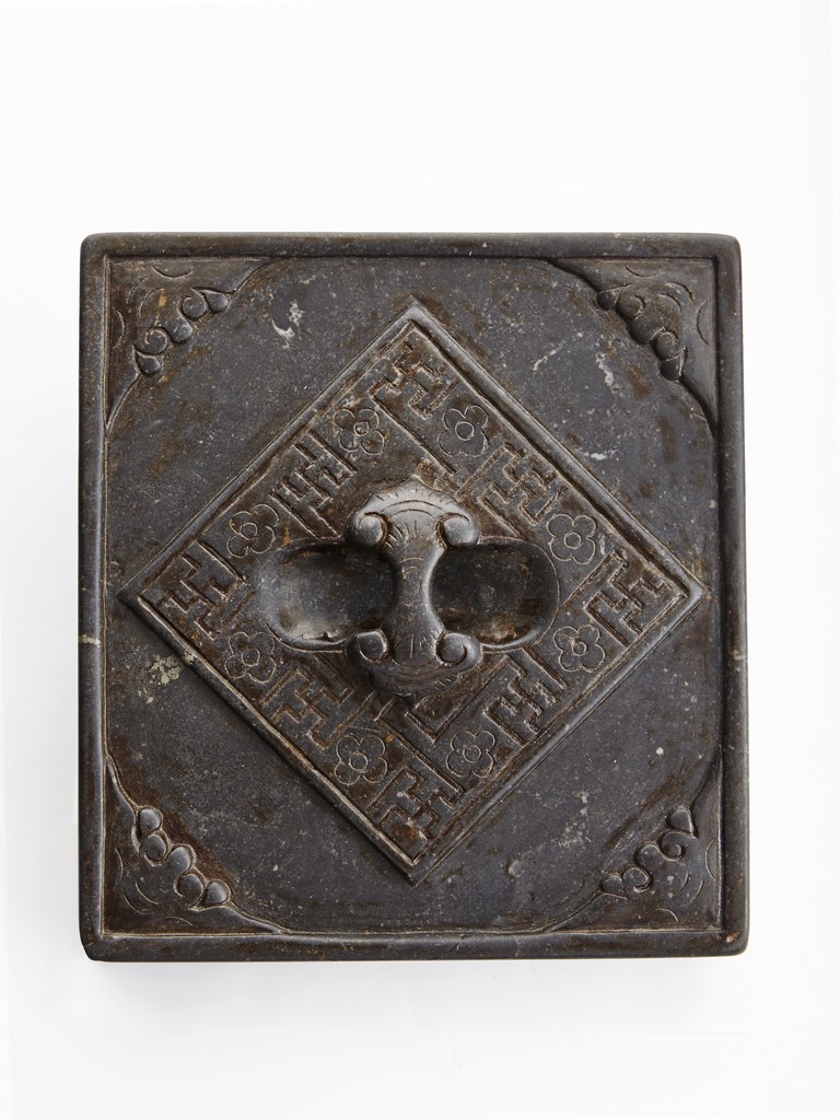 Of square form, the top with a raised handle ruyi head-formed finial on a raised square ground, the four corners with raised motif of auspicious bats. Ming Dynasty period.
