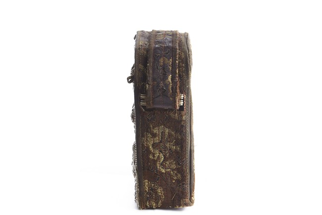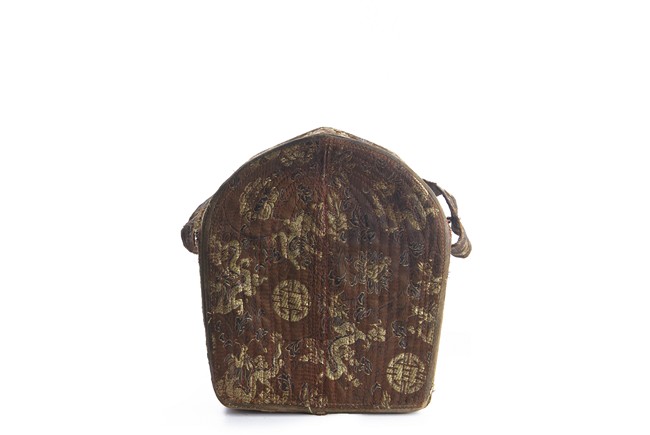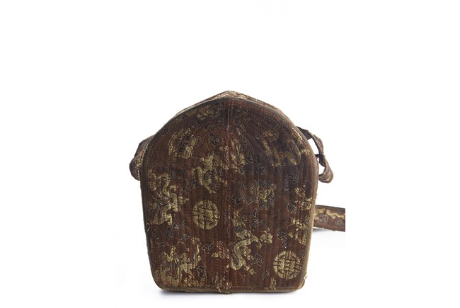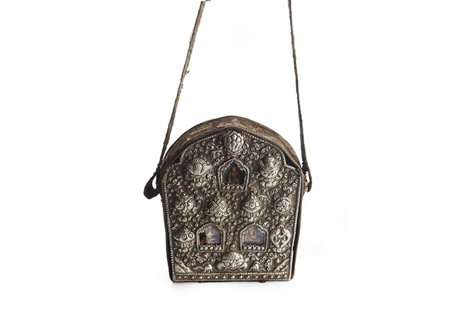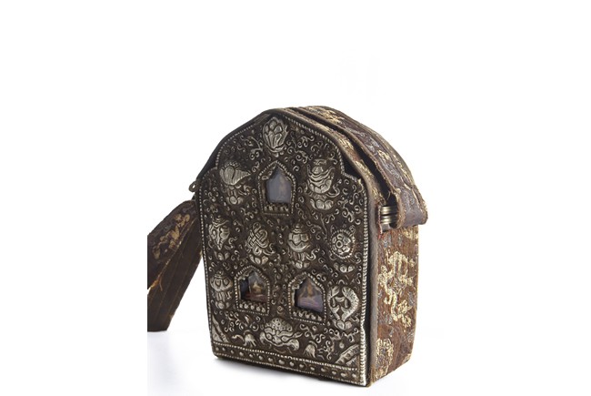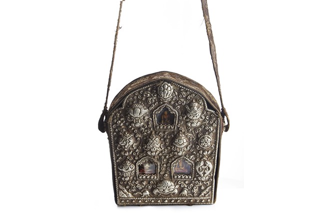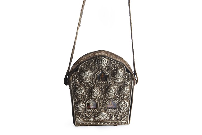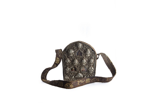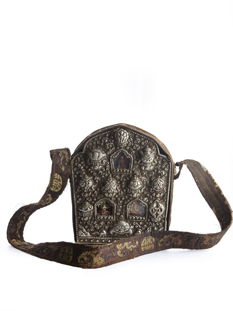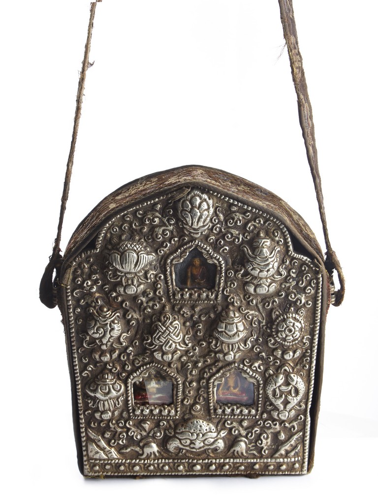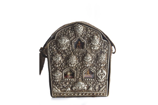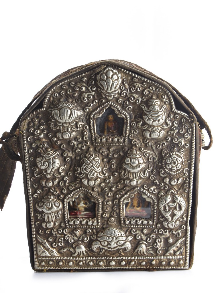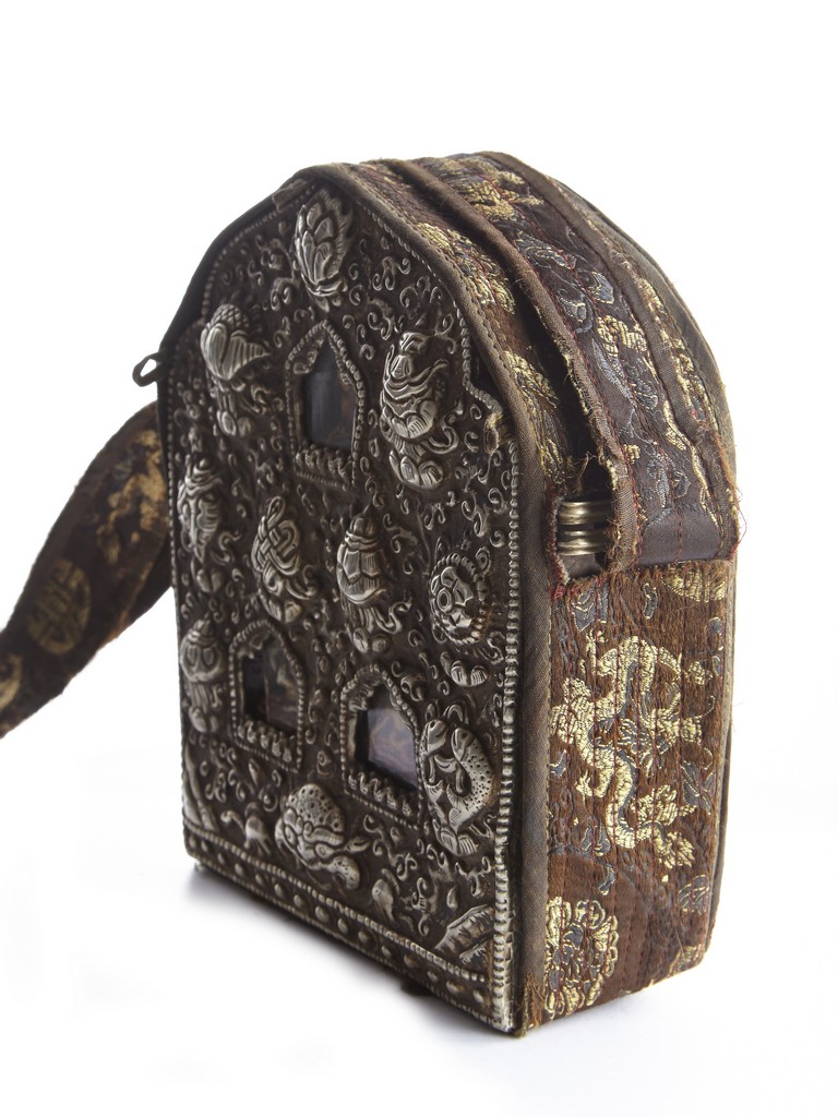 Of lobed outline, the shrine is cast with eight Buddhist emblems, makara, and mythical beast, all raised in relief, surrounding glazed Tibetan Buddhist deities, all covered by cloth carrying cases. Qing Dynasty period.