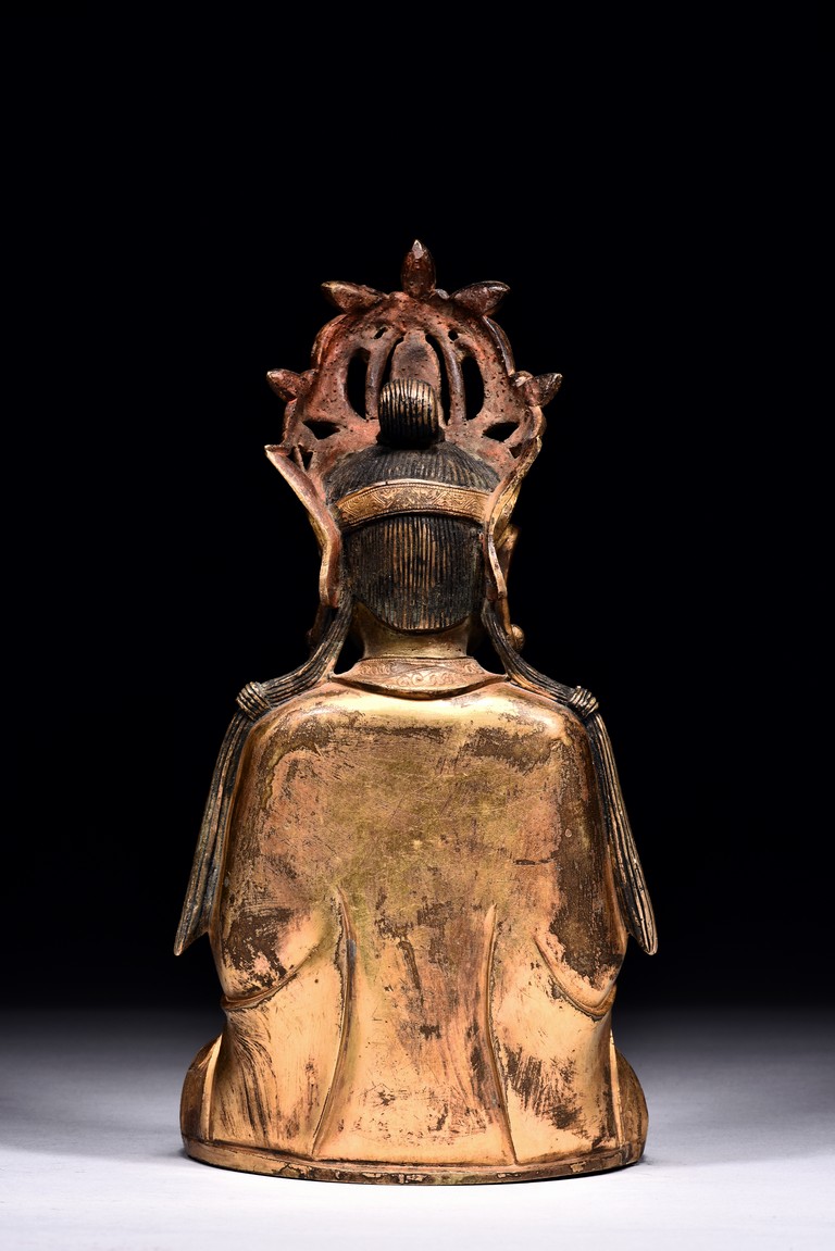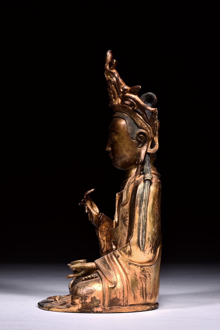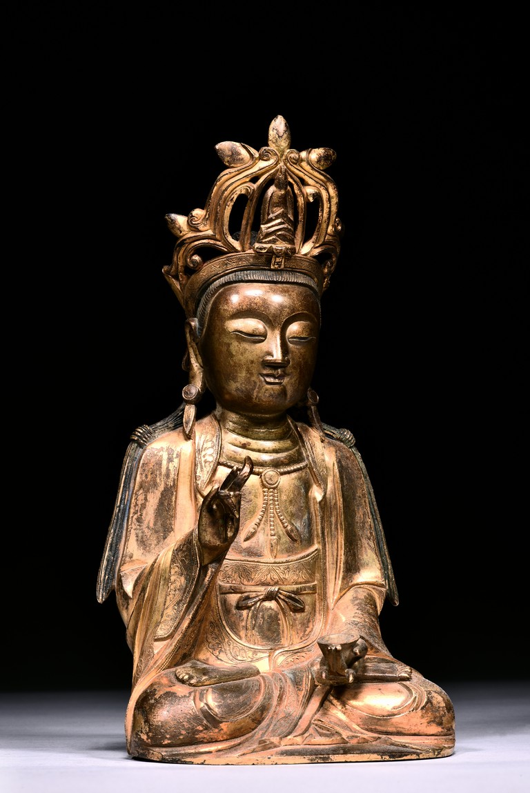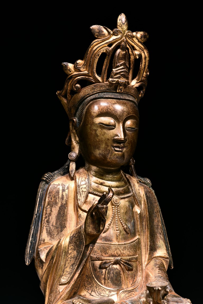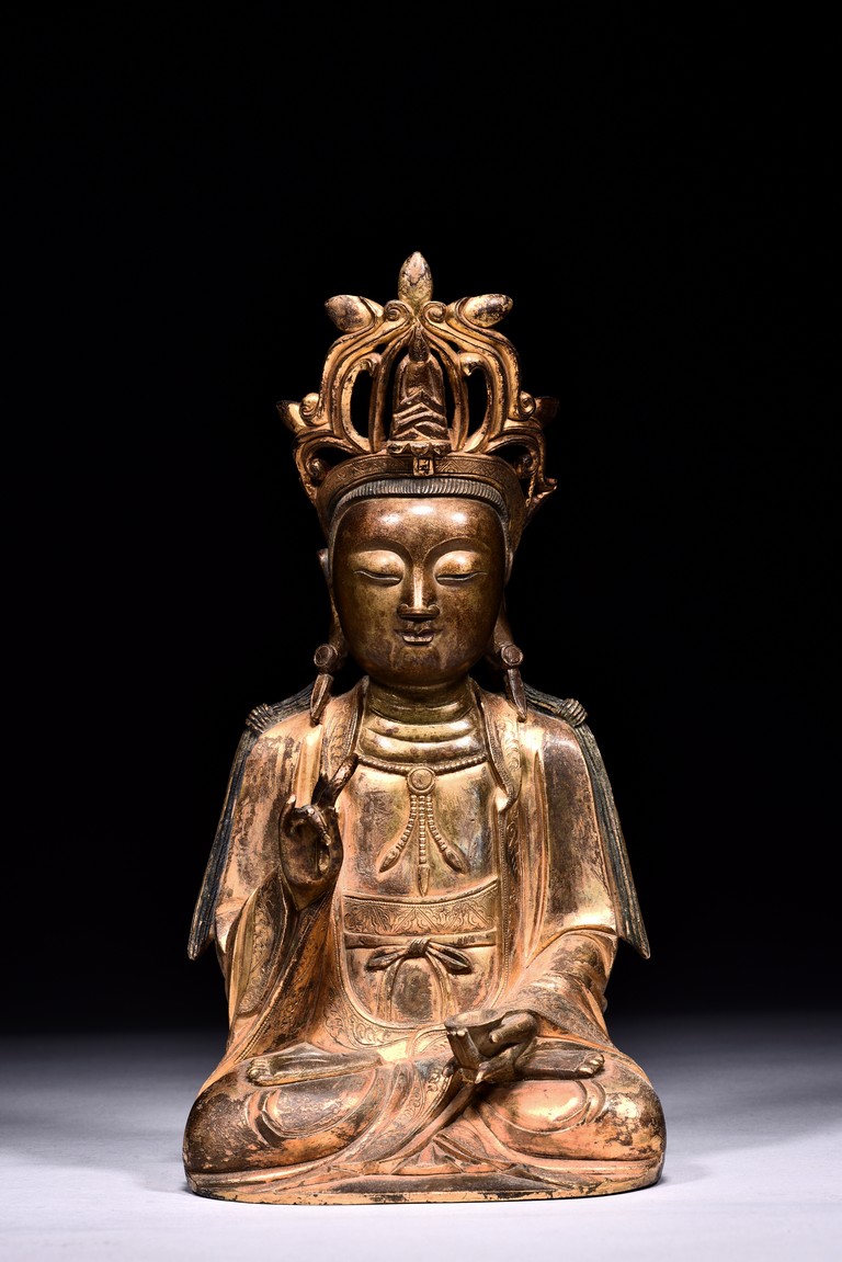 The Avalokitesvara guanyin is shown seated in padmasana, the right hand holding a stem, the left hand holding a cup , wearing robe incised with floral pattern, the face cast with gentle and serene expression, below openwork crown centered by a figure of Amitabha. Early Qing Dynasty period.