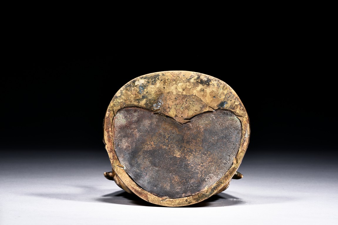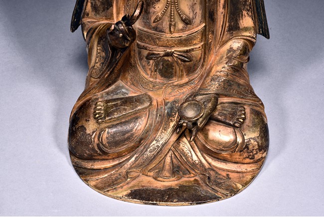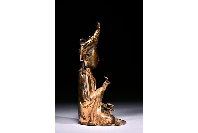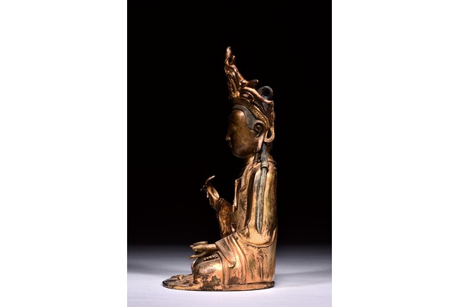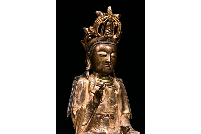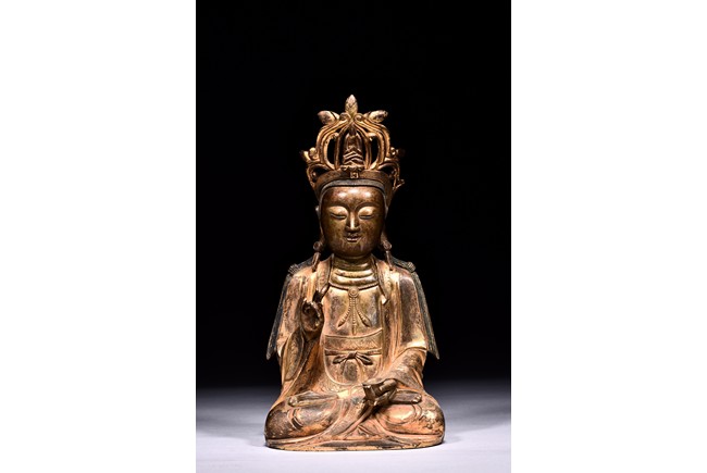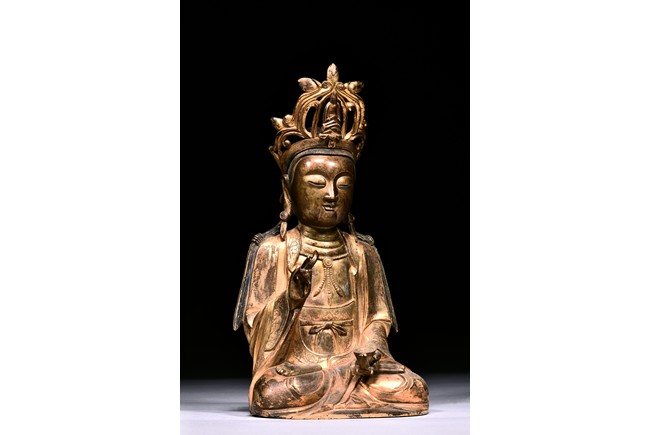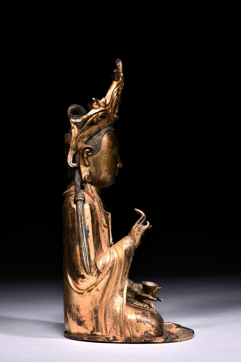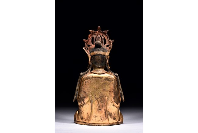 The Avalokitesvara guanyin is shown seated in padmasana, the right hand holding a stem, the left hand holding a cup , wearing robe incised with floral pattern, the face cast with gentle and serene expression, below openwork crown centered by a figure of Amitabha. Early Qing Dynasty period.