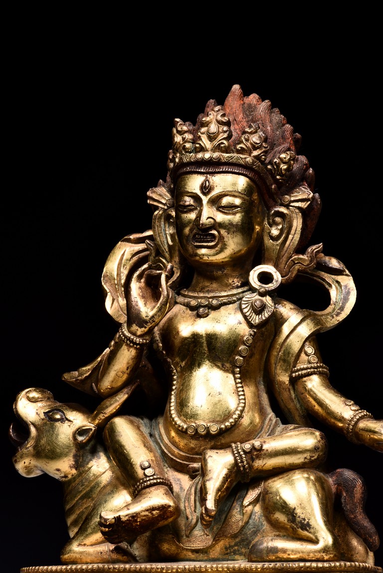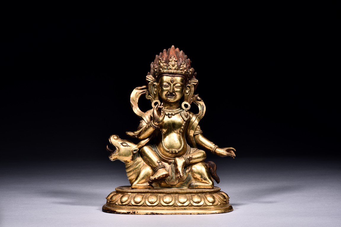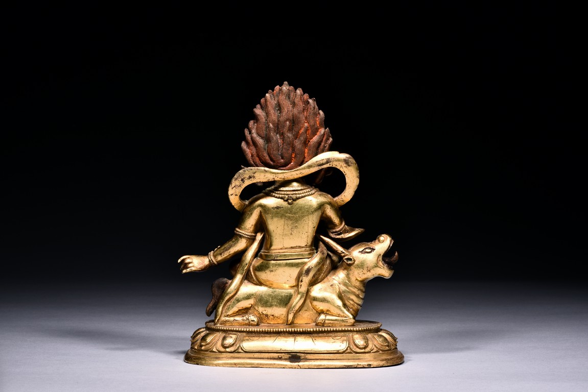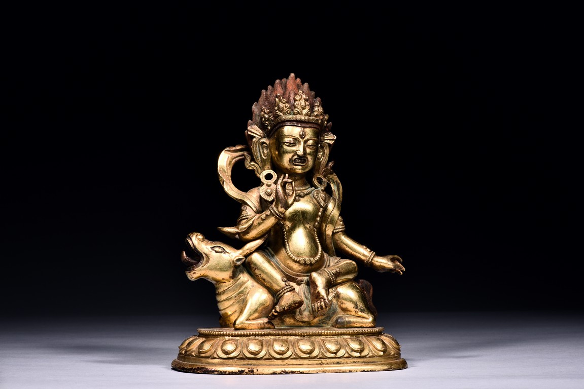 The guardian is shown seated on a recumbent wolf with mouth agape revealing the tongue, the guardian with right hand raised in mutra, wearing beaded necklace falling down to the belly, with billowing scarf around the shoulder, the face with intense expression, below pointed crown and flaming hair, all upon a single lotus throne. Qing Dynasty period