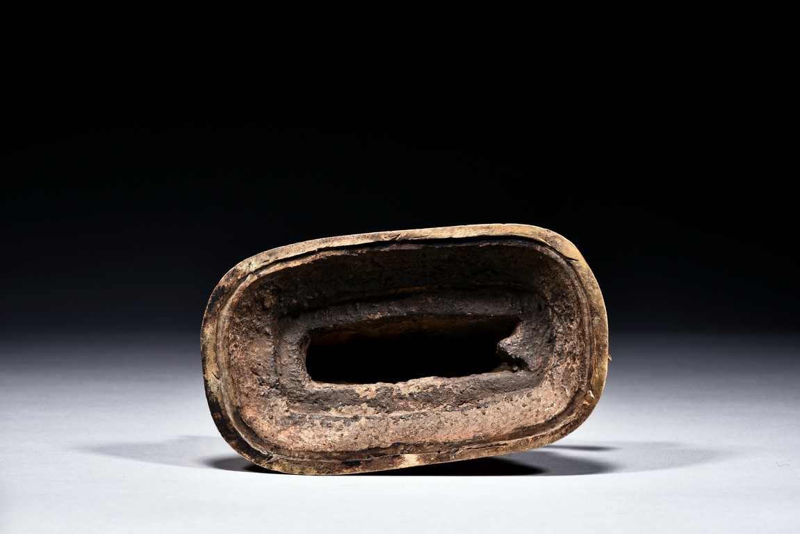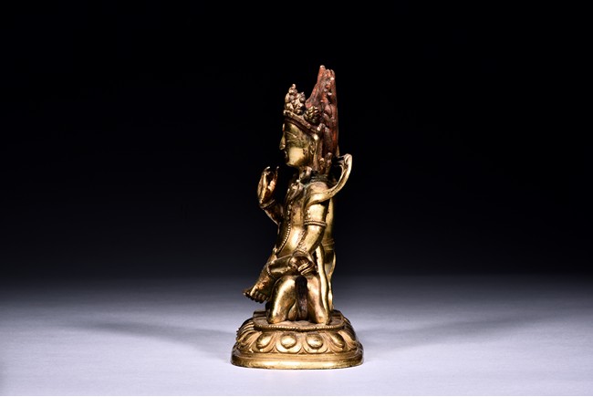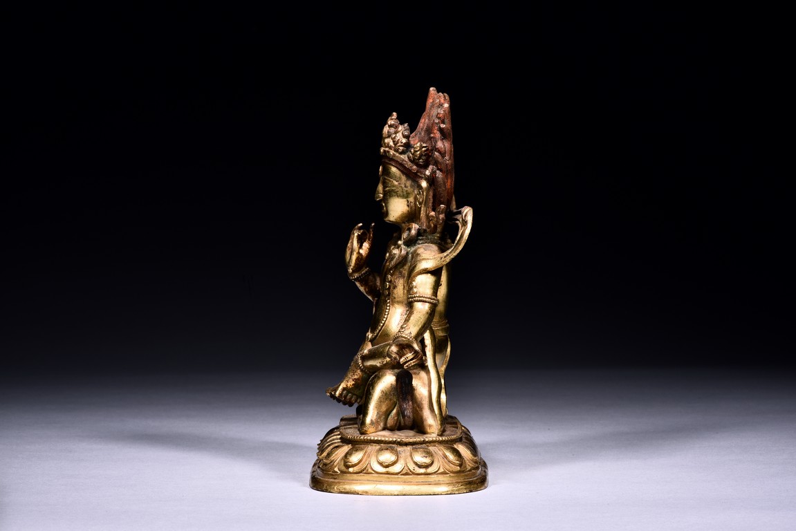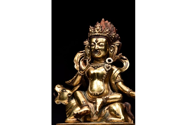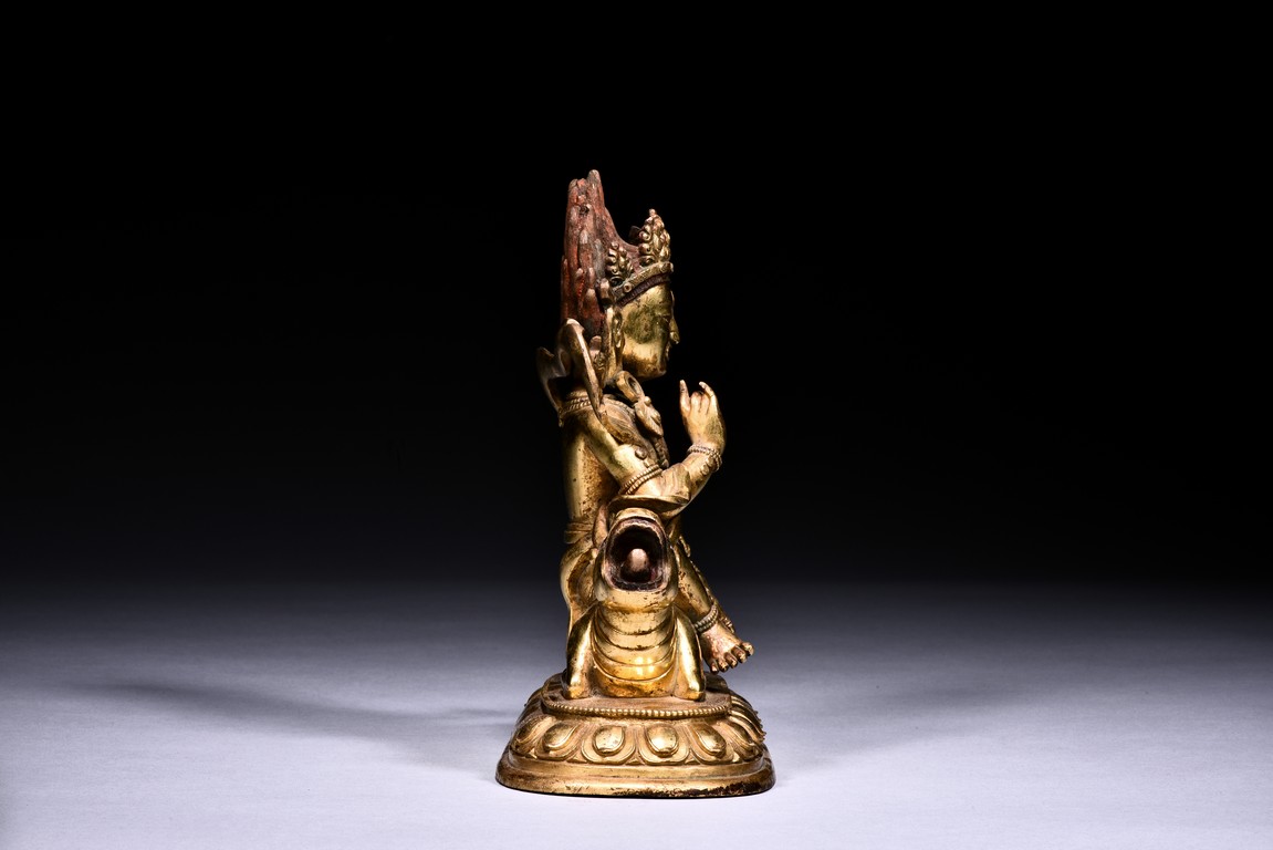 The guardian is shown seated on a recumbent wolf with mouth agape revealing the tongue, the guardian with right hand raised in mutra, wearing beaded necklace falling down to the belly, with billowing scarf around the shoulder, the face with intense expression, below pointed crown and flaming hair, all upon a single lotus throne. Qing Dynasty period