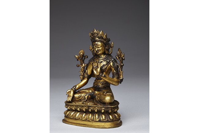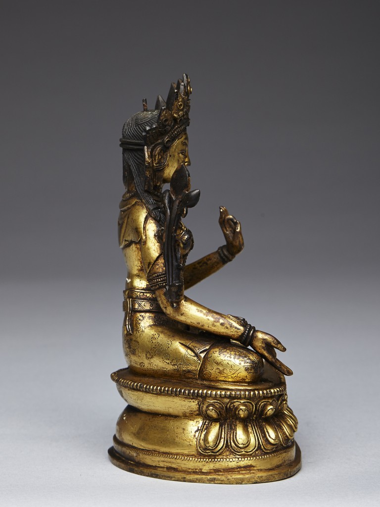 Shown seated in padmasana on double lotus throne, his right hand extended in varada mudra and the left is held in vitarka mudra, body adorned in beaded jewelry and hems incised with floral pattern. His face shown with meditative expression and surmounted with pointed tiara. Qing Dynasty period.