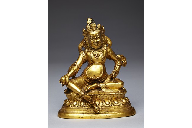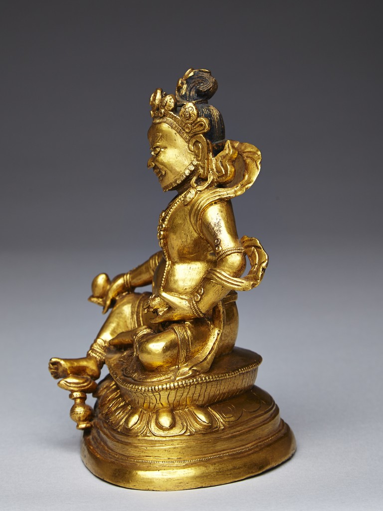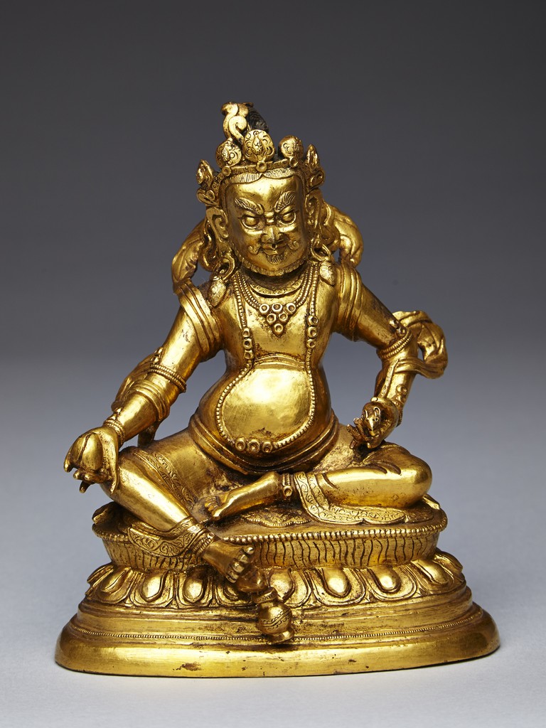 Shown seated in Royal Ease clad in armour and wearing an ornate crown and body jewellery, holding a mongoose in his right hand, a medicinal myrobalan fuit in his left, with his foot resting upon a lotus throne.Qing Dynasty period.