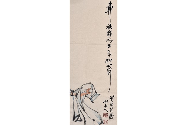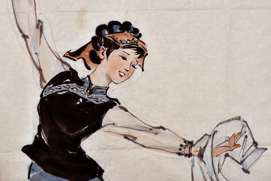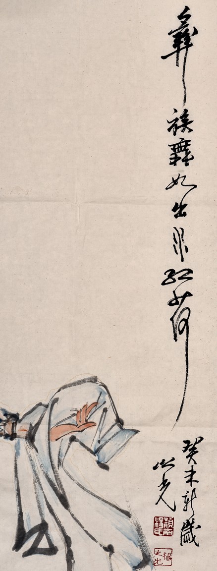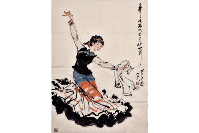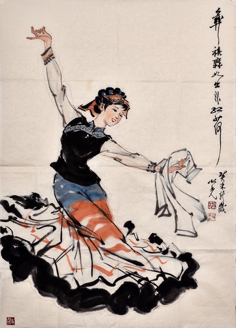 Ink and color on paper. Dancing lady. With artist inscription and signature. Including three seals of the artist. Dated to the year of 2003.