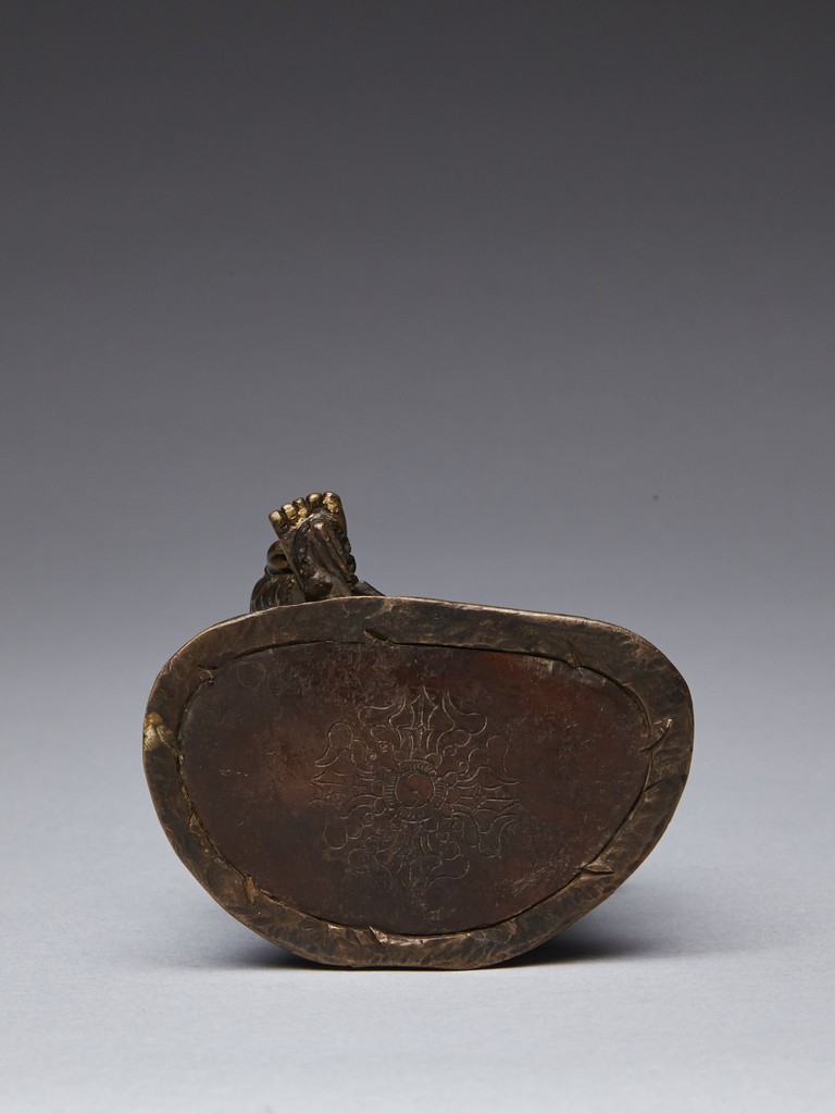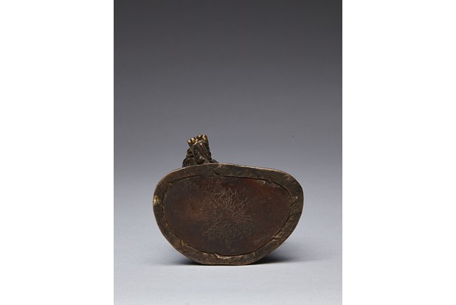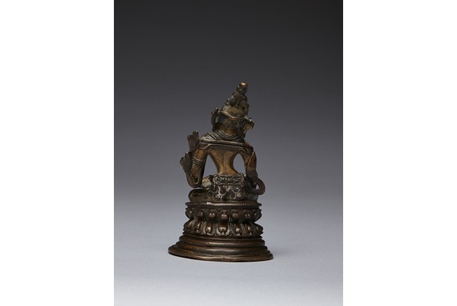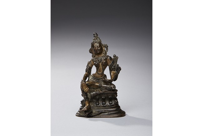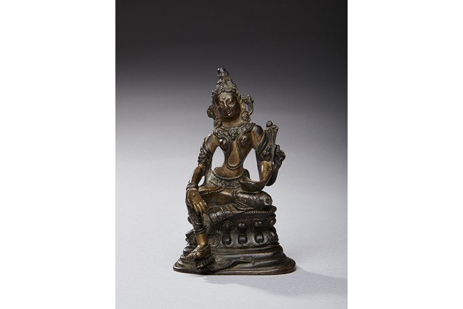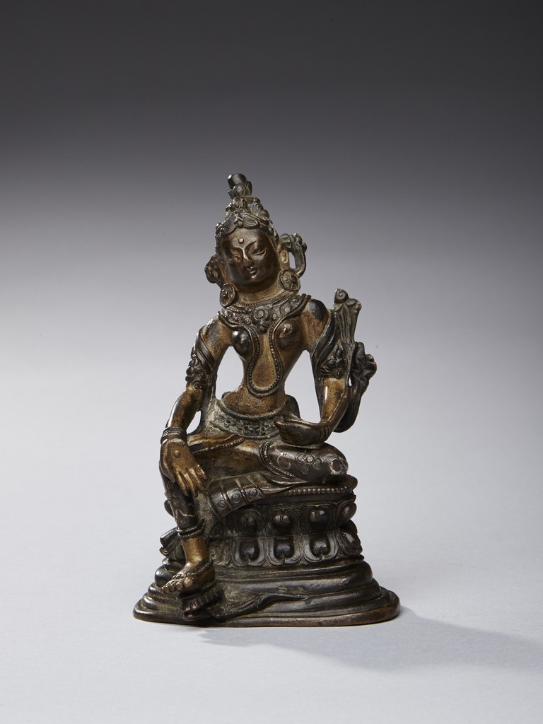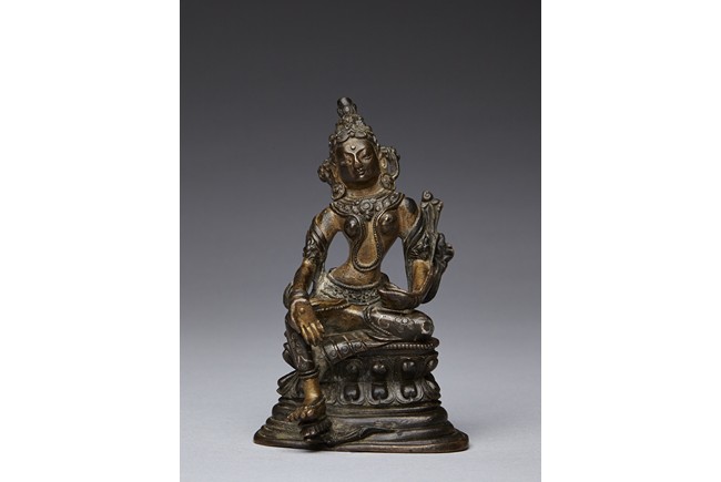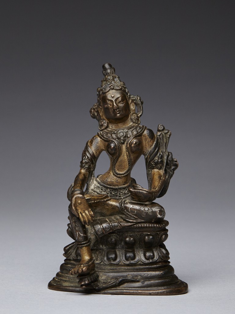 The figure is shown seated in lalitasana with her pendant right foot resting on a lotus, lower body dressed in dhoti secured with a incised belt at the waist, wearing beaded necklace, the hands forming varada mutra, the face with serene expression and crowned with a foliate tiara. 16/17th century.