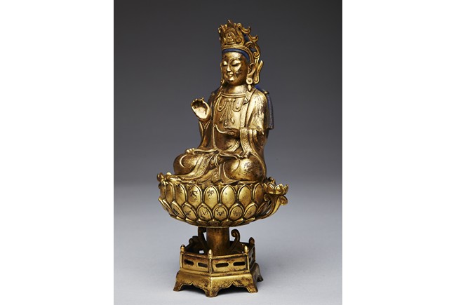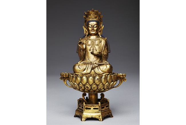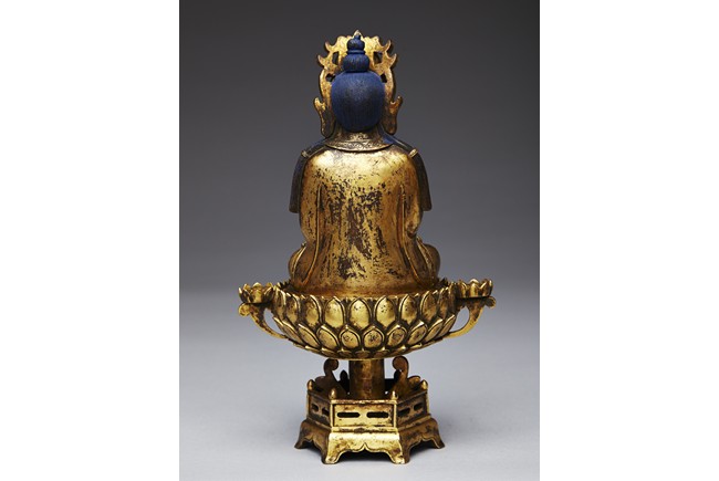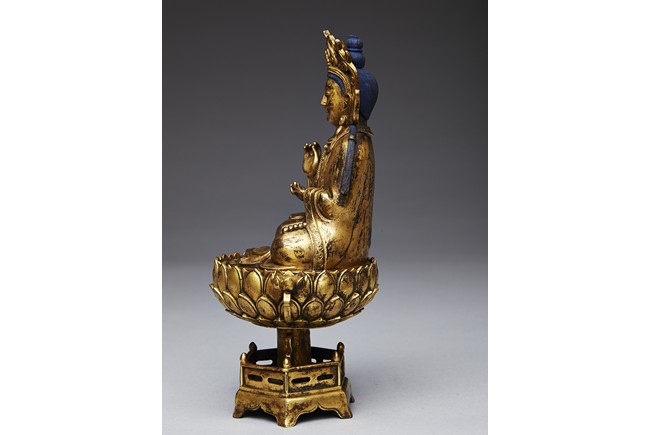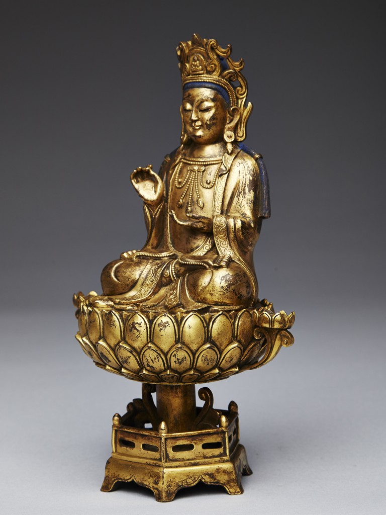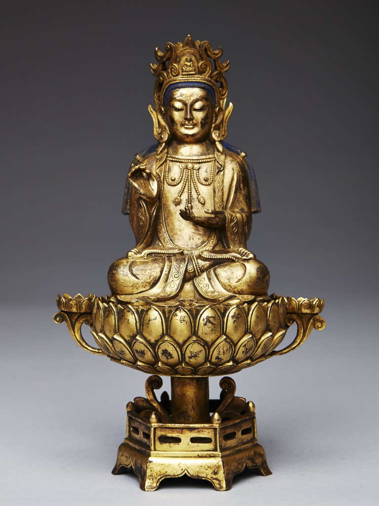 The bodhisattva is shown with hands in vitarka and varada mutra, adorned with beaded jewelry, face with meditative expression and surmounted with an openwork crown enclosing image of Amitabha, seated on a separate lotus base raised on a stem rising from hexagonal stand. Early Qing Dynasty period.
