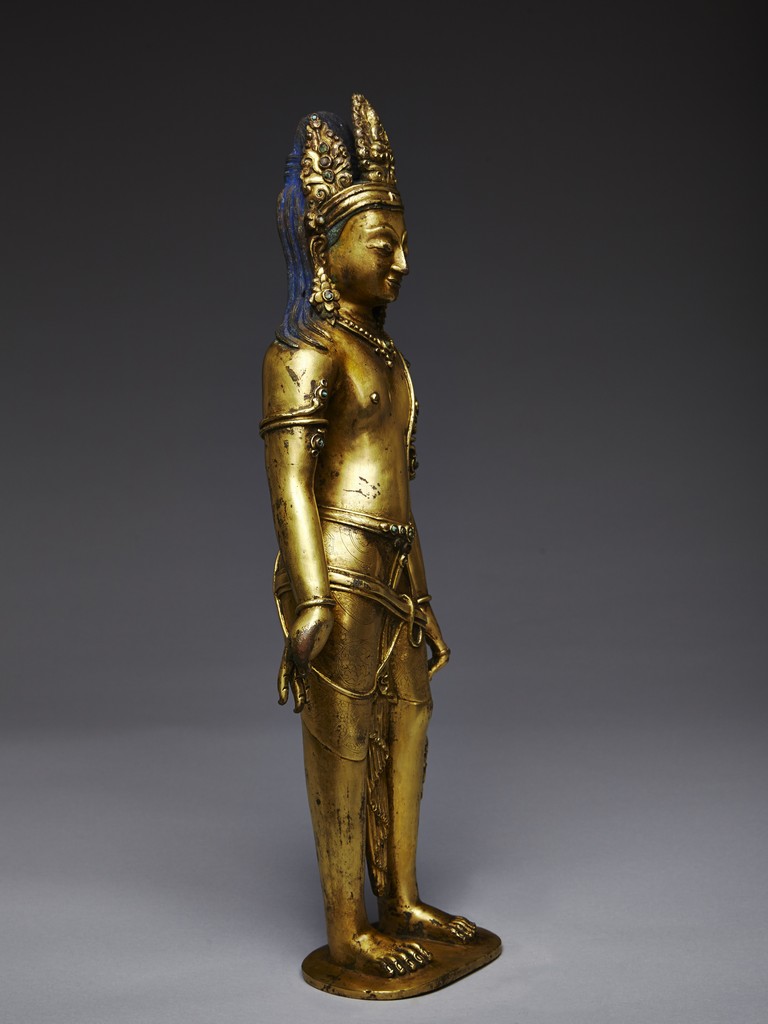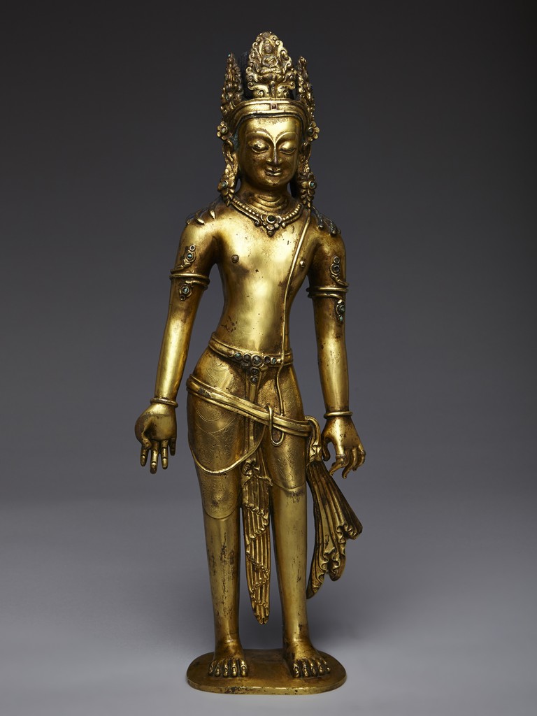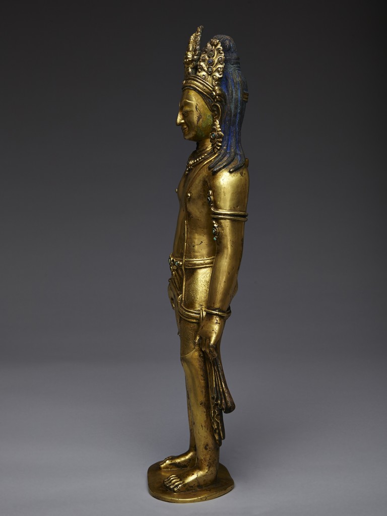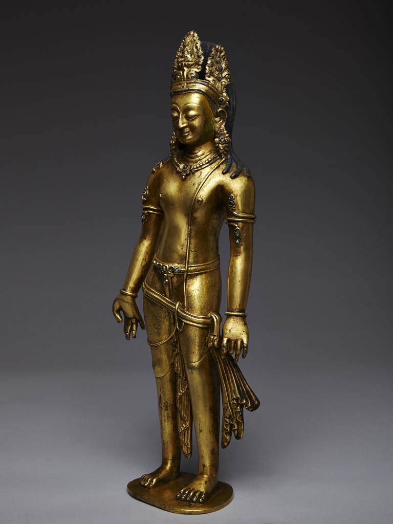 Standing upright in an elegant posture, the bodhisattva is shown with both hands in mutra, dressed in a dhoti incised with floral pattern and secured with belt, adorned with semi-precious turquoise gems . His face is shown with downcast eyes flanked by large adorned earrings, the hair surmounted with a foliate tiara decorated with bodhisattva figure and tied into high chignon. Nepal 17th Century.
