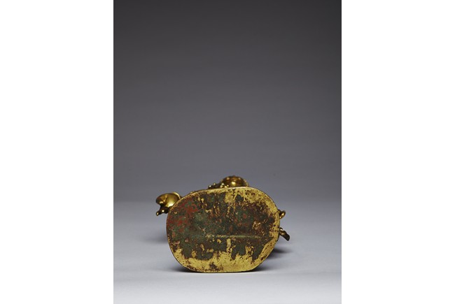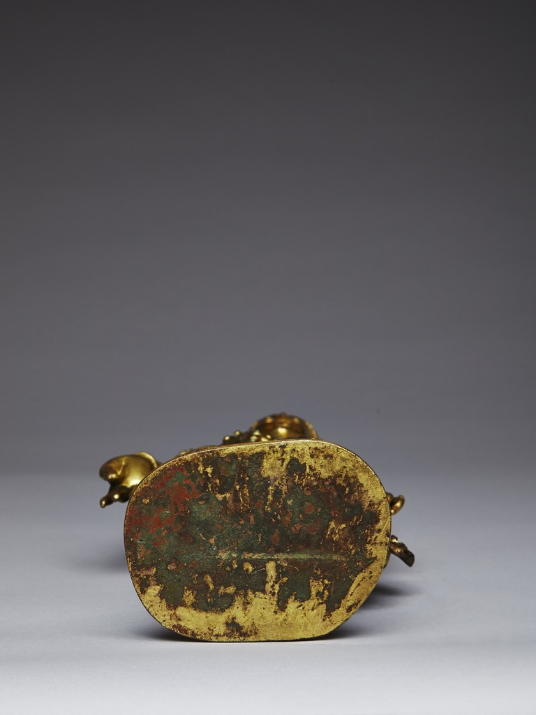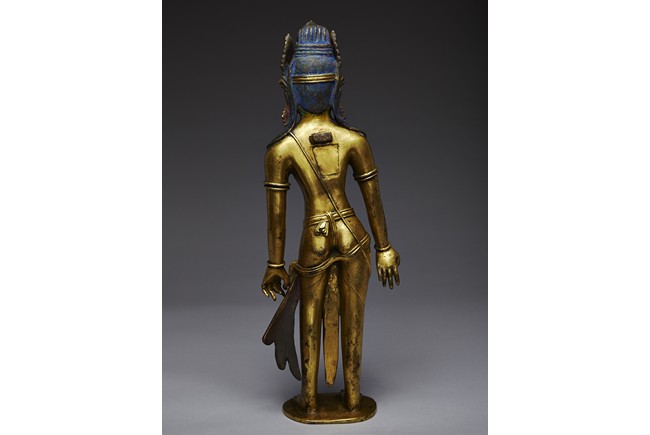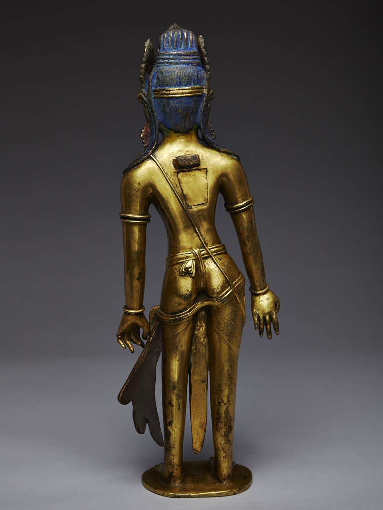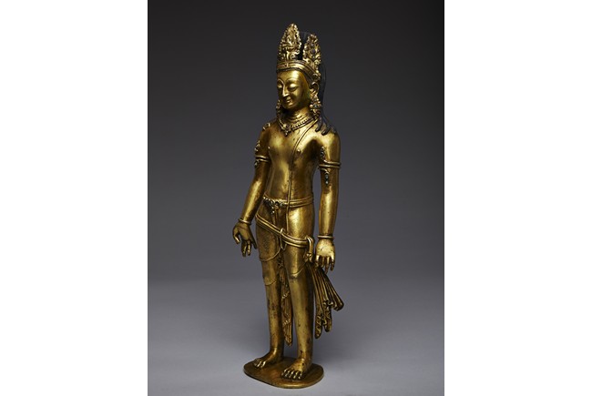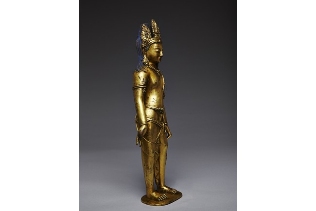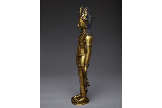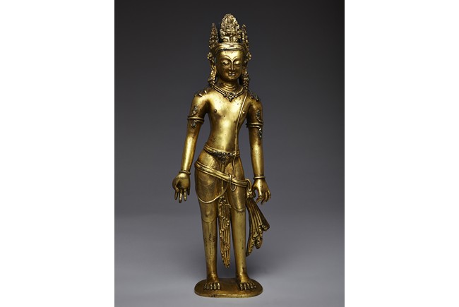 Standing upright in an elegant posture, the bodhisattva is shown with both hands in mutra, dressed in a dhoti incised with floral pattern and secured with belt, adorned with semi-precious turquoise gems . His face is shown with downcast eyes flanked by large adorned earrings, the hair surmounted with a foliate tiara decorated with bodhisattva figure and tied into high chignon. Nepal 17th Century.