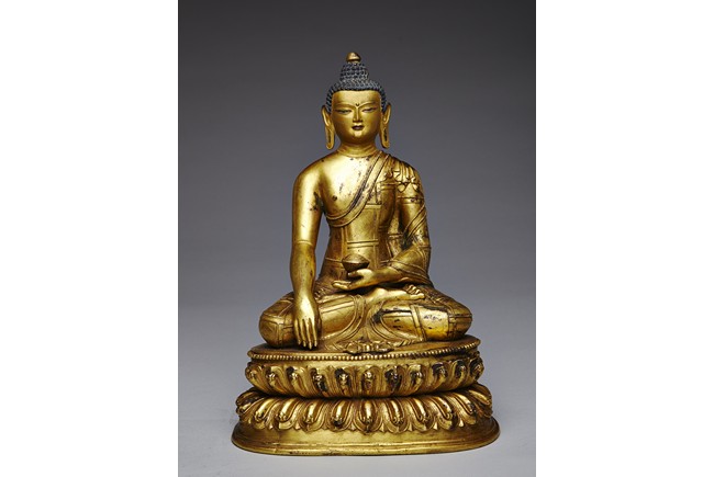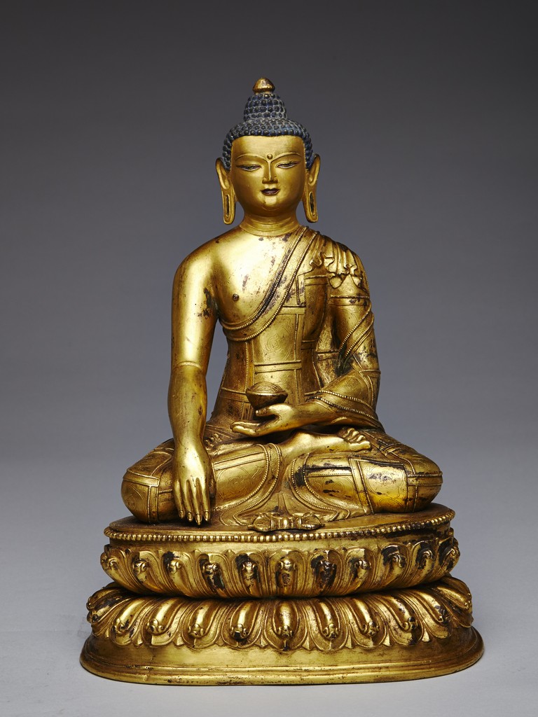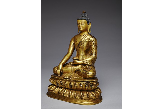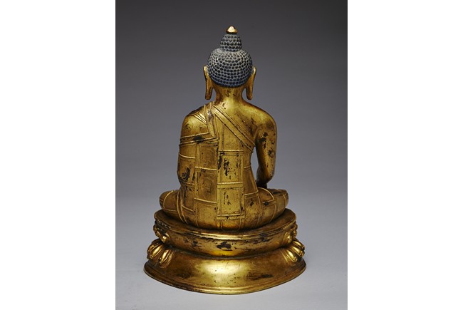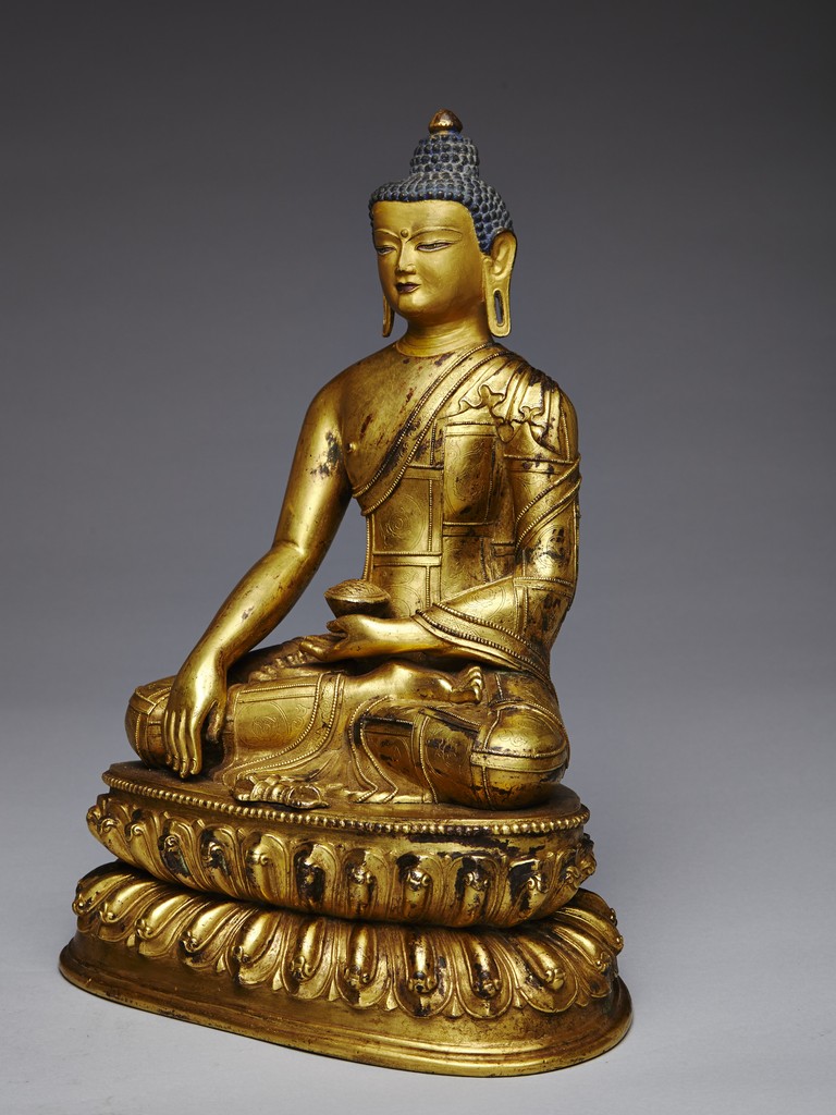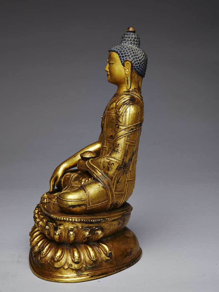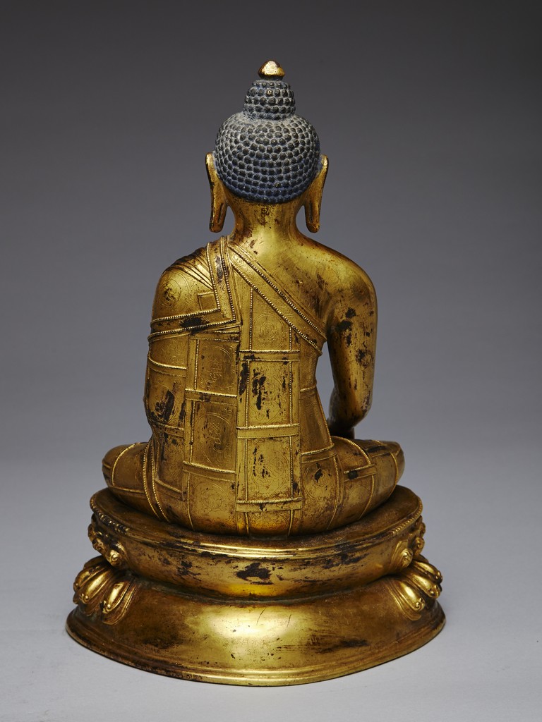 Powerfully cast seated in dhyanasana on a double lotus throne with beaded rims, the bodhisattva's hands in bhumisparsha mutra and dyhana mudra, wearing a long flowing robe draped over his left shoulder and overall incised with scrolled floral pattern within beaded borders, his face with elongated eyes and serene expression, flanked by two pendulous earlobes, hair tied into a high ushinisha, the back of the throne incised with inscriptions. Qing Dynasty period.