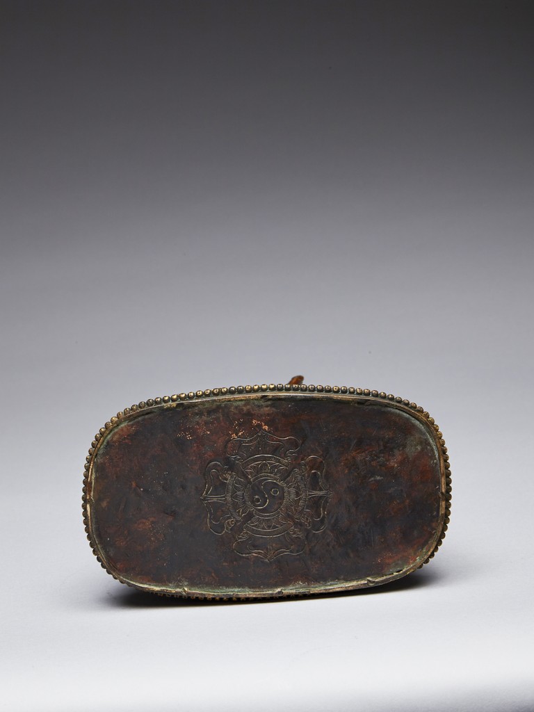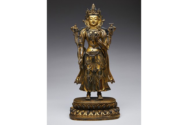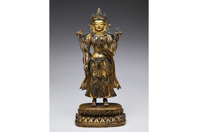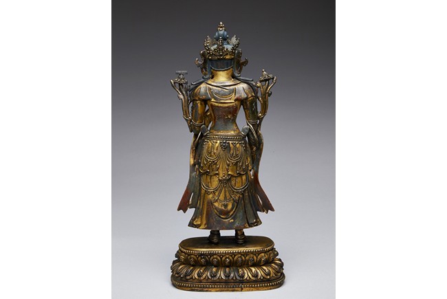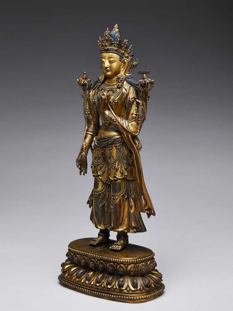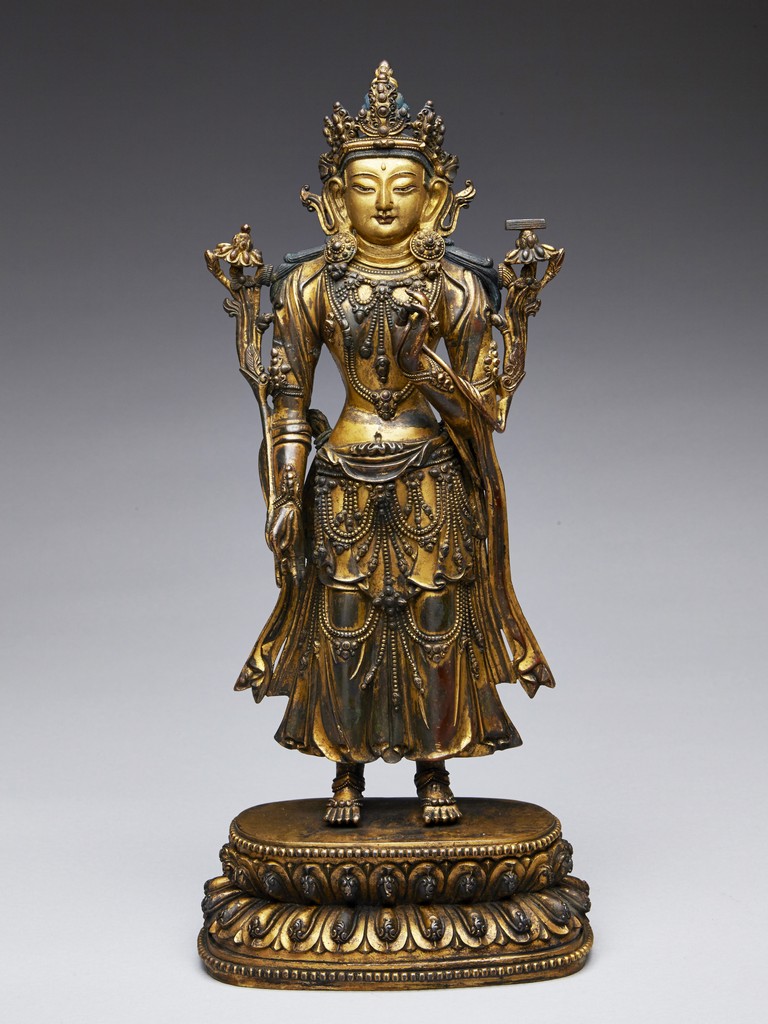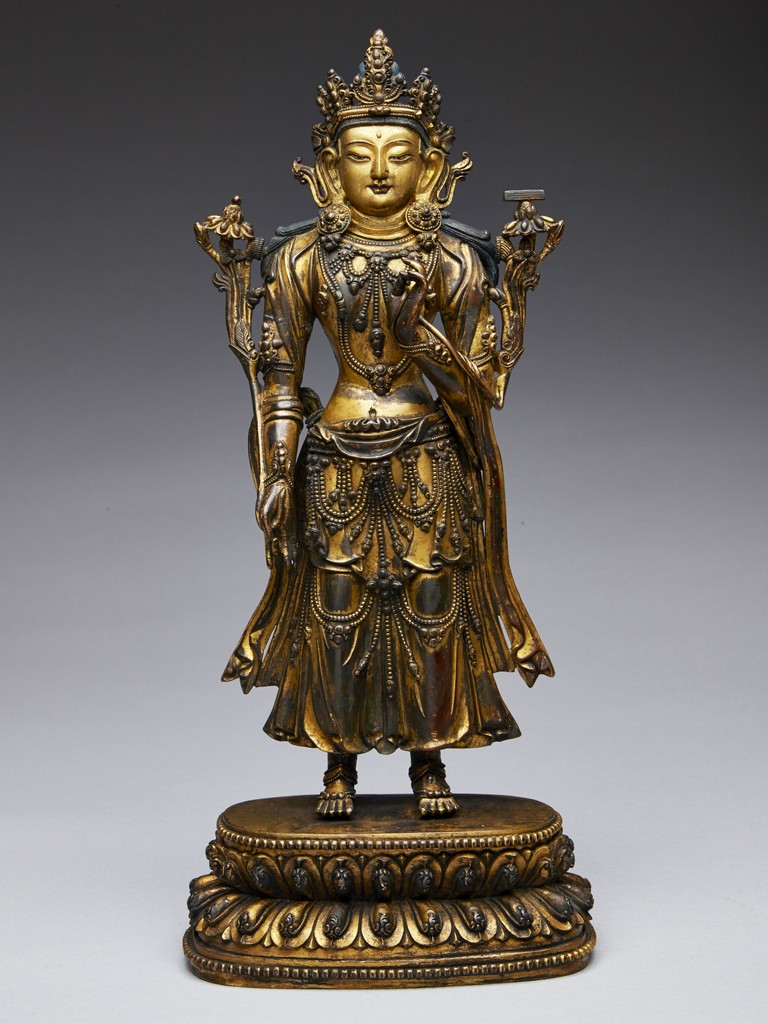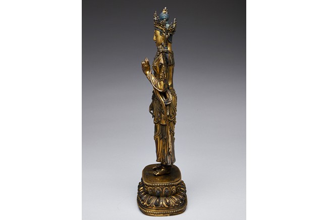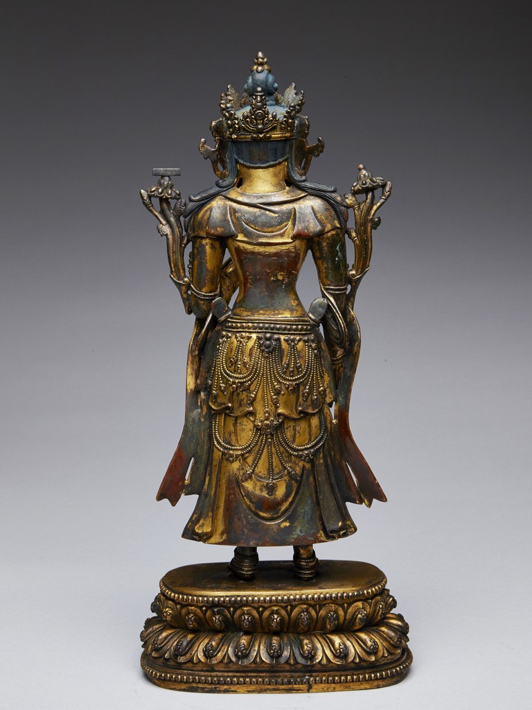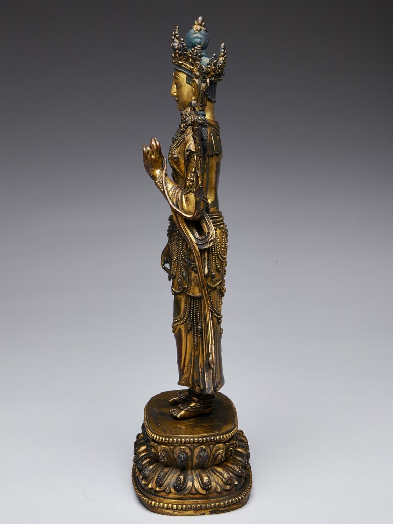 The bodhisattva is shown standing upon a double lotus throne, his hands in vitarka mudra, holding the stem of lotus rising to blossom at shoulder. Wearing dhoti and adorned with various beaded jewelry, his face is shown with benevolent expression and surmounted by pointed tiara and tied into a high chignon. Qing Dynasty period.