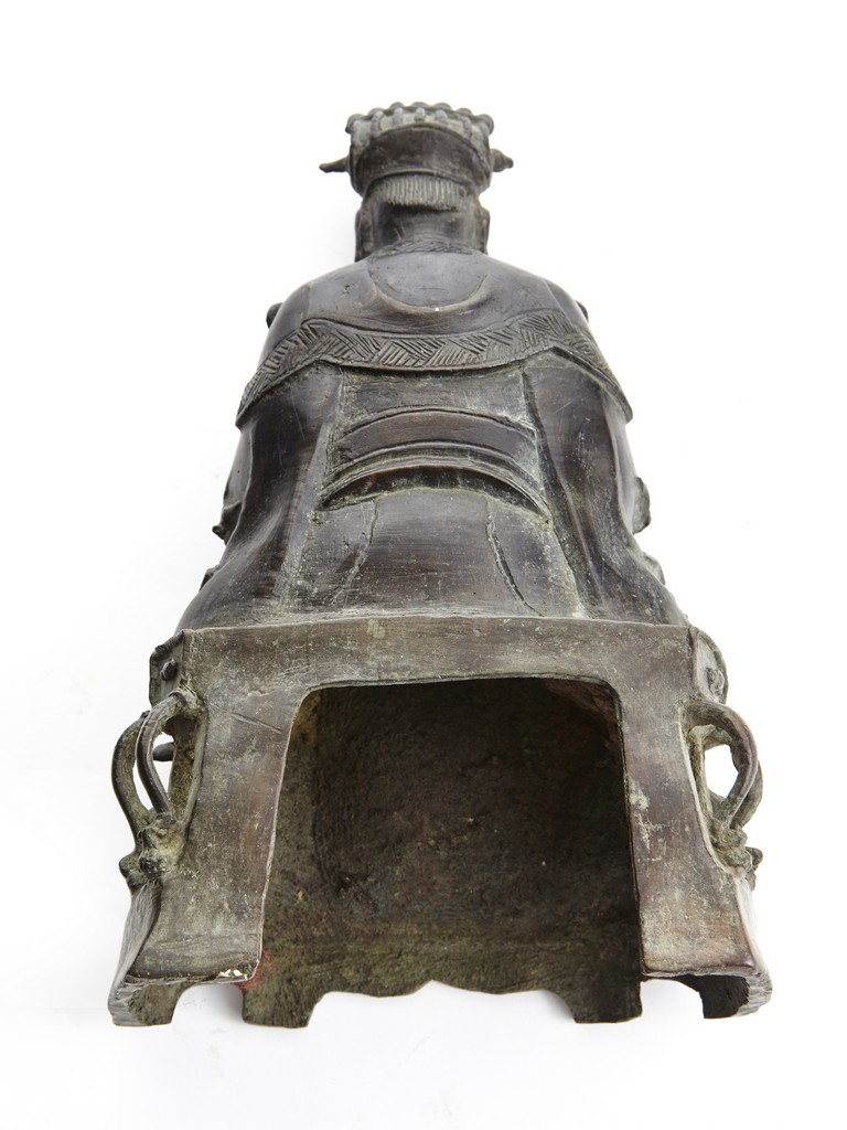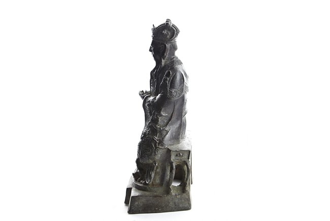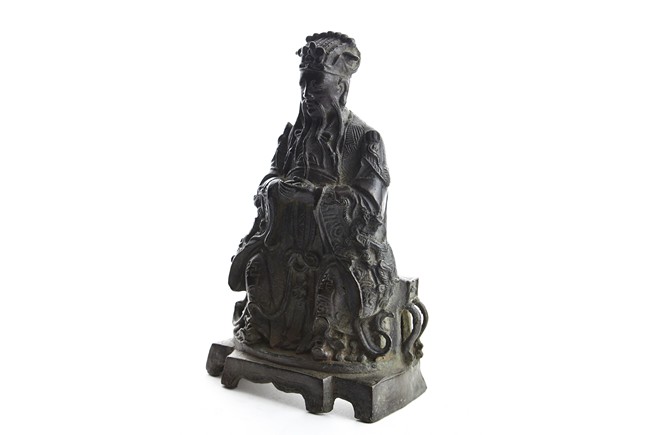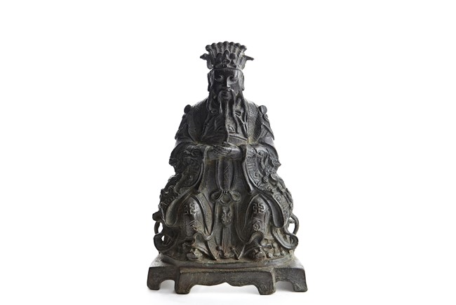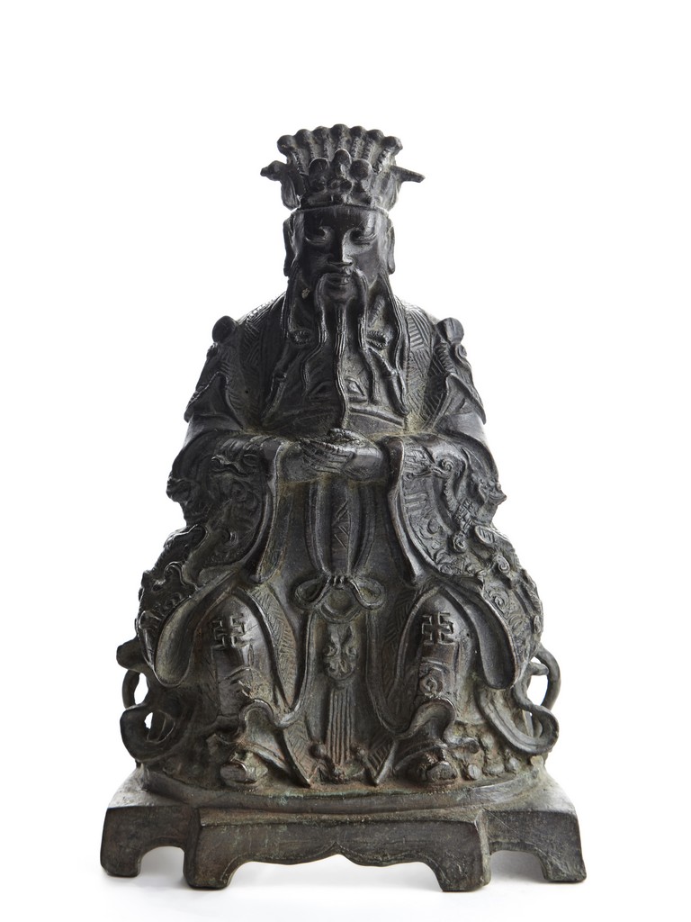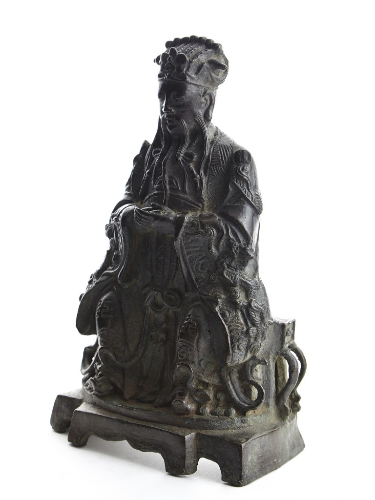 The immortal is cast seated with both hands clasped together in front of his chest, wearing a long flowing robe with decorations, his face with calm expression, long moustache and beard, surmounted with a high court hat. Ming or Early Qing Dynasty period.