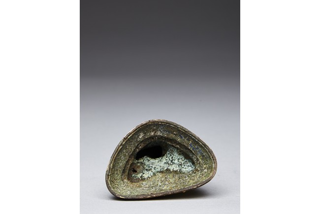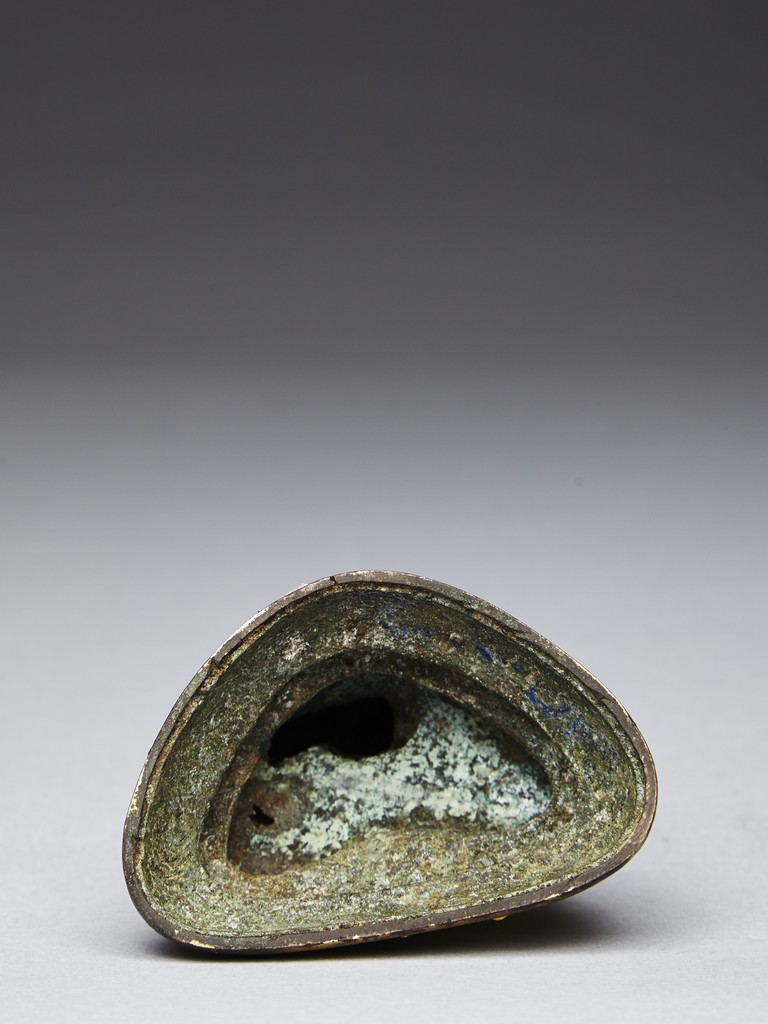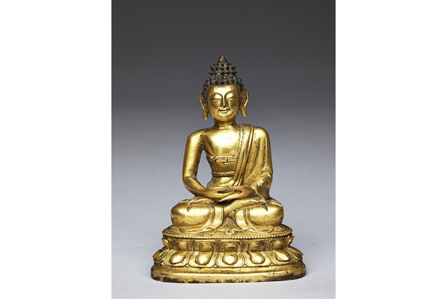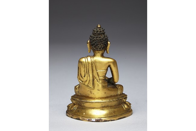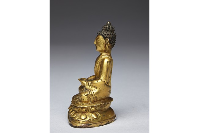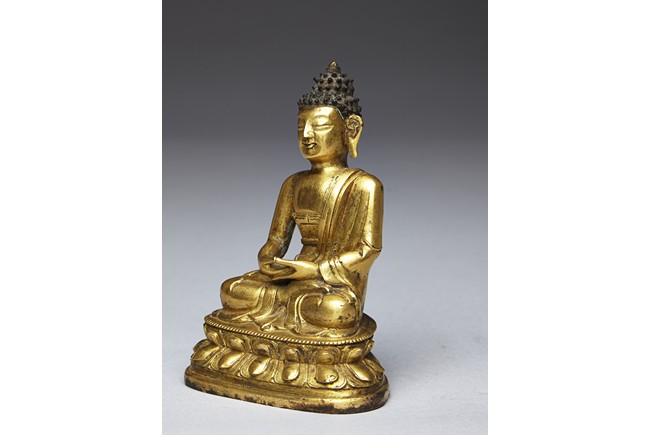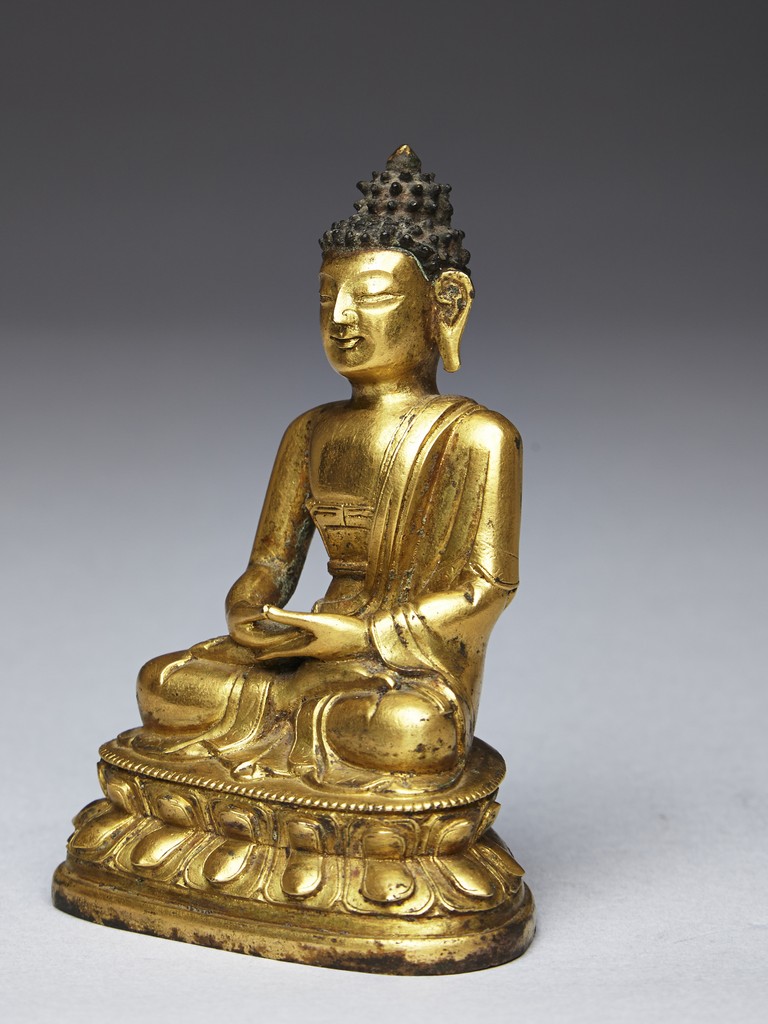 Shown seated on a double lotus throne in dhyanasana with both hands together, wearing robe falling over left shoulder, the face with serene expression and flanked by large earlobes, the hair tied into high chignon. Qing Dynasty period.