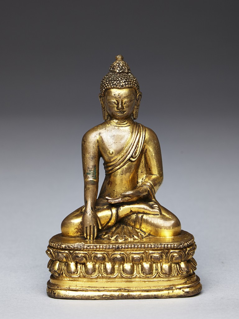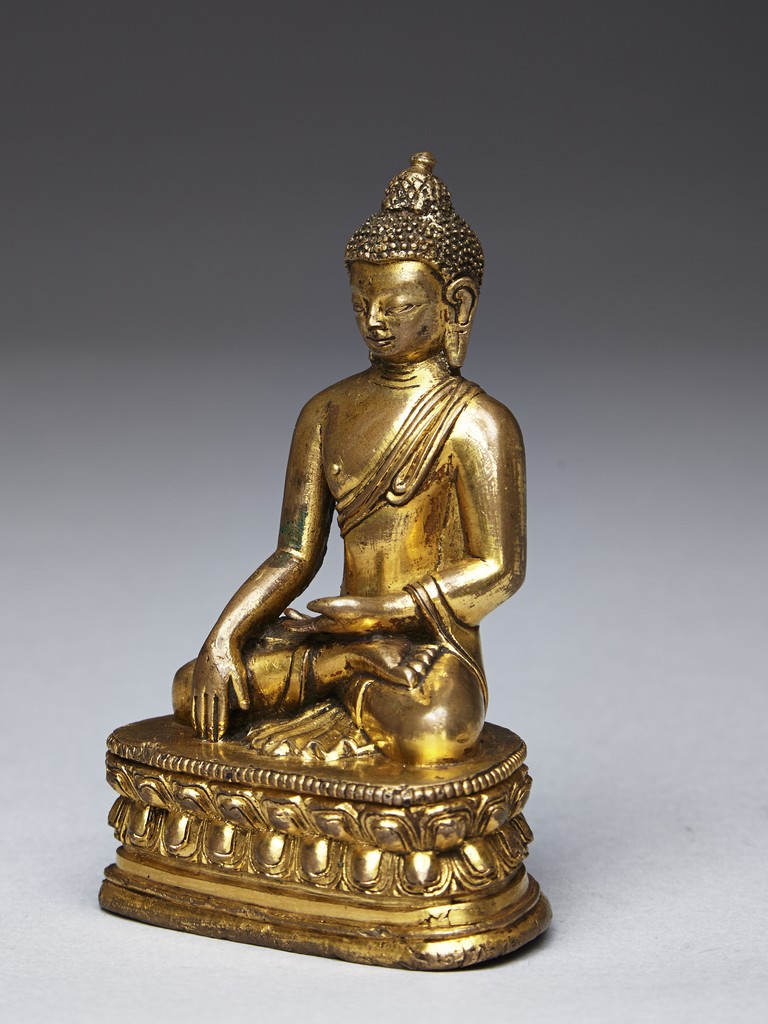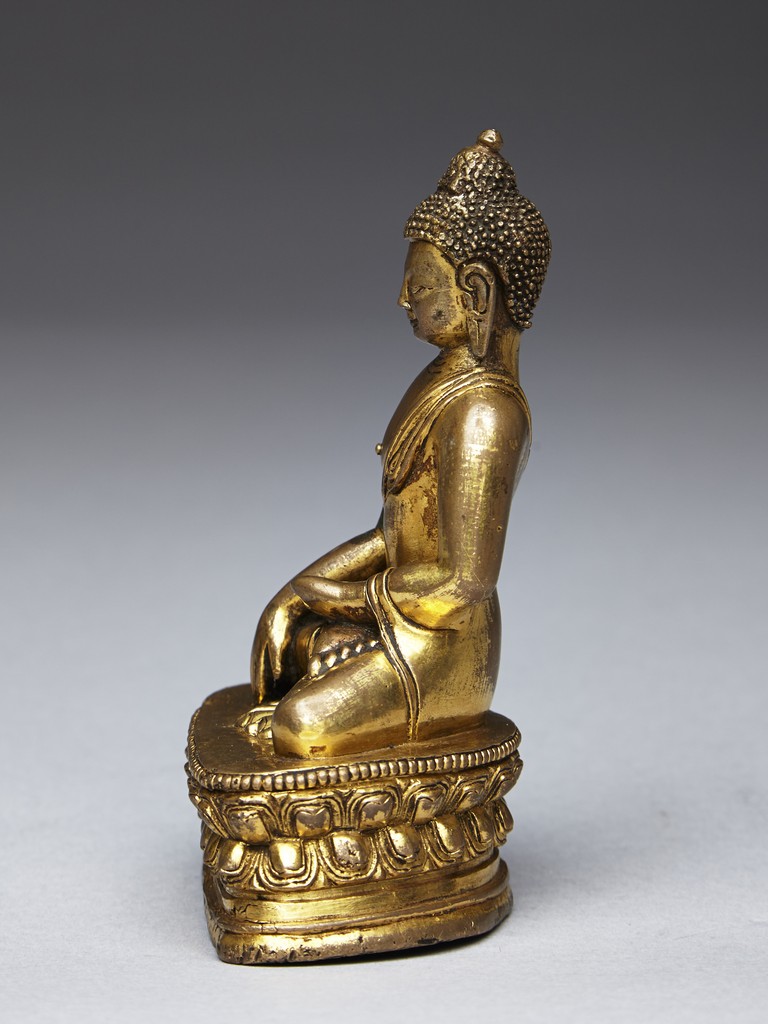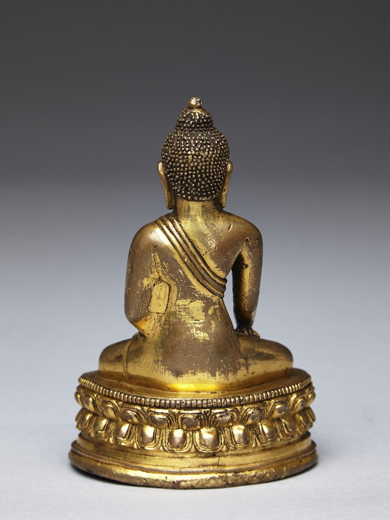 Seated in dhyanasana on a double-lotus base, his hands in bhumisparsa mudra, wearing dhoti with draped over the left shoulder, the face with elongated eyes flanked by pendulous earlobes and surmounted by a prominent ushnisha, the base sealed and incised with a double-vajra. 17th Century.