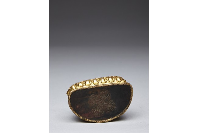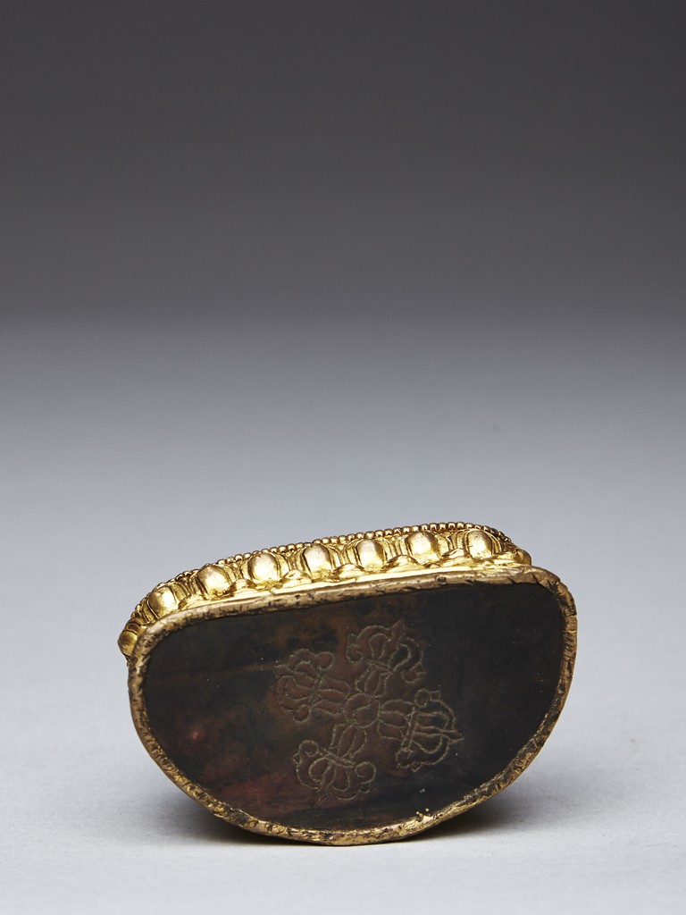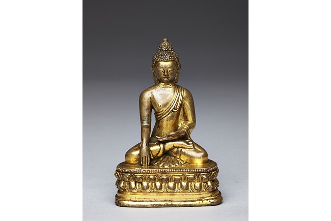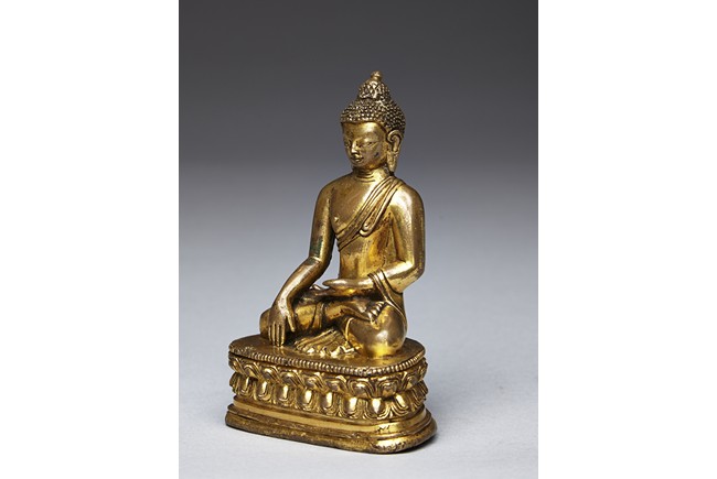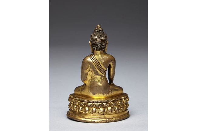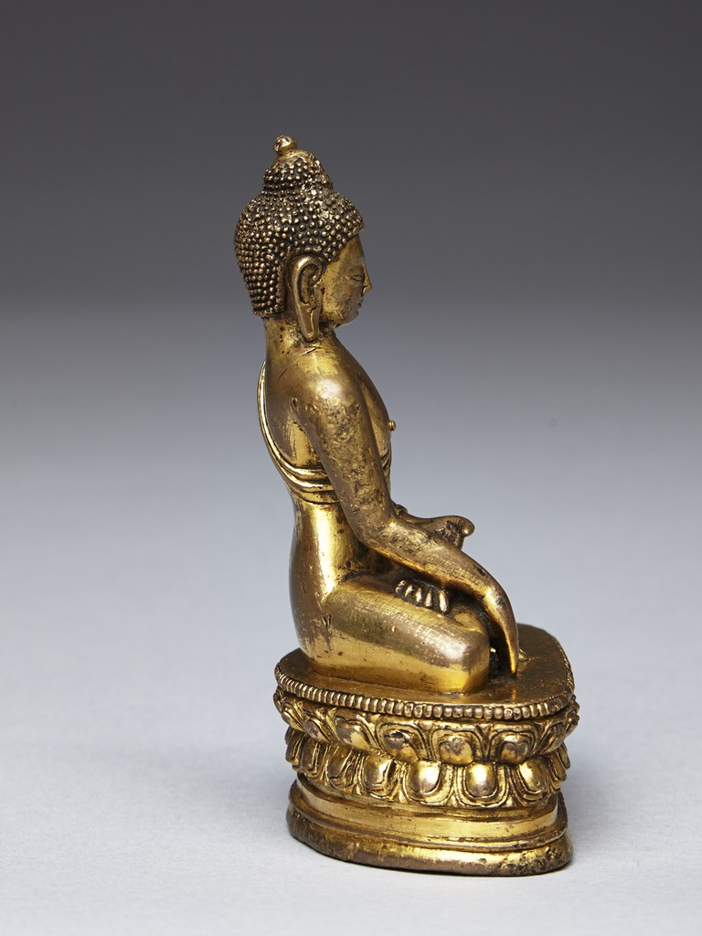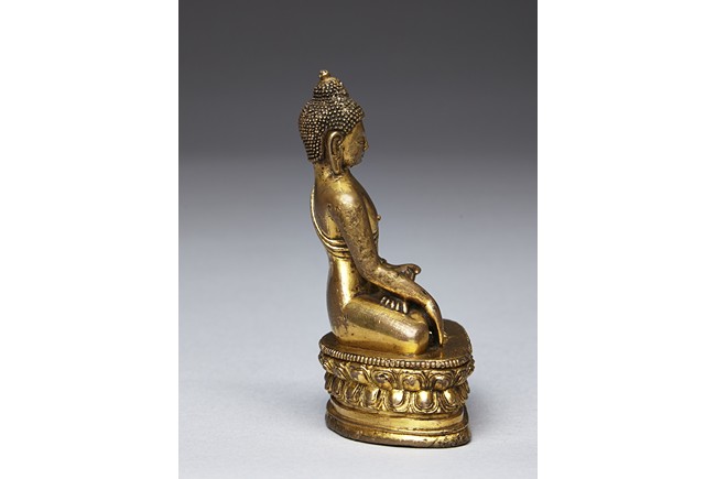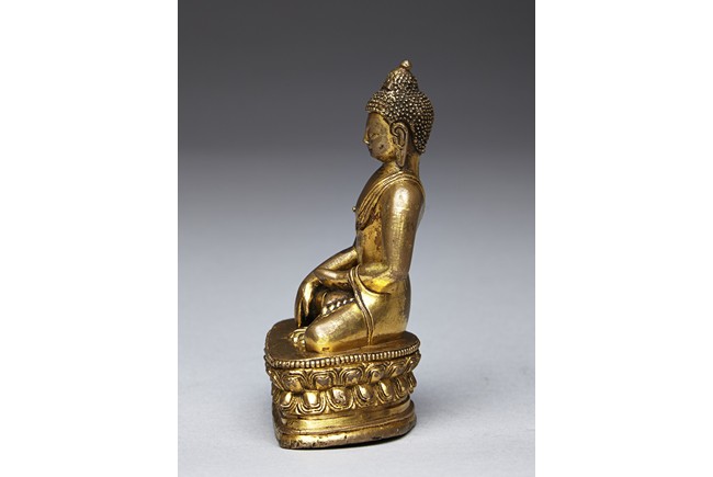 Seated in dhyanasana on a double-lotus base, his hands in bhumisparsa mudra, wearing dhoti with draped over the left shoulder, the face with elongated eyes flanked by pendulous earlobes and surmounted by a prominent ushnisha, the base sealed and incised with a double-vajra. 17th Century.