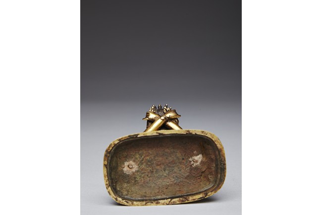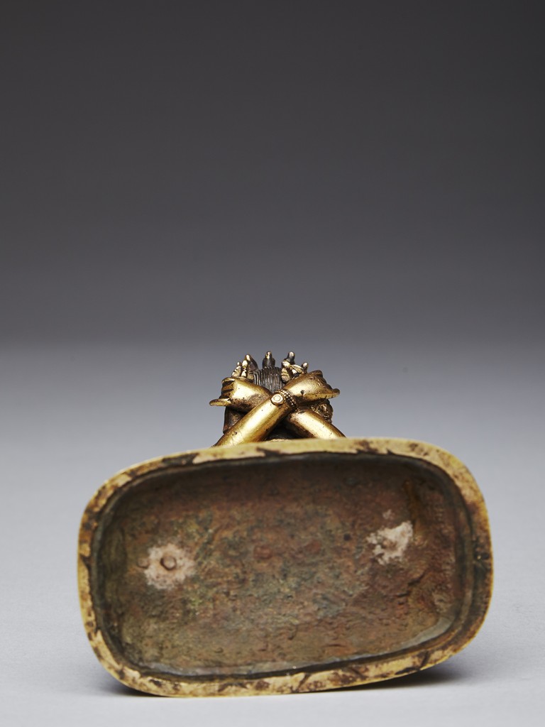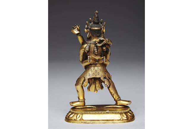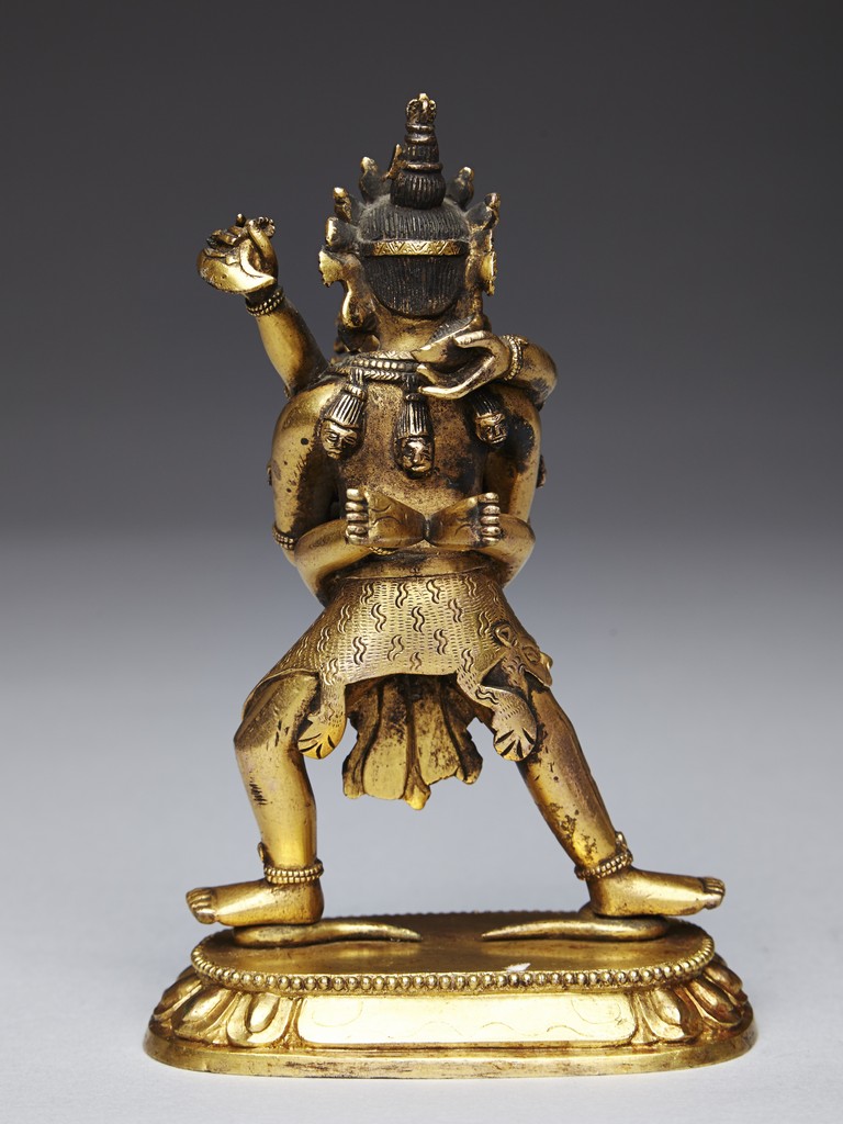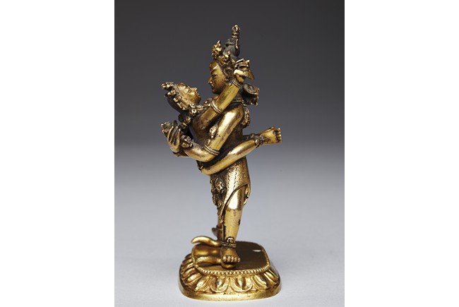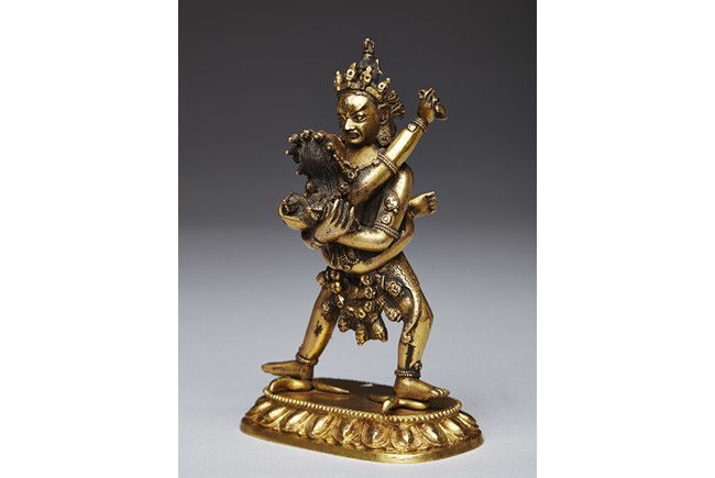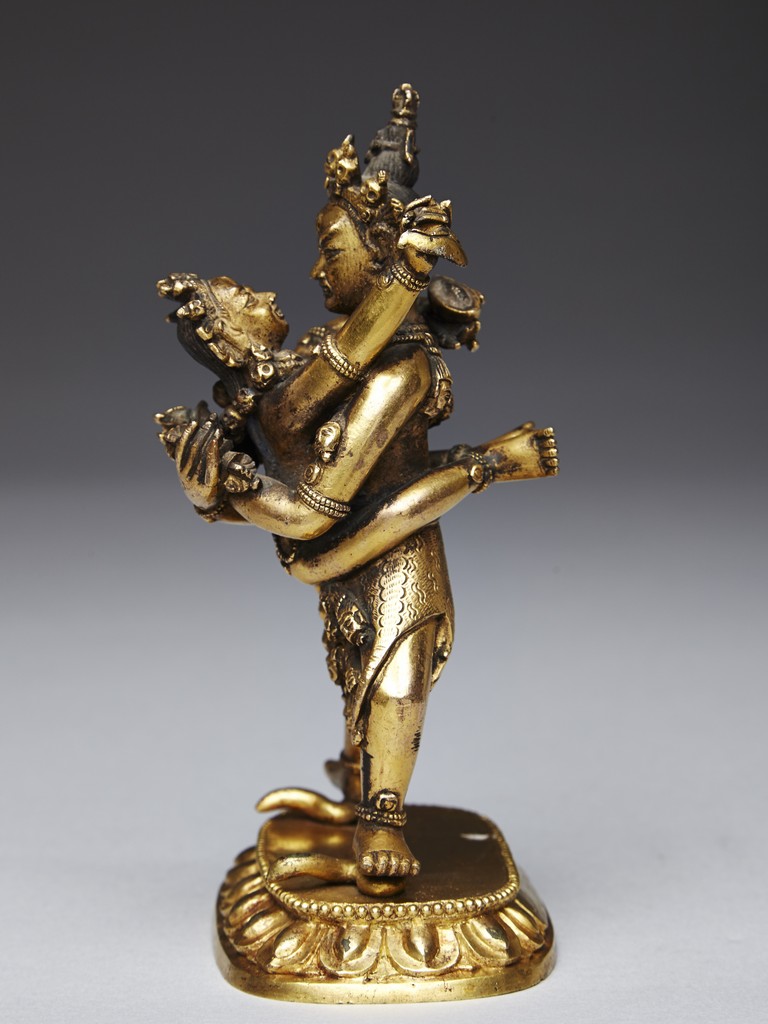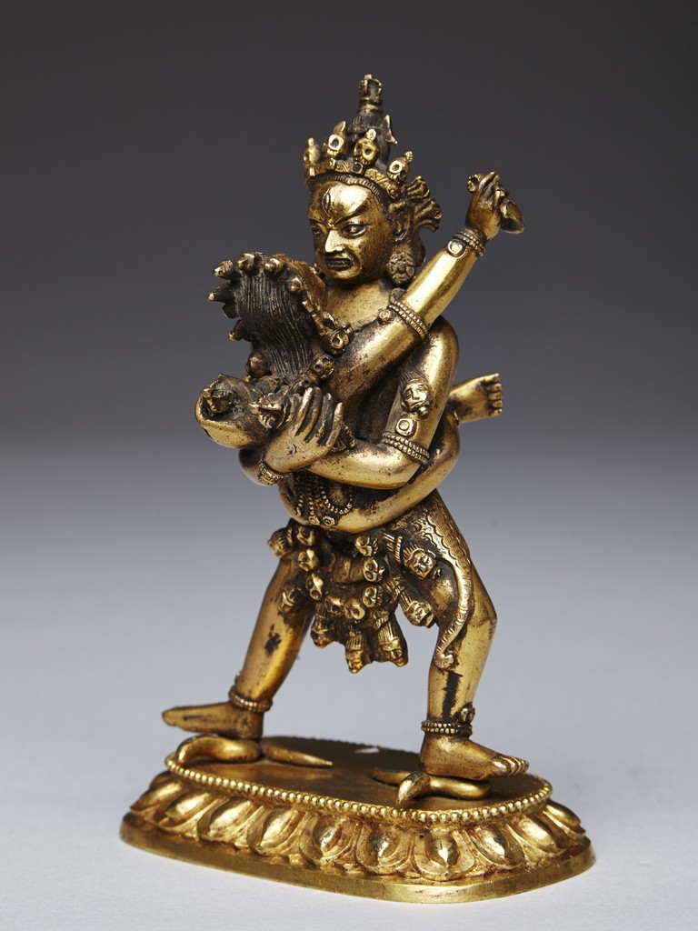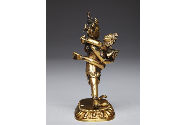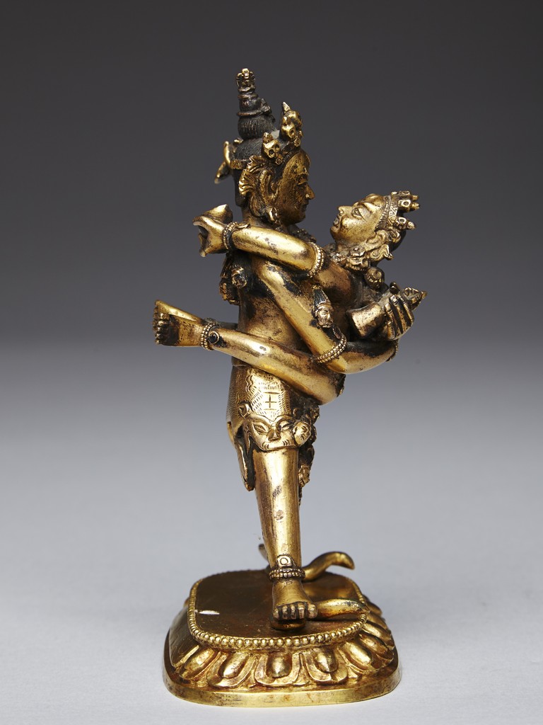 Tibetan. The couple finely cast in embrace, the male shown holding a vajra and ghanta on both hands, wearing tiger-skin and heads around torso, the female shown holding an attribute on one hand, all supported on a lotus throne. 17th Century.