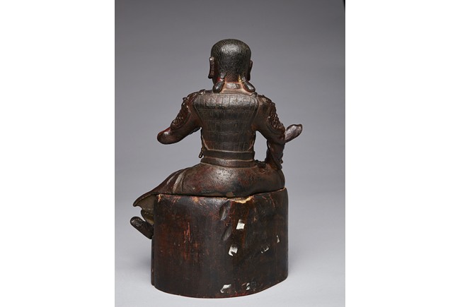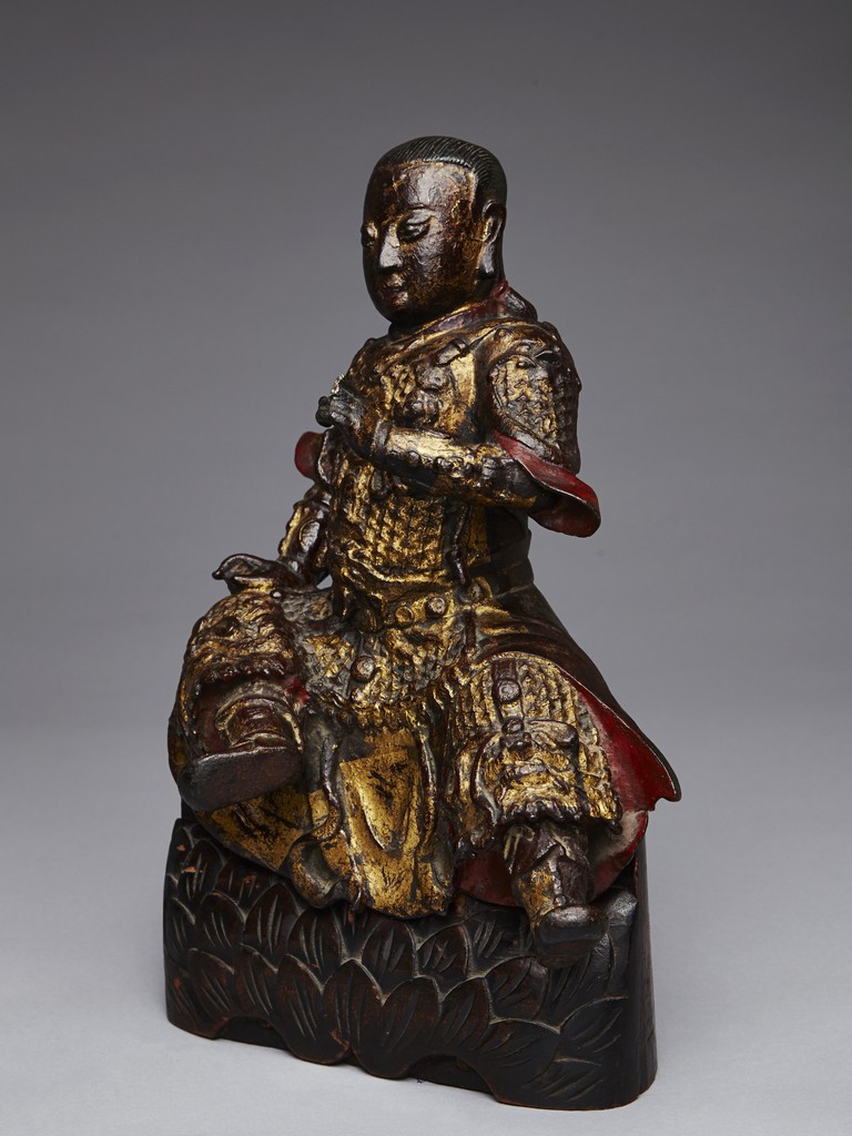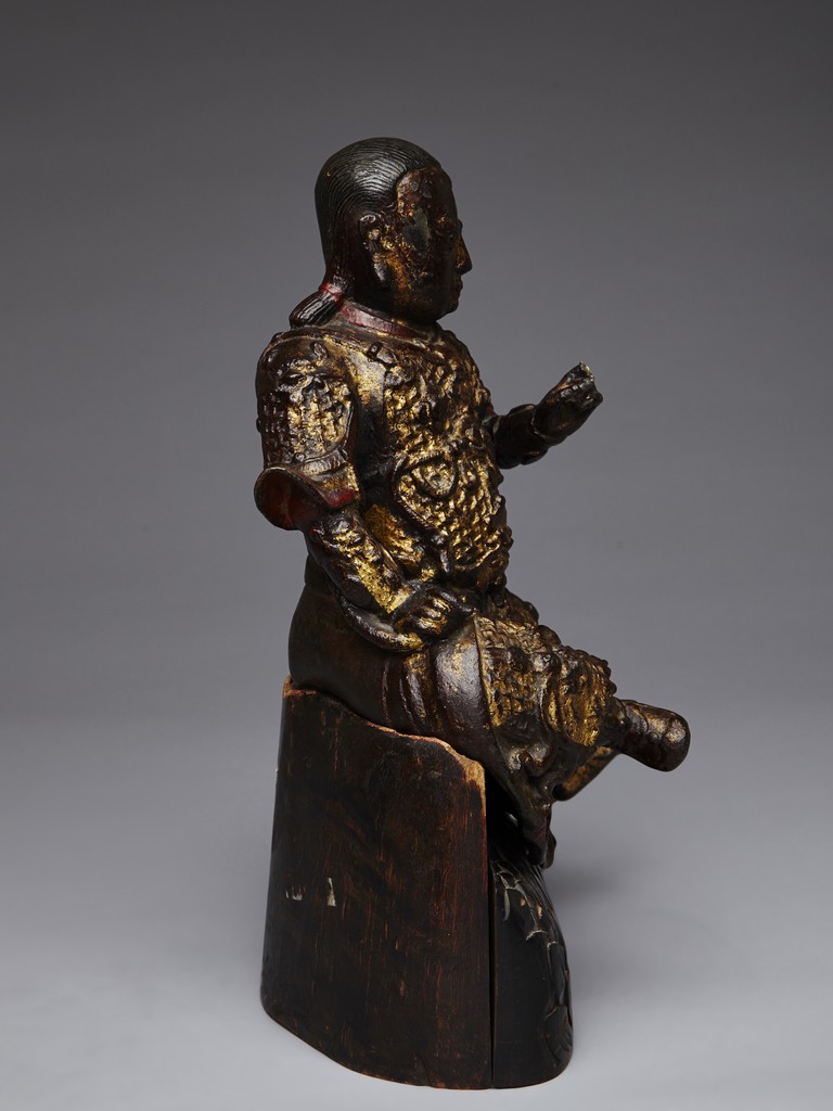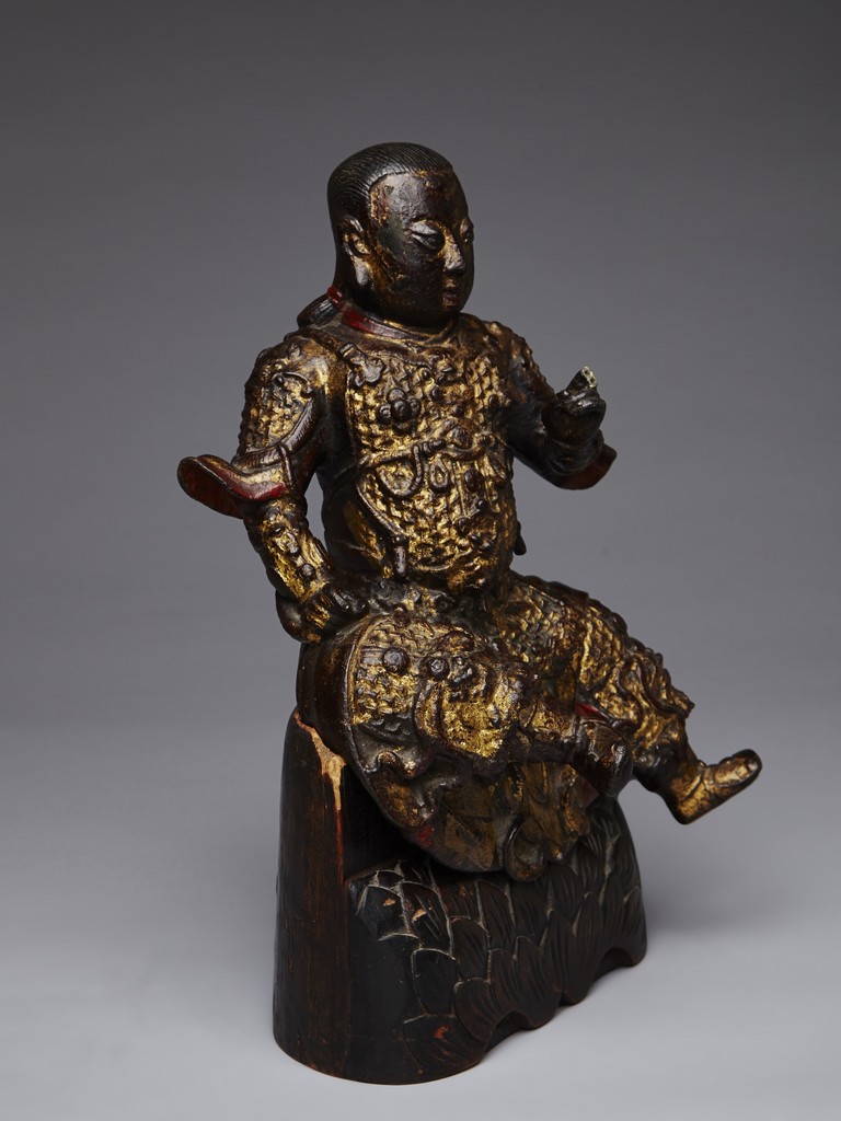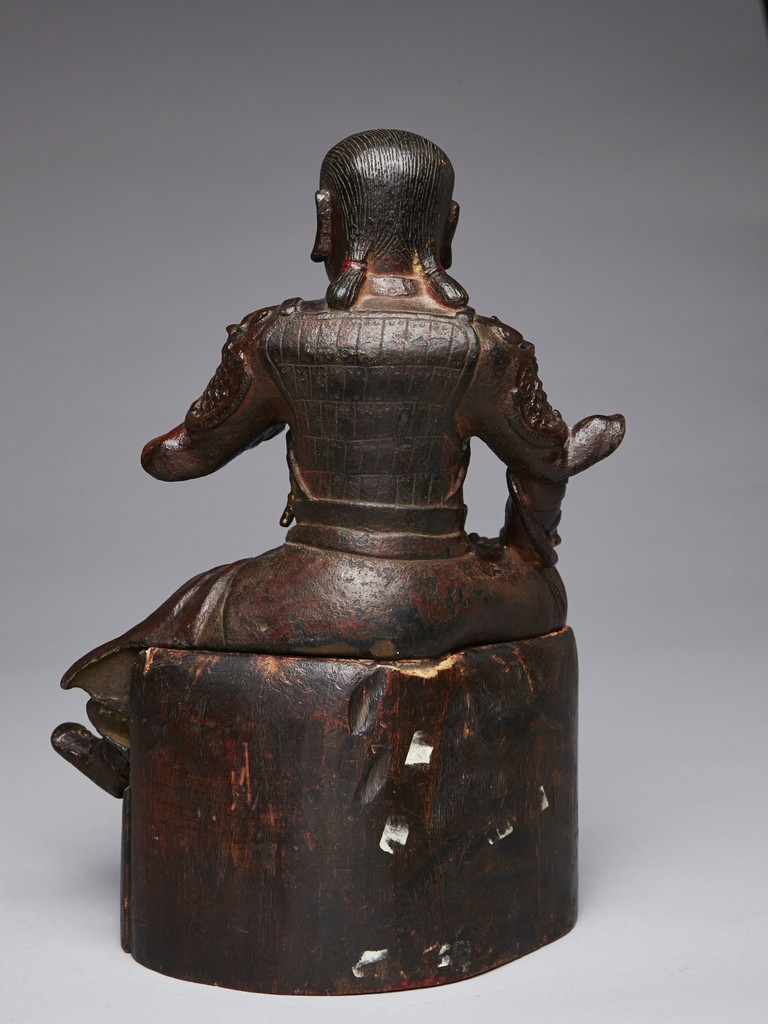 The warrior immortal is shown seated on a stand, wearing heavy armor and left hand raised, face with lively expression an hair detailed with incised lines. Qing Dynasty period.