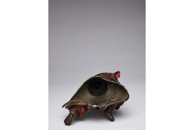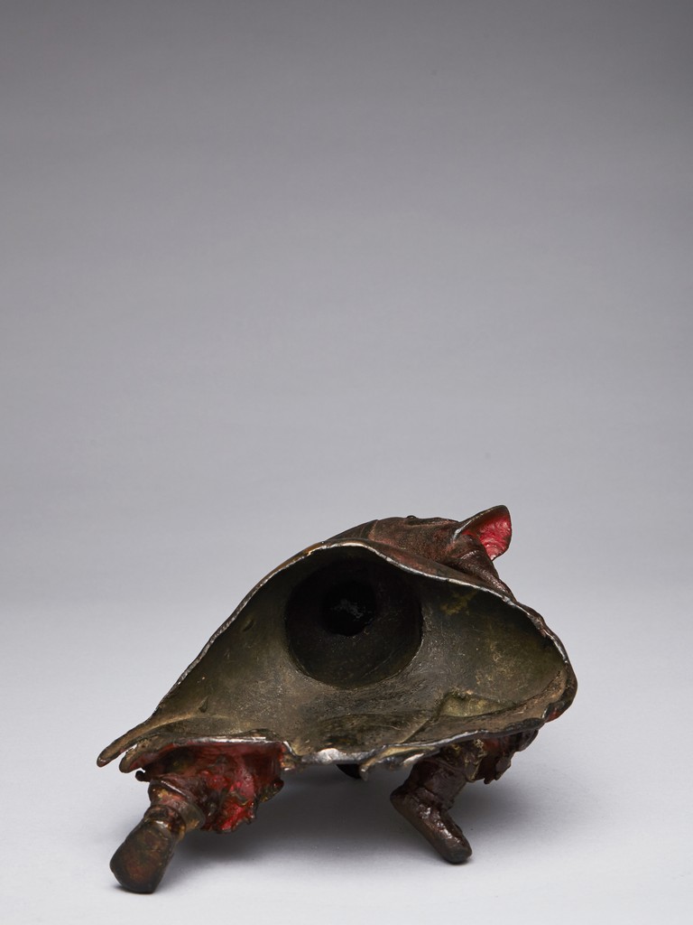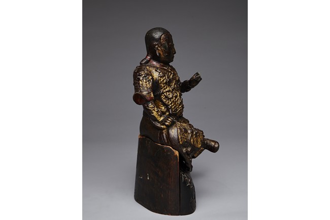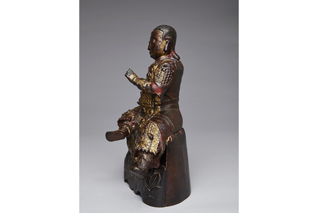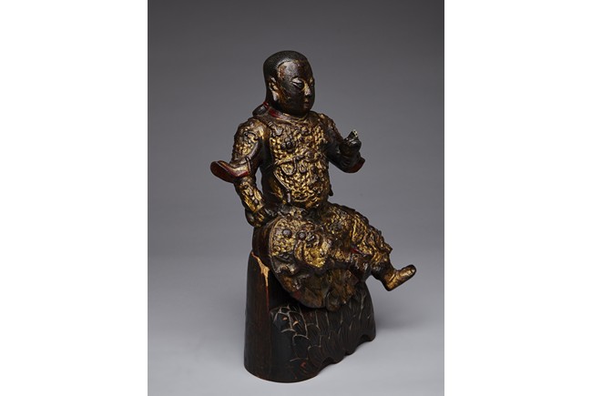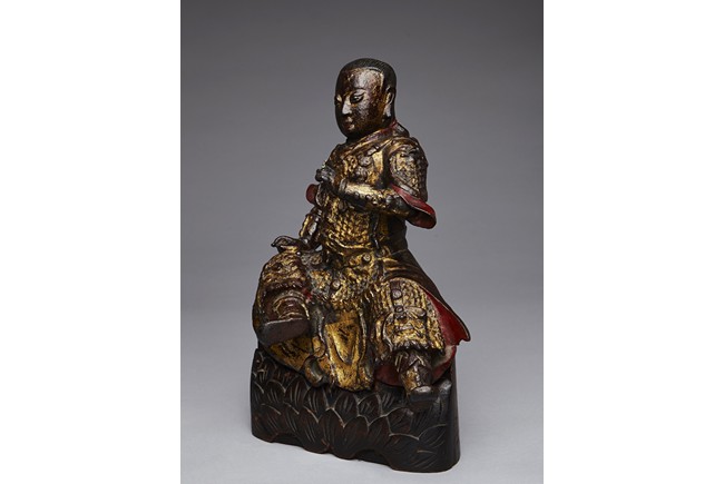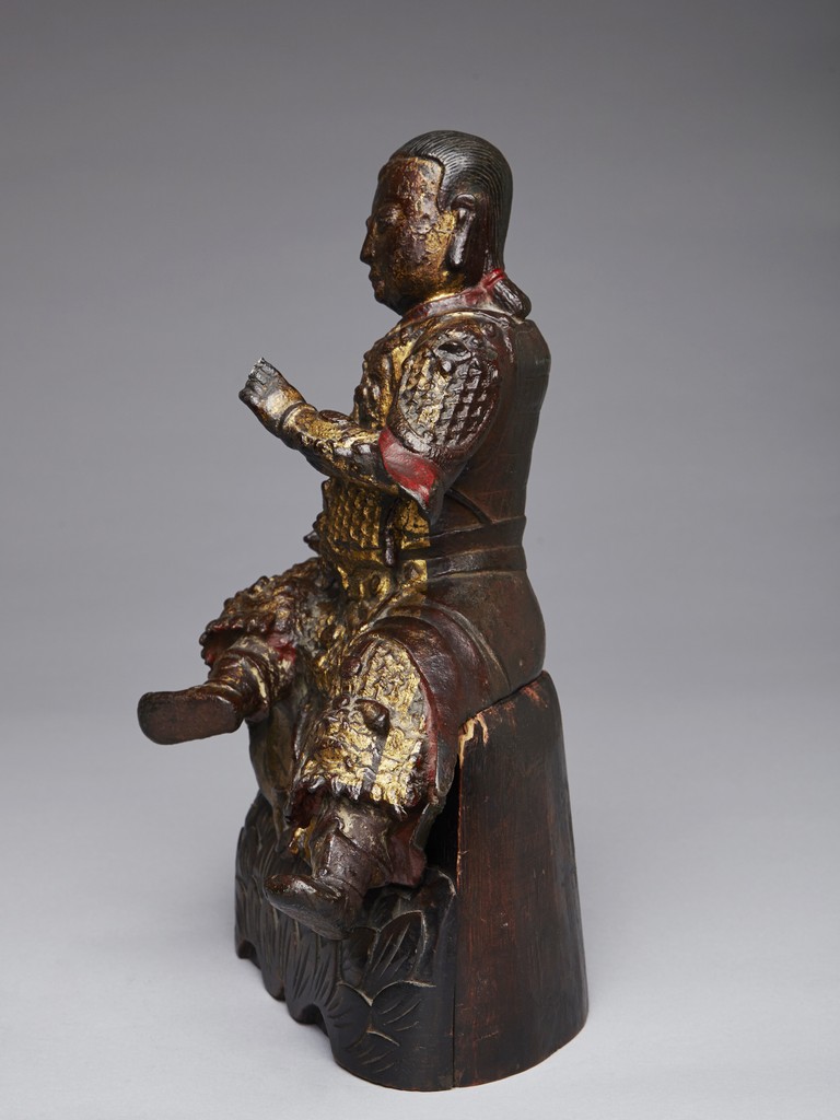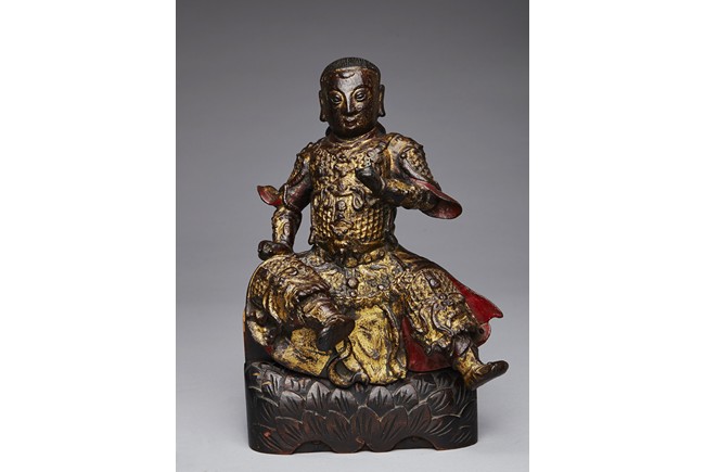 The warrior immortal is shown seated on a stand, wearing heavy armor and left hand raised, face with lively expression an hair detailed with incised lines. Qing Dynasty period.