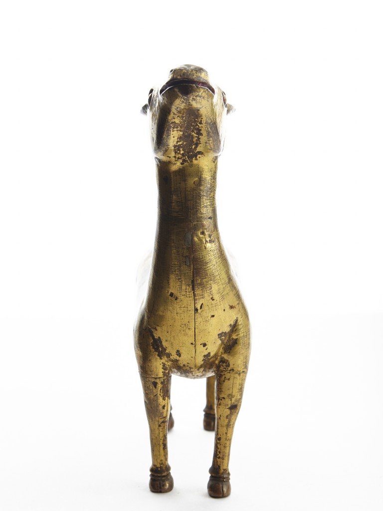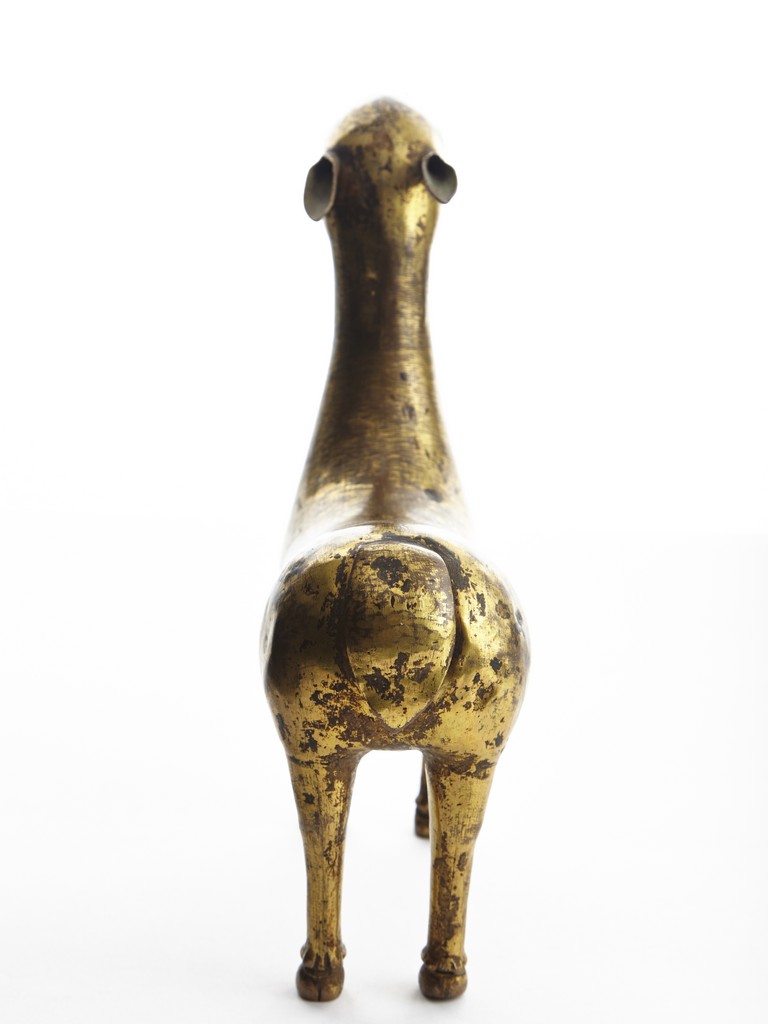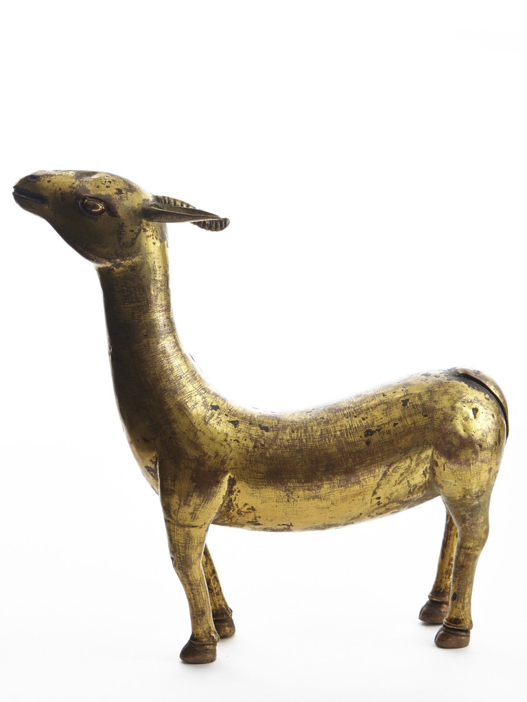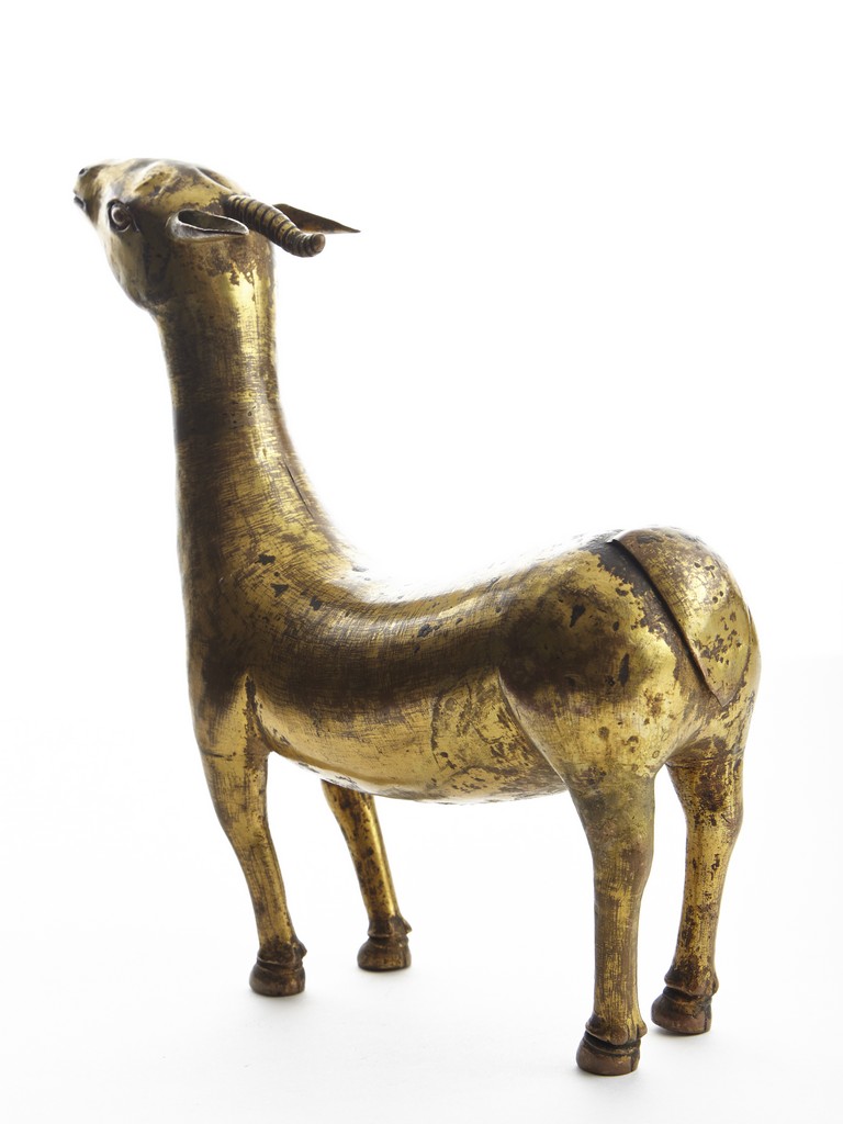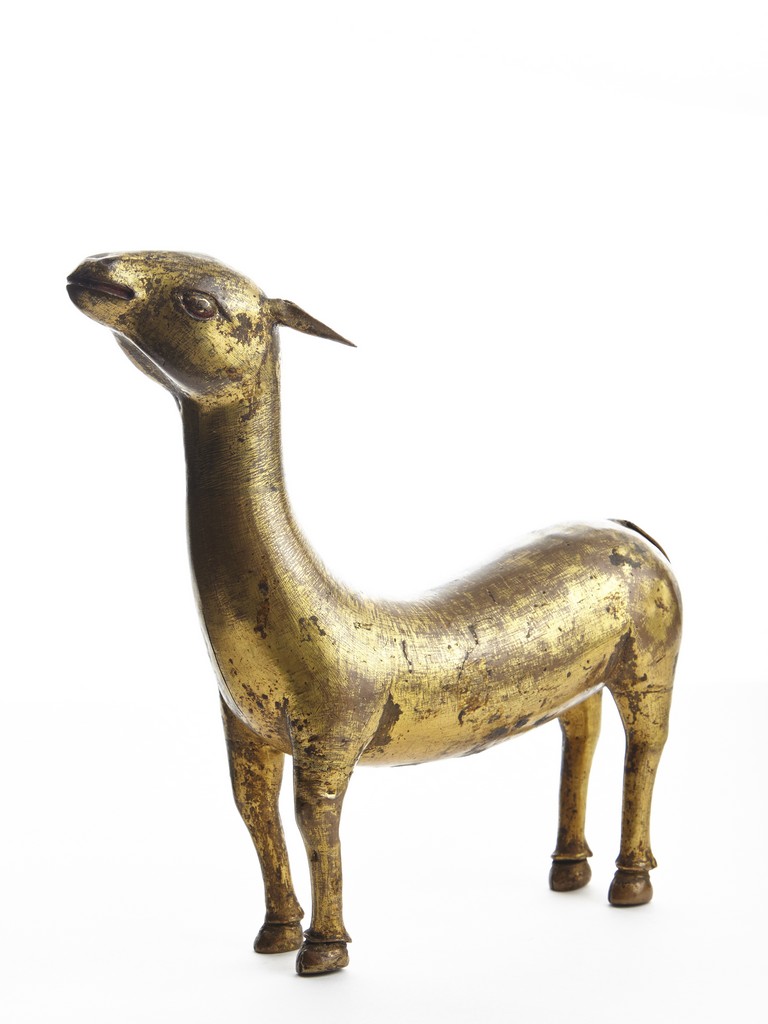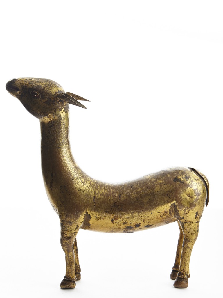 "Each deer is shown standing foursquare with head raised, one with a short single horn, all gilt overall, along with a gilt-bronze Tibetan whell with lotus design to the base, the top with scrolled motif 19th Century."