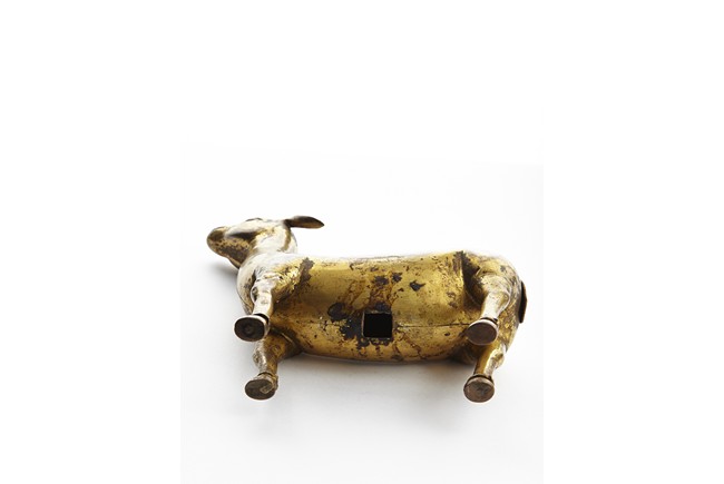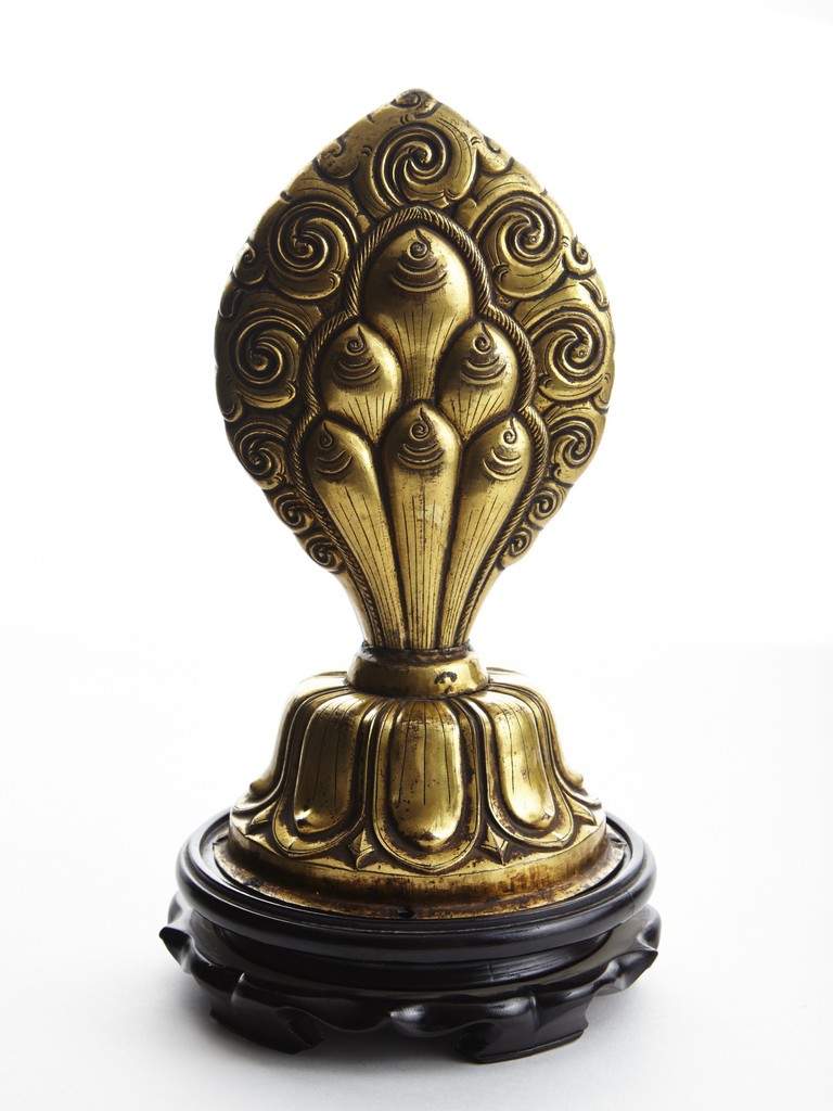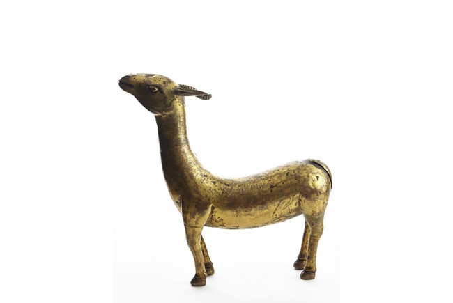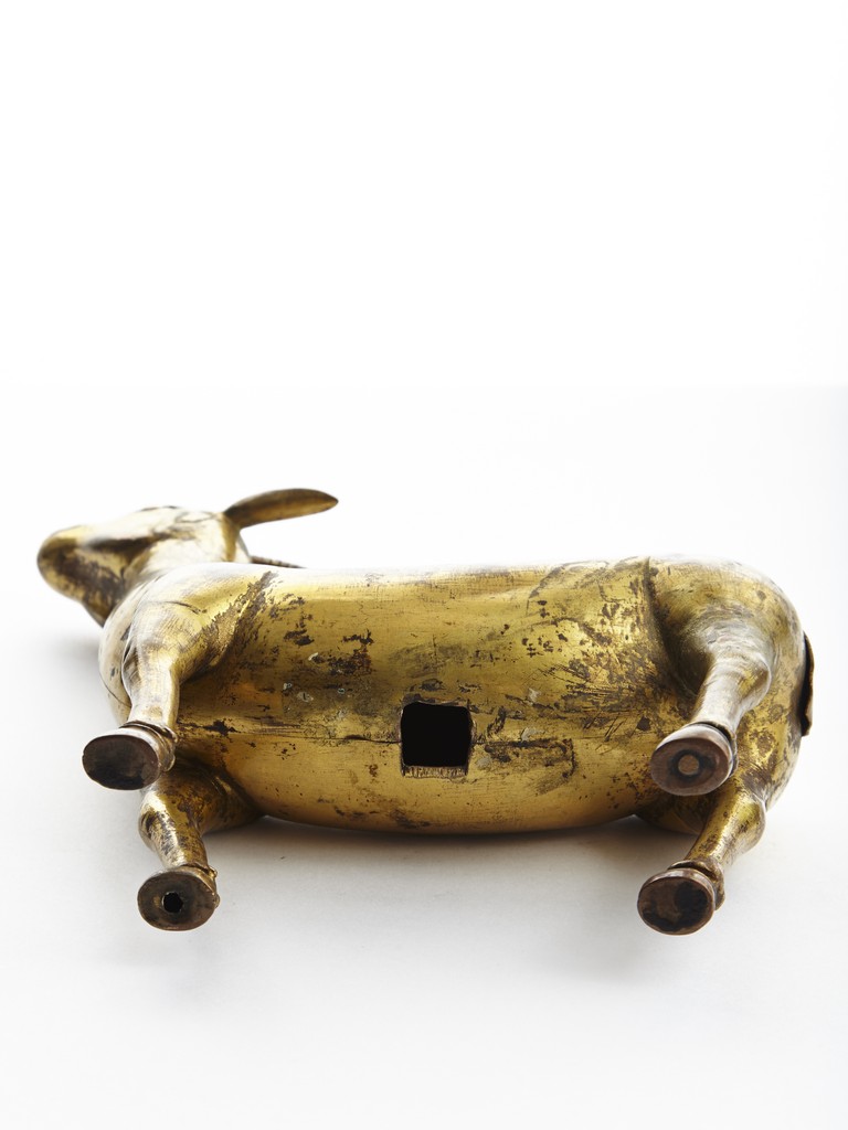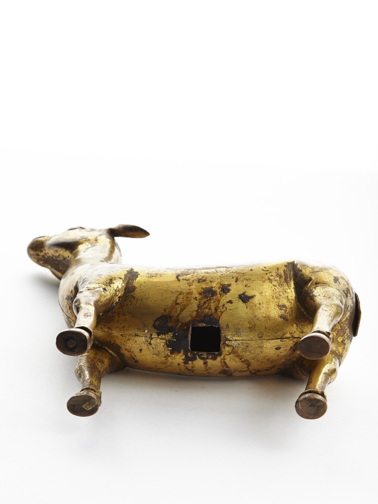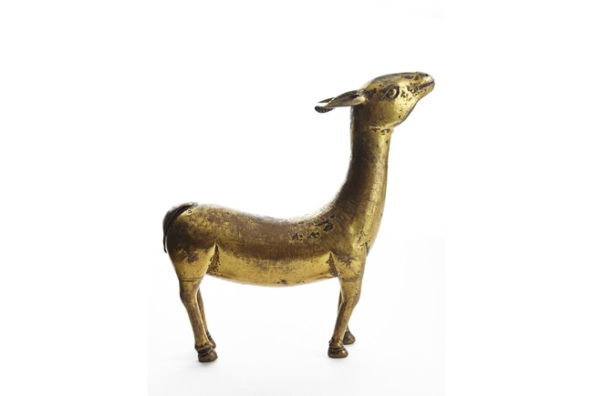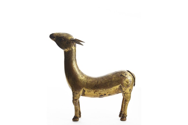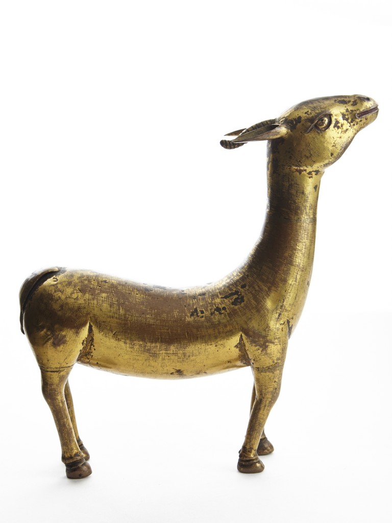 "Each deer is shown standing foursquare with head raised, one with a short single horn, all gilt overall, along with a gilt-bronze Tibetan whell with lotus design to the base, the top with scrolled motif 19th Century."