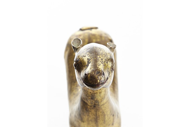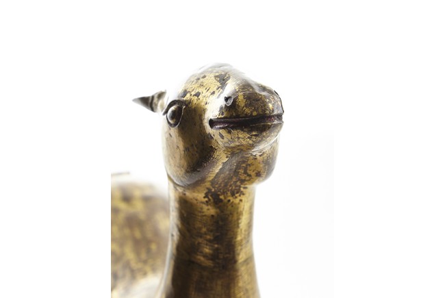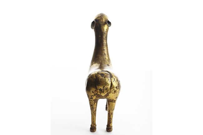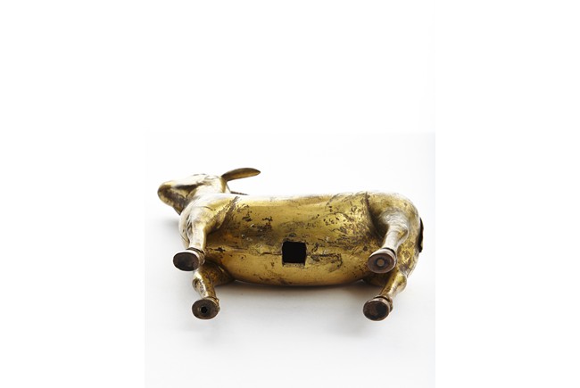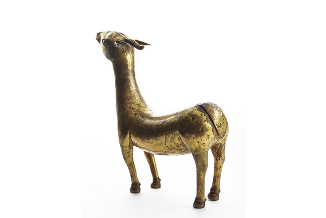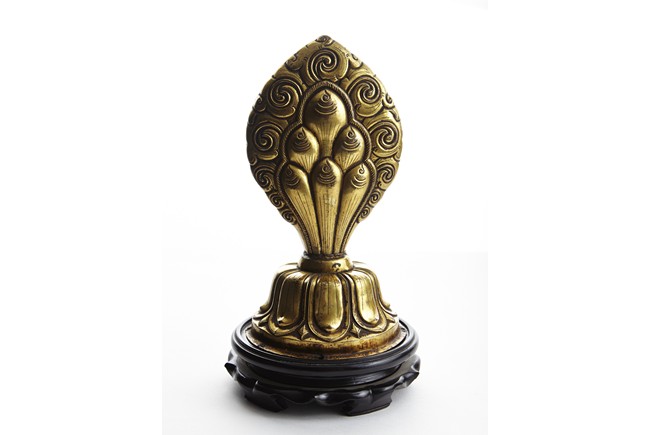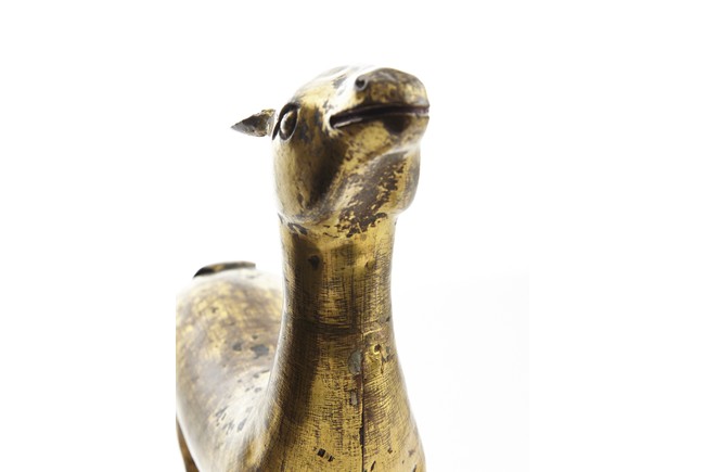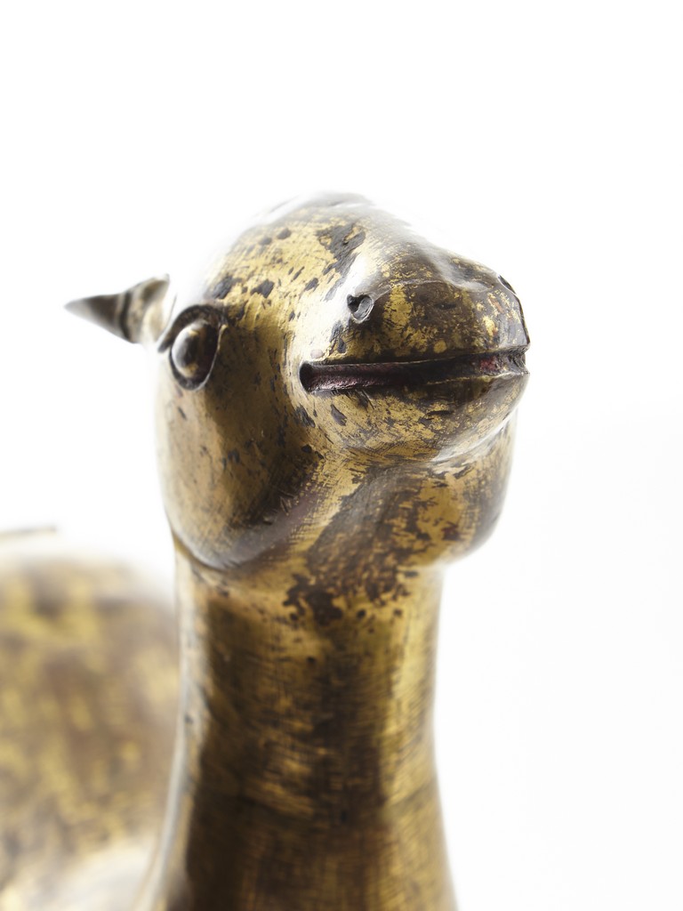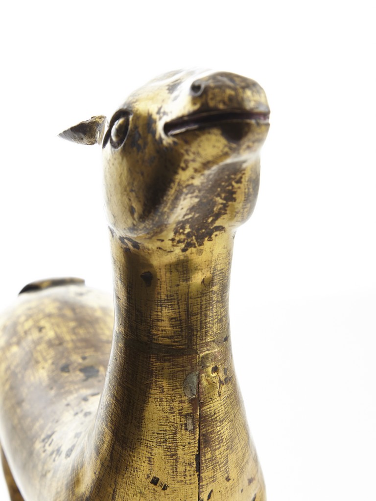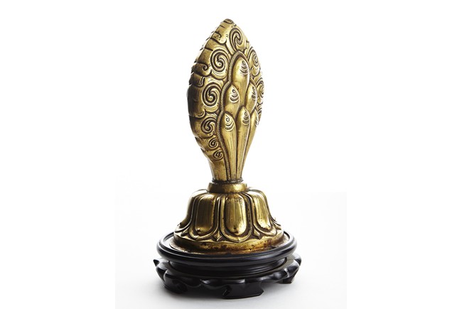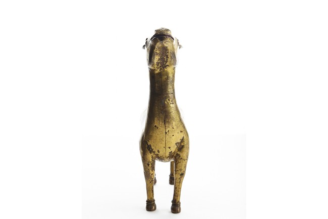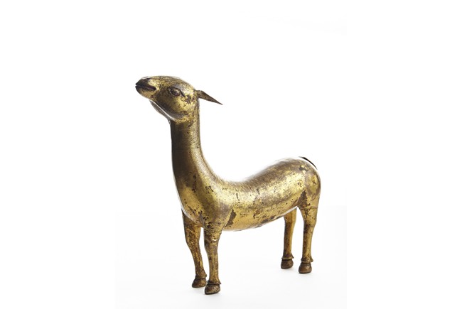 "Each deer is shown standing foursquare with head raised, one with a short single horn, all gilt overall, along with a gilt-bronze Tibetan whell with lotus design to the base, the top with scrolled motif 19th Century."