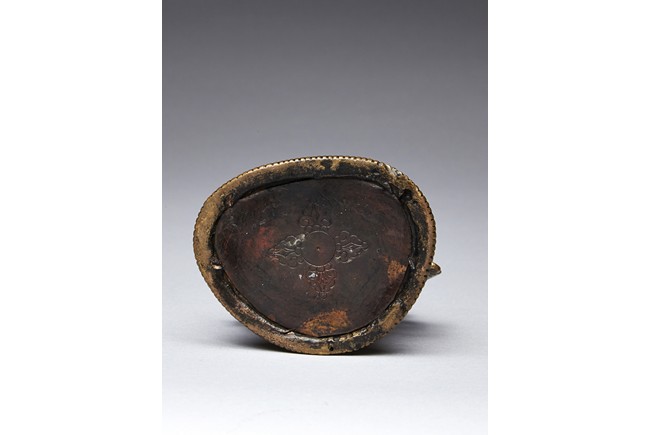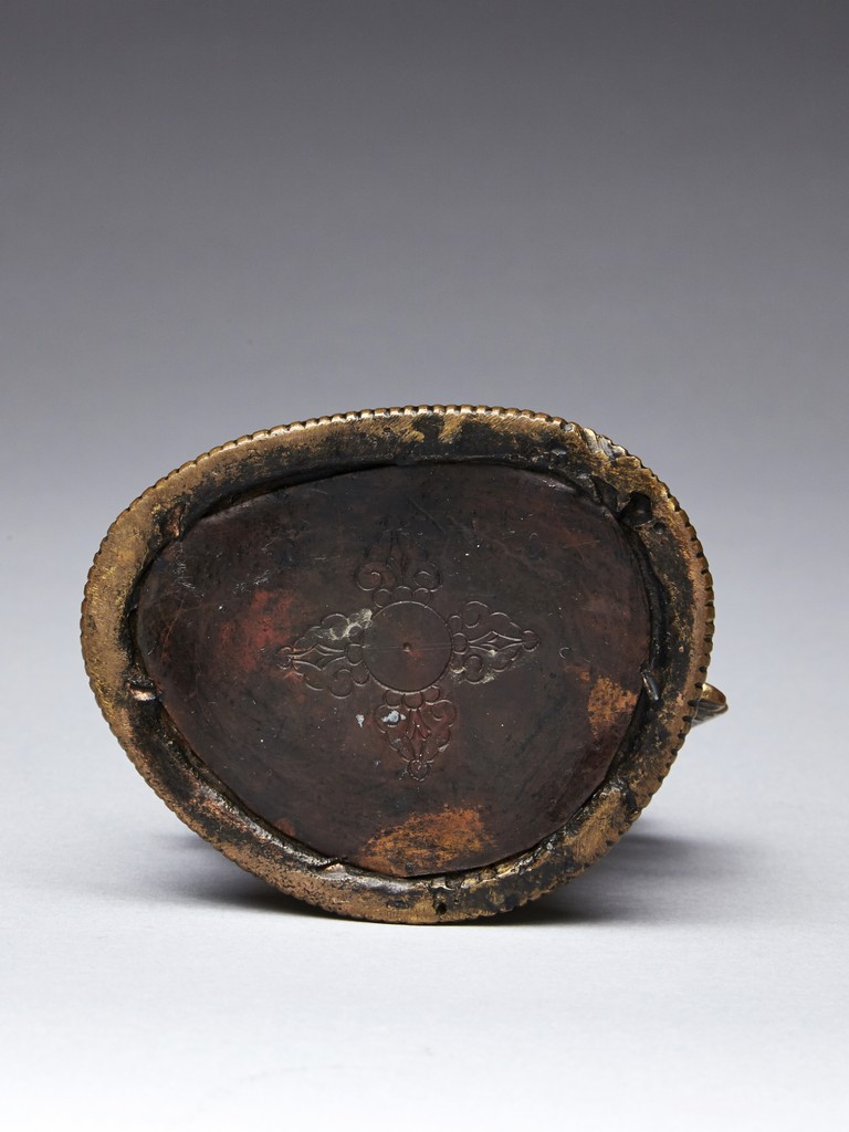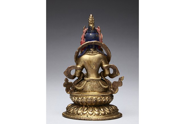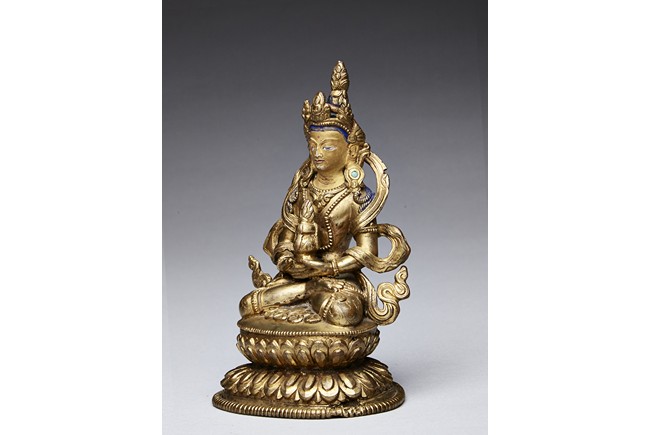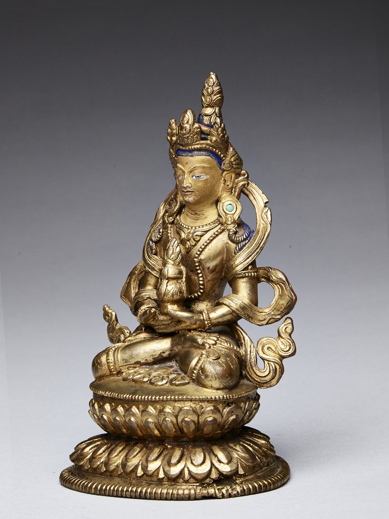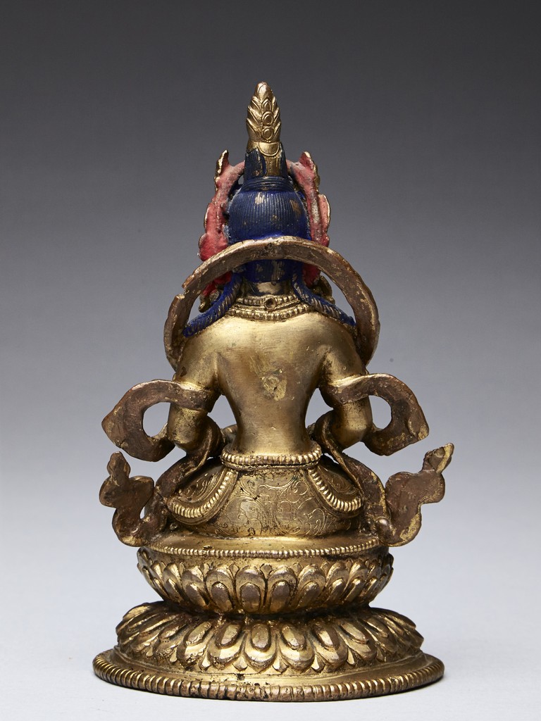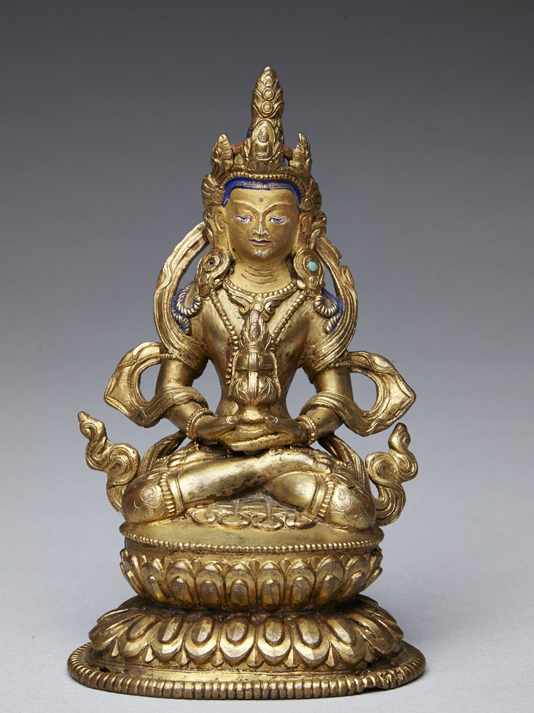 Shown seated upon a double lotus throne, the bodhisattva is seated in dhyanasana with both hands holding a vase, body adorned with beaded jewelry with flowing ribbons across arms and shoulder, his face shown with serene expression, surmounted with pointe tiara and high chignon. Qing Dynasty period.