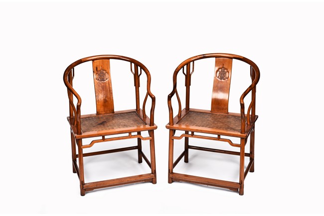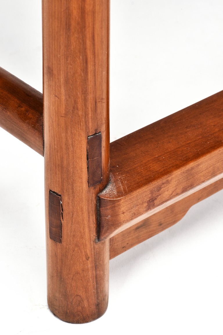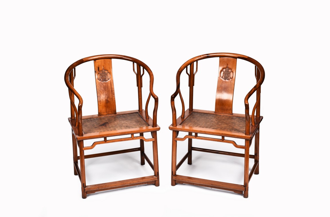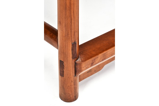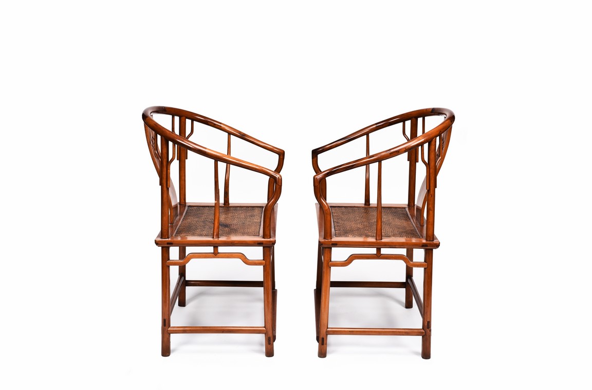 Each chair has a curving top rail supported and curved and straight supports and S-shaped splat. The soft mat seat is set within rectangular frame raised on rounded square legs, joined by humpback stretchers, the feet further joined by stepped stretchers.
