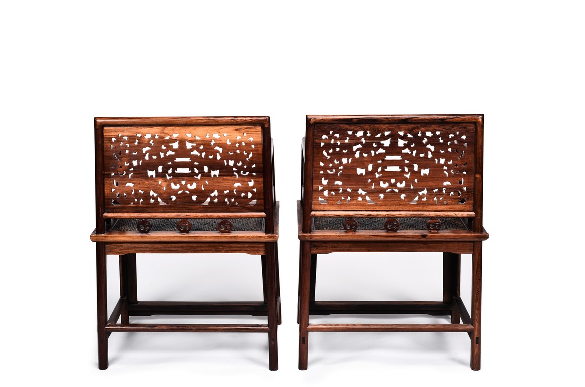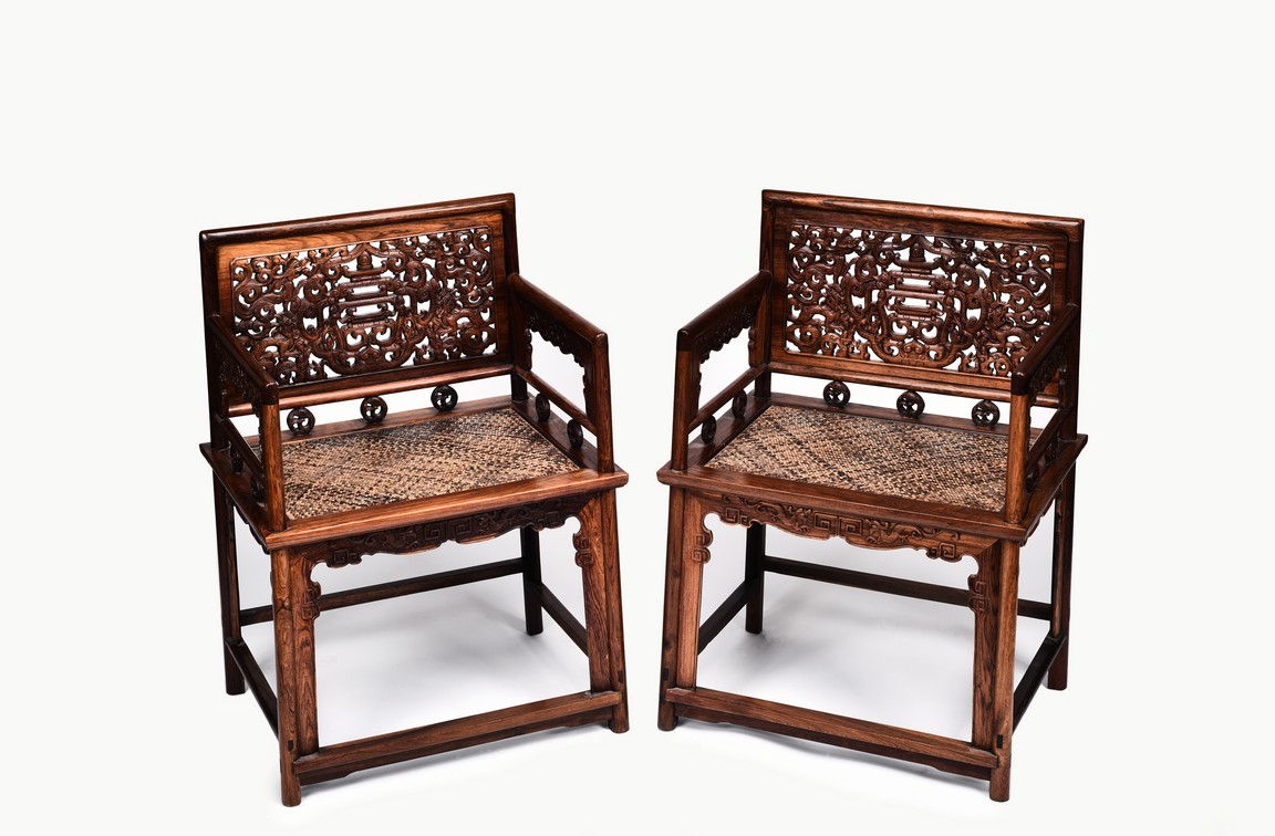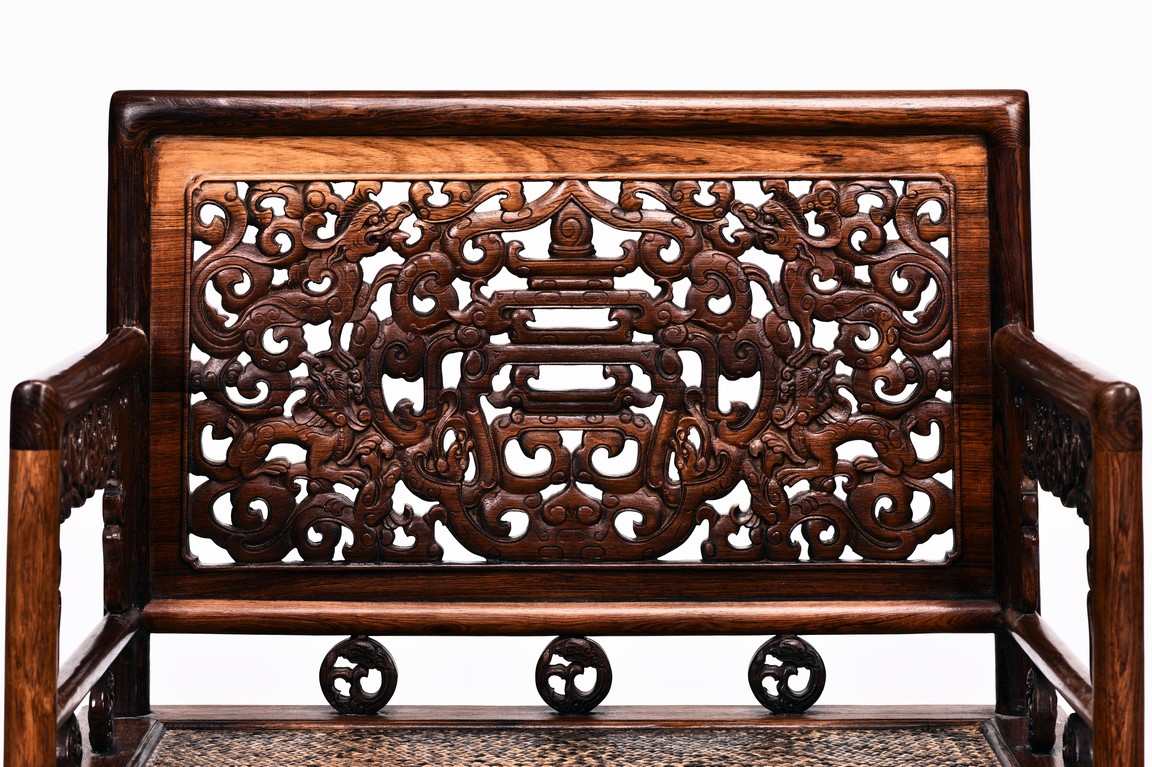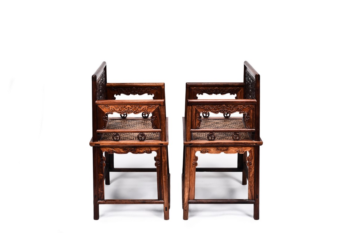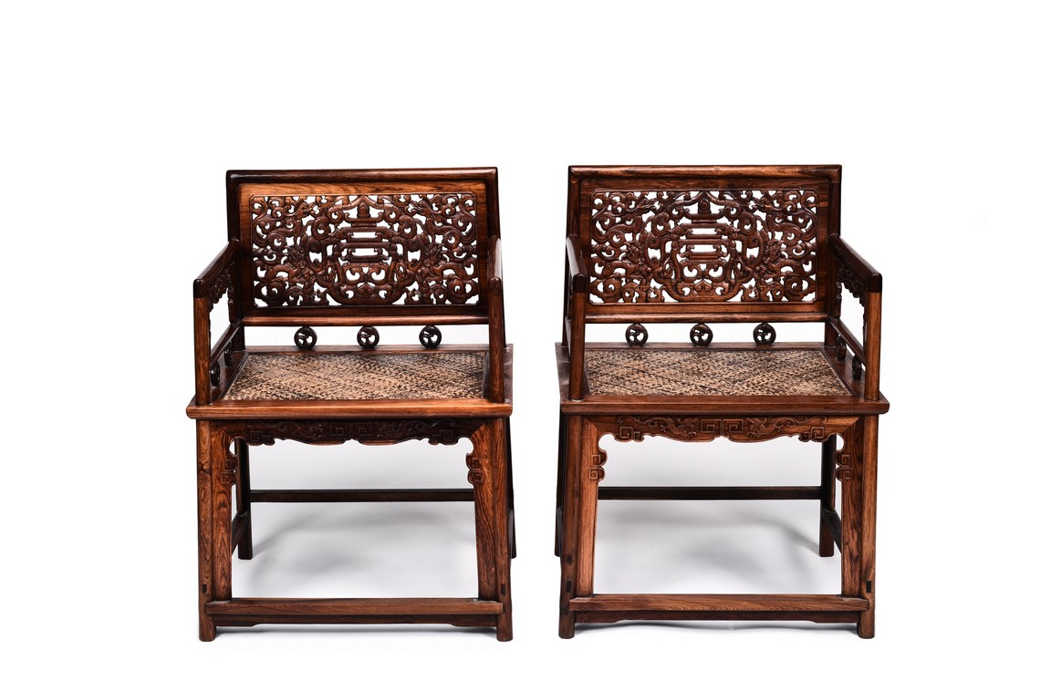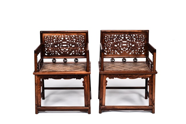 Each chair has a straight toprail continuing through round corners to the backposts, flanking openwork panel carved with stylized shou character mythical beasts, above circular openwork medallions of dragon, each with straight arm with apron and spandrels carved with raised chilong. The soft mat seat above similarly carved apron joining the front legs, the feet joined by stepped stretcher and shaped footrest.