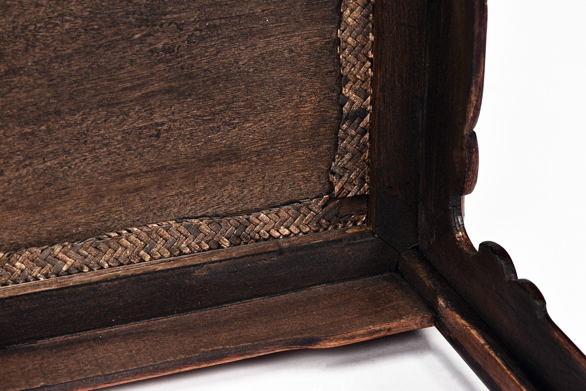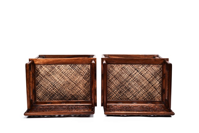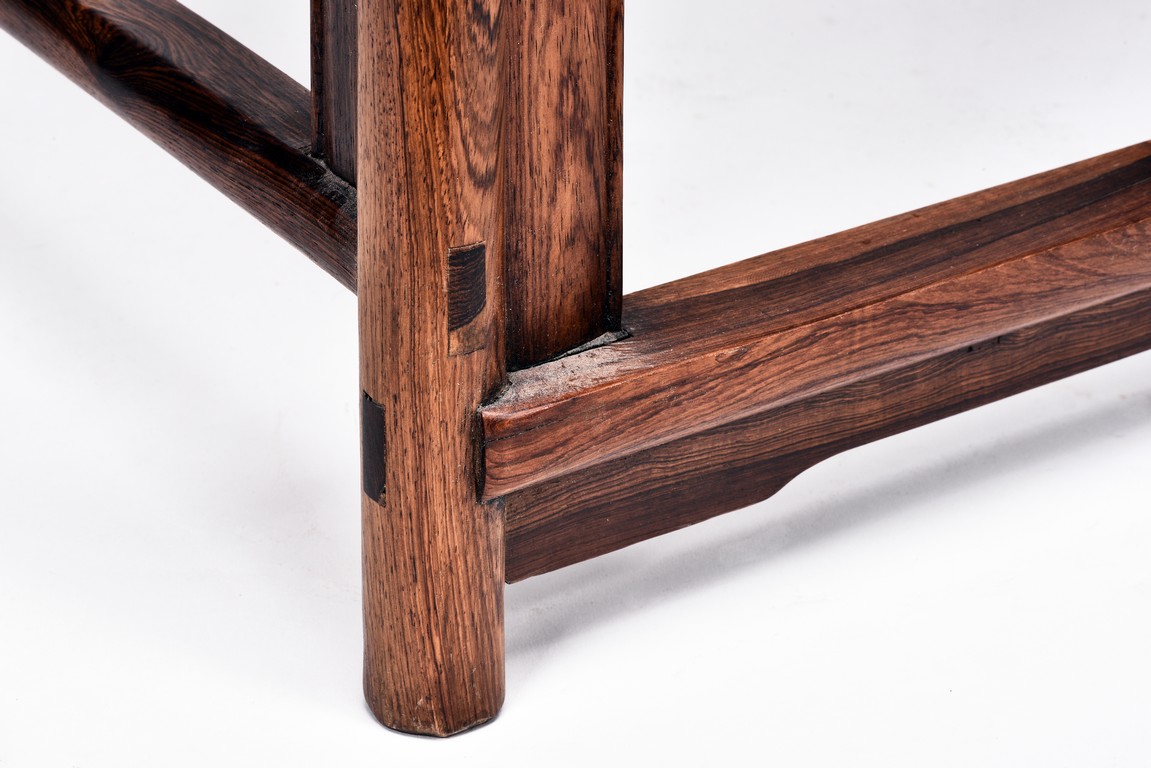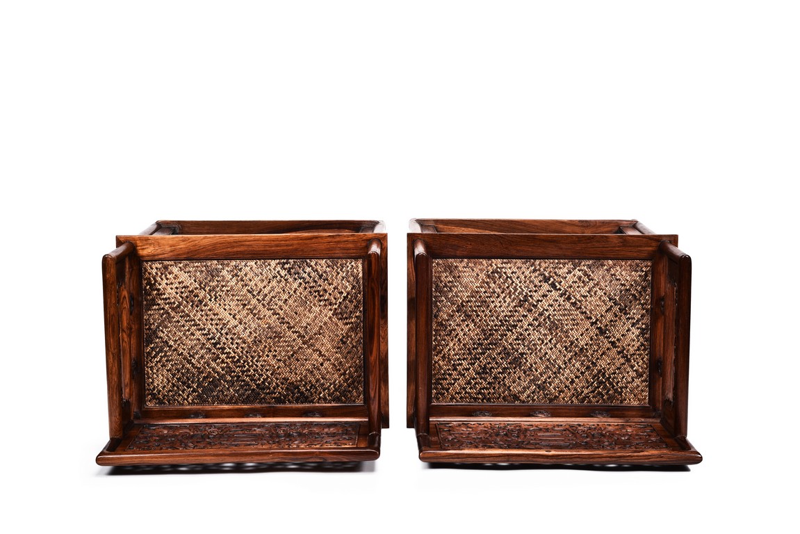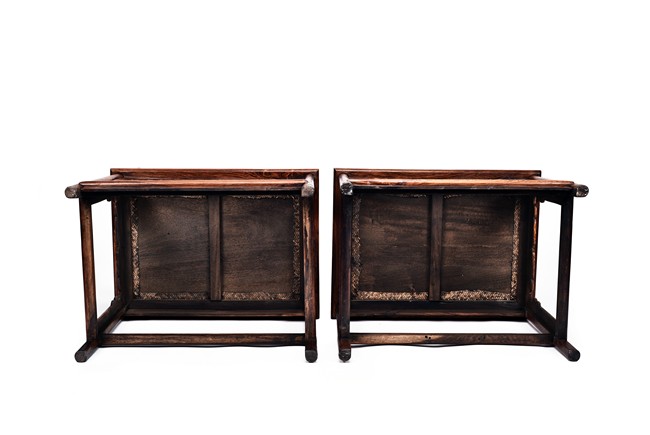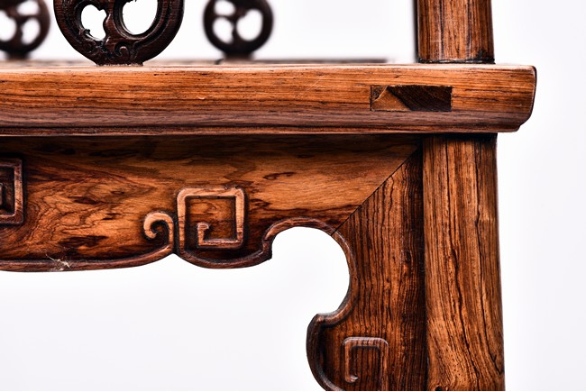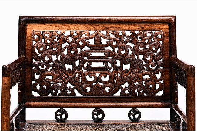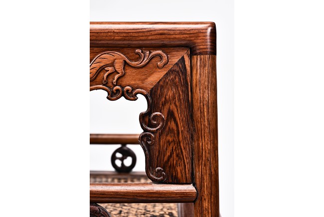 Each chair has a straight toprail continuing through round corners to the backposts, flanking openwork panel carved with stylized shou character mythical beasts, above circular openwork medallions of dragon, each with straight arm with apron and spandrels carved with raised chilong. The soft mat seat above similarly carved apron joining the front legs, the feet joined by stepped stretcher and shaped footrest.