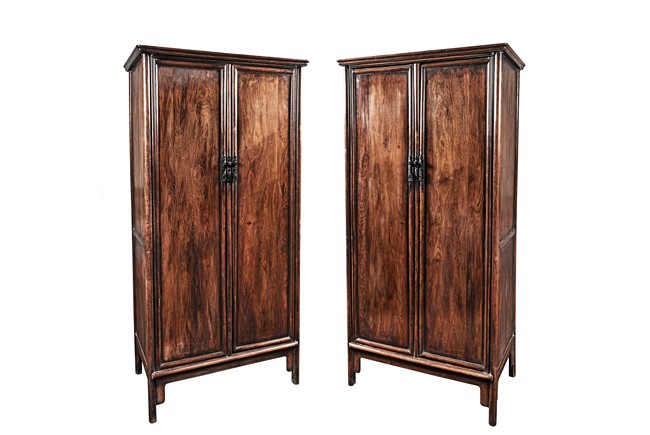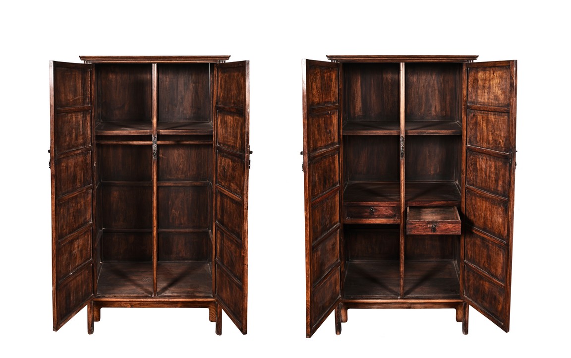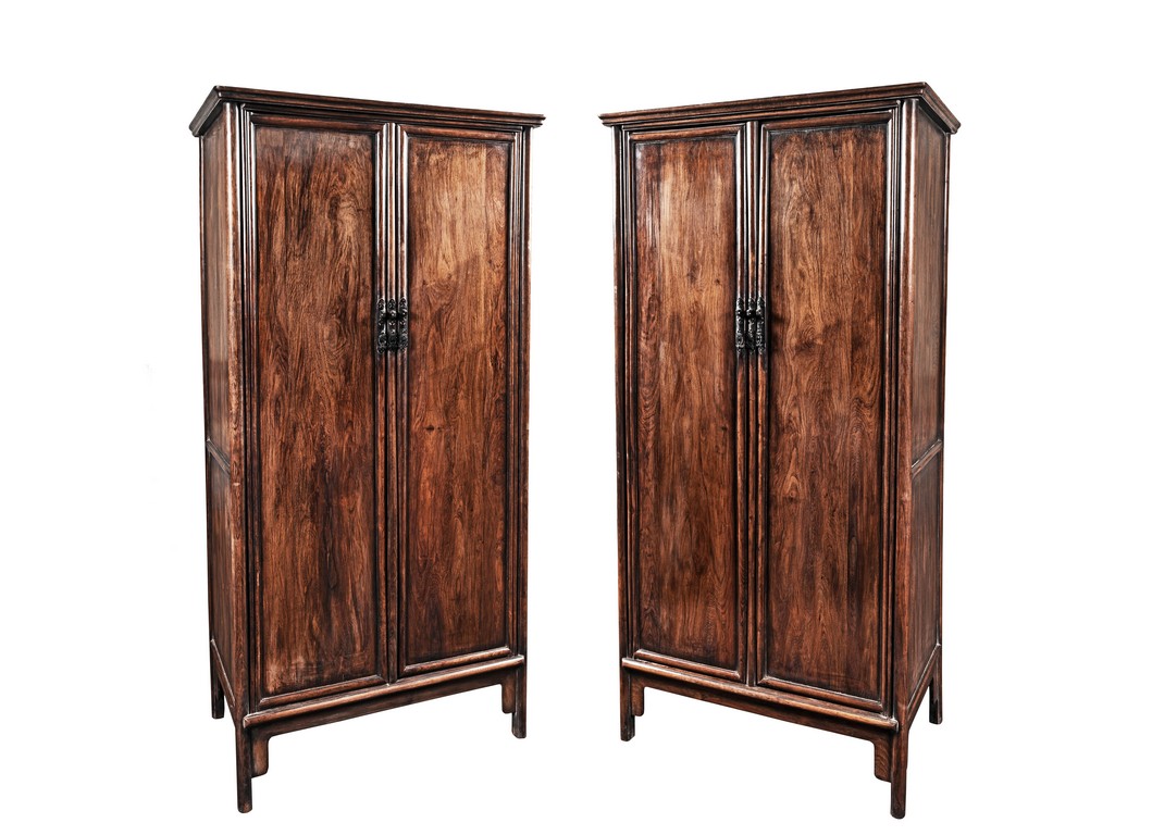 Each rectangular cabinet has a pair of attractive figured door panels to the front below protruding top frame with round corners, opening to reveal shelved interior and two drawers, supported on rounded square posts with shaped spandrels to the front and sides. The wood is of light brown tone.