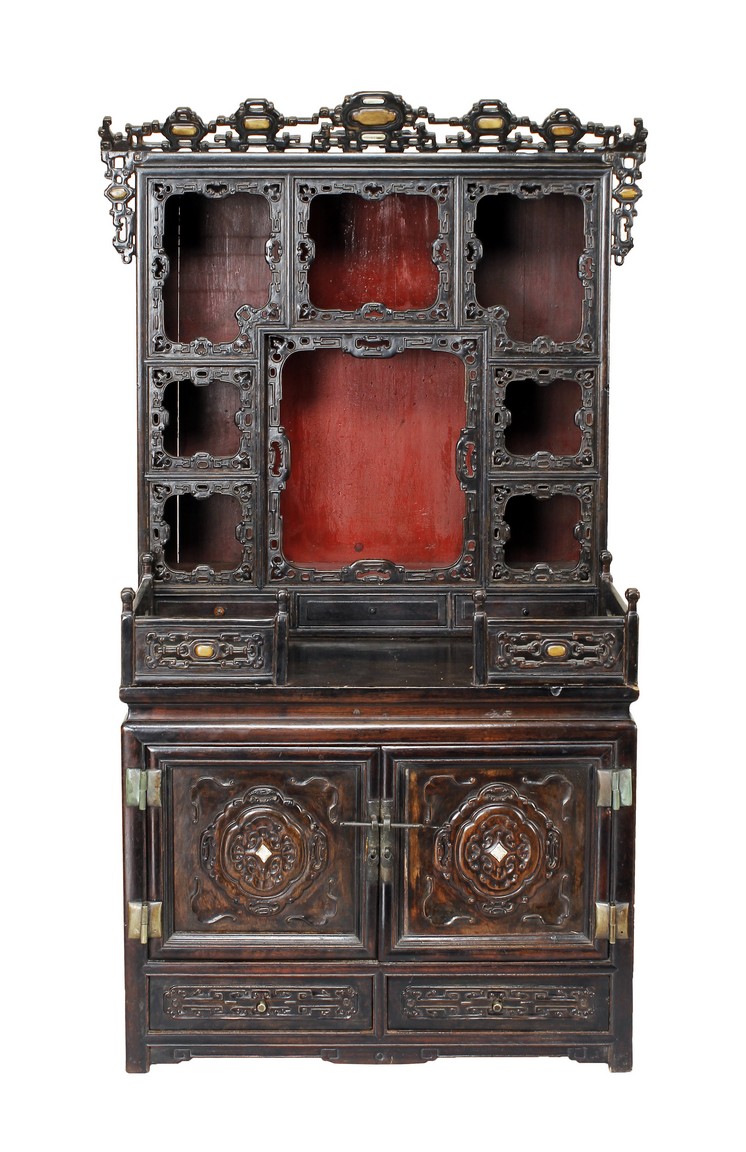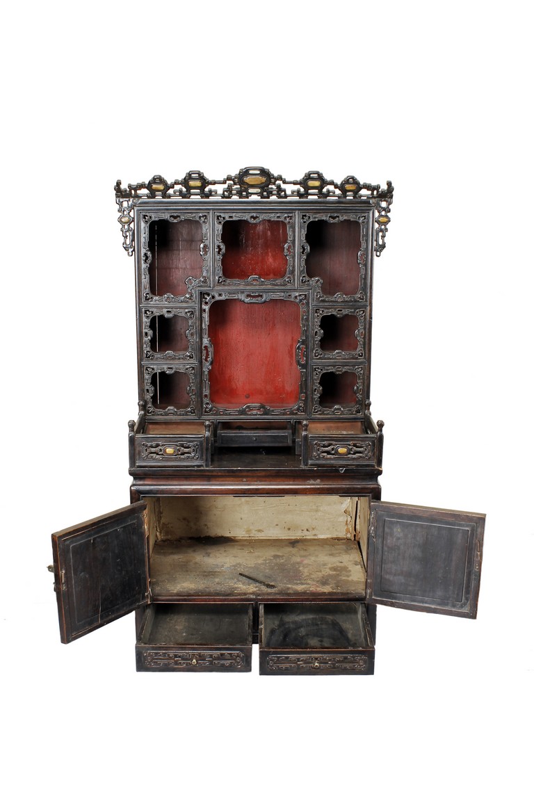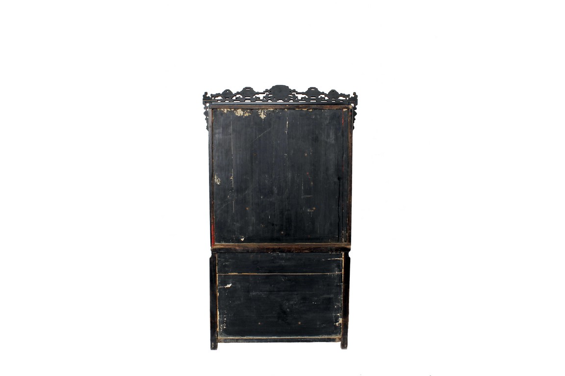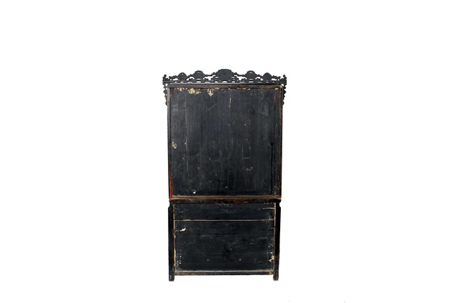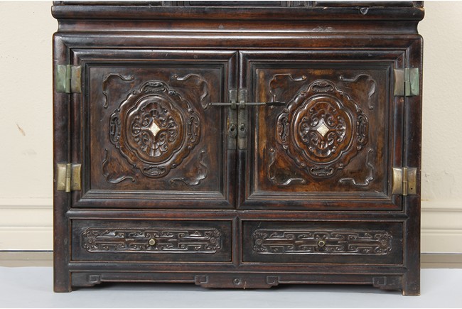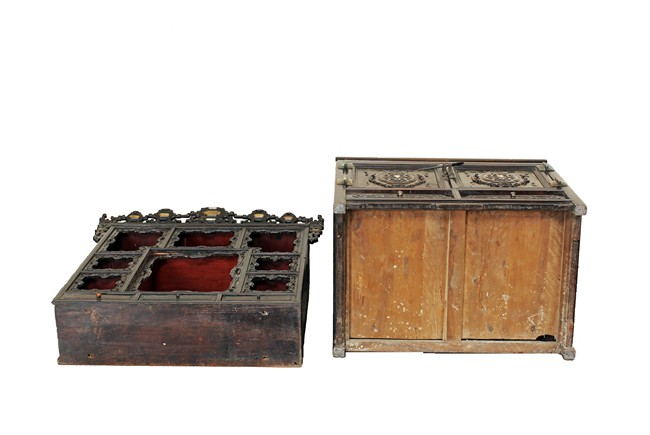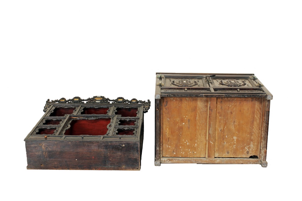 Of rectangular form, the wooden altar's center is to hold and display the Buddha figure, seven smaller openings surrounds the larger center opening, each with pierce carved skirt, three small drawers right below, with rail and space reserved for offerings, additional cabinet space and drawers below, carved with flower and other stylized patterns, with bronze hinges and lock. Wood with natural color and grain, some age related wear and damage. Qing Dynasty period.
