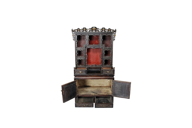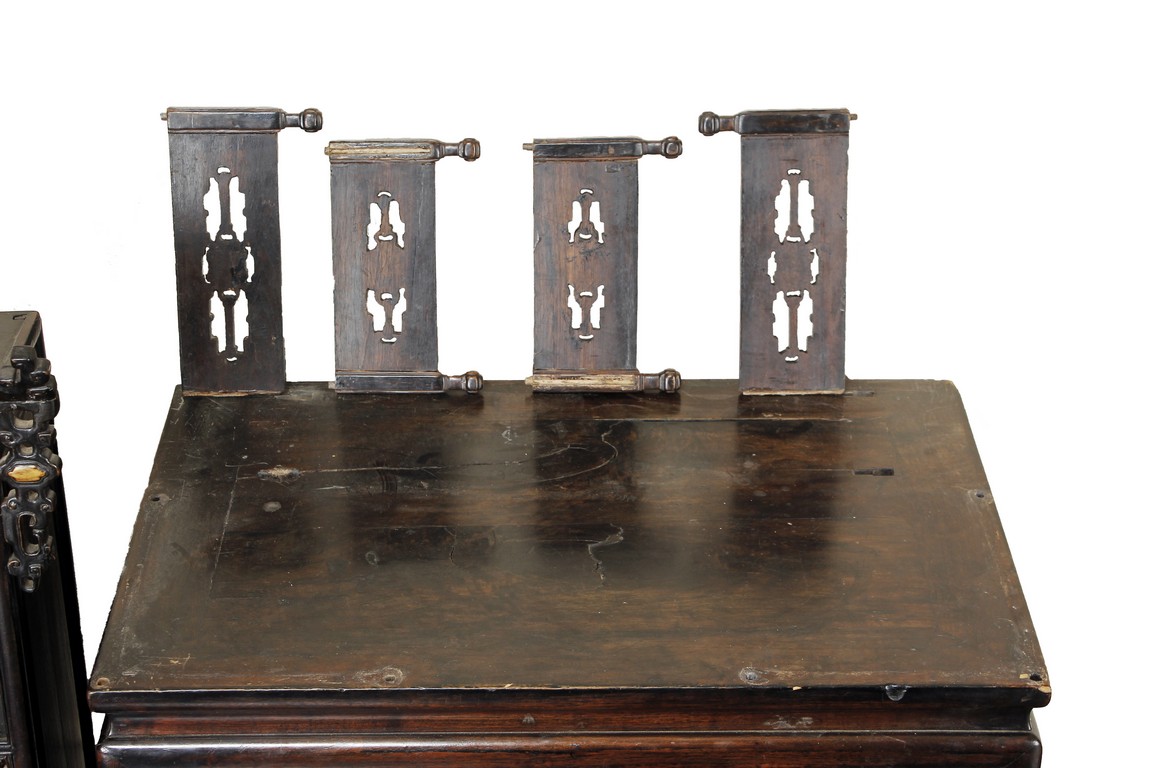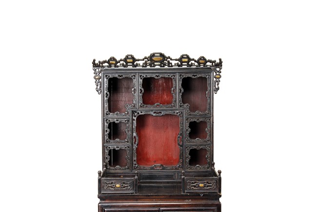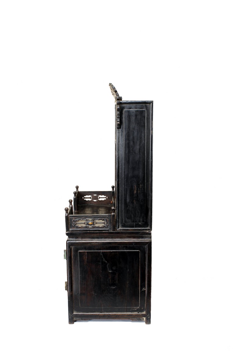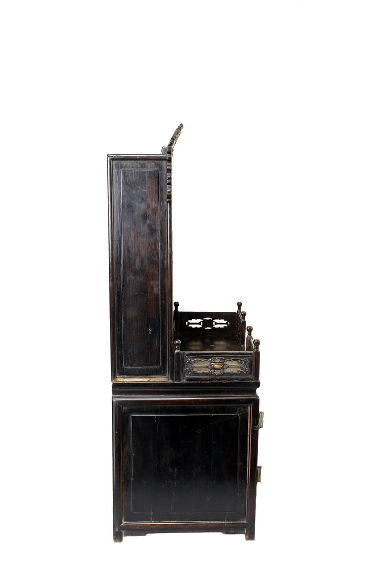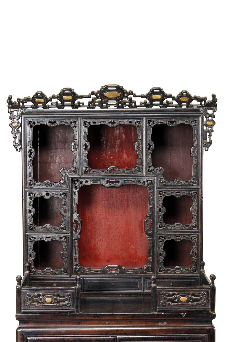 Of rectangular form, the wooden altar's center is to hold and display the Buddha figure, seven smaller openings surrounds the larger center opening, each with pierce carved skirt, three small drawers right below, with rail and space reserved for offerings, additional cabinet space and drawers below, carved with flower and other stylized patterns, with bronze hinges and lock. Wood with natural color and grain, some age related wear and damage. Qing Dynasty period.