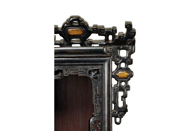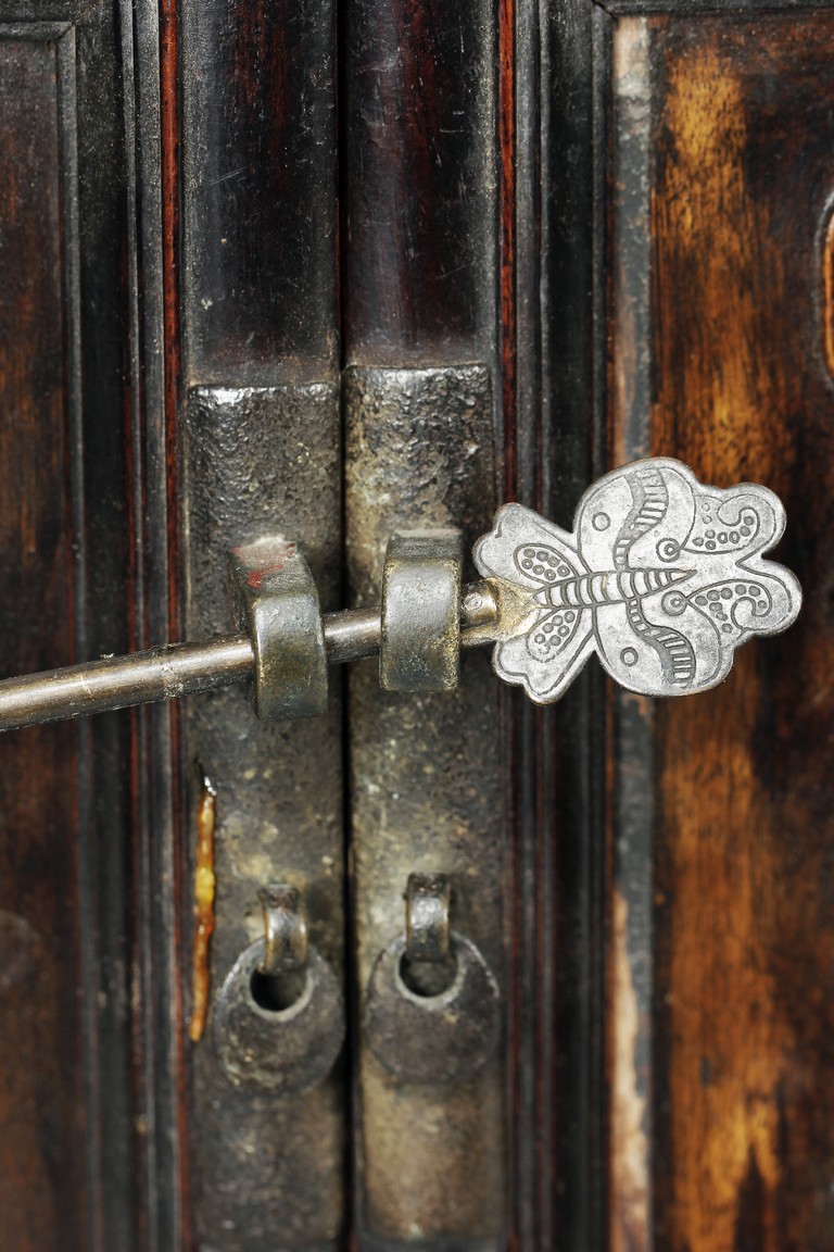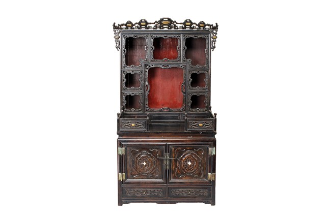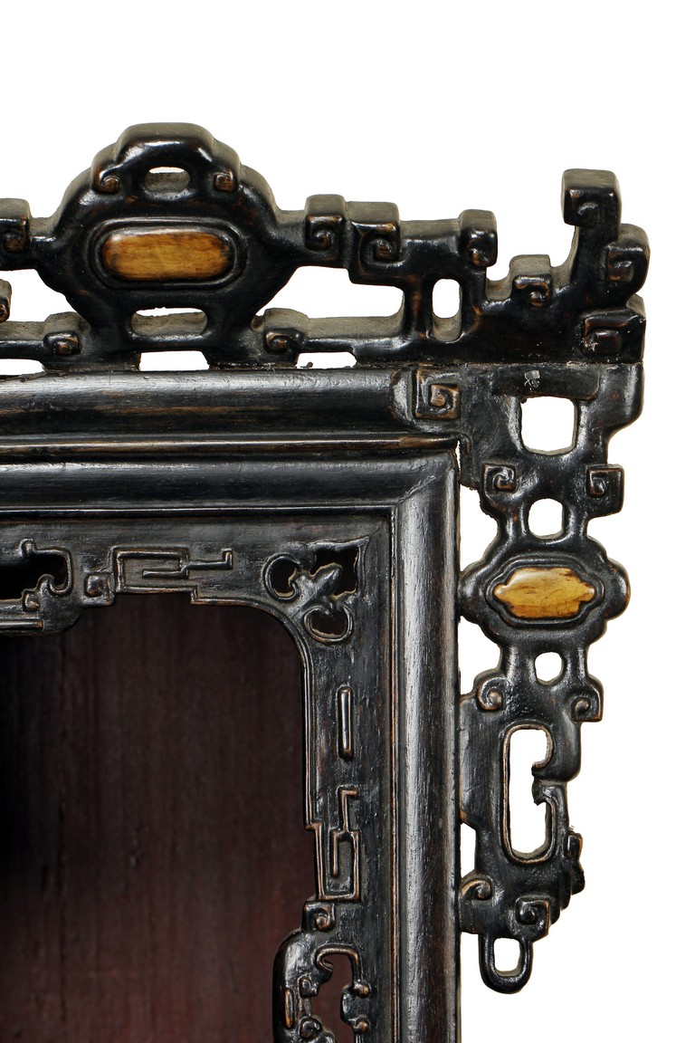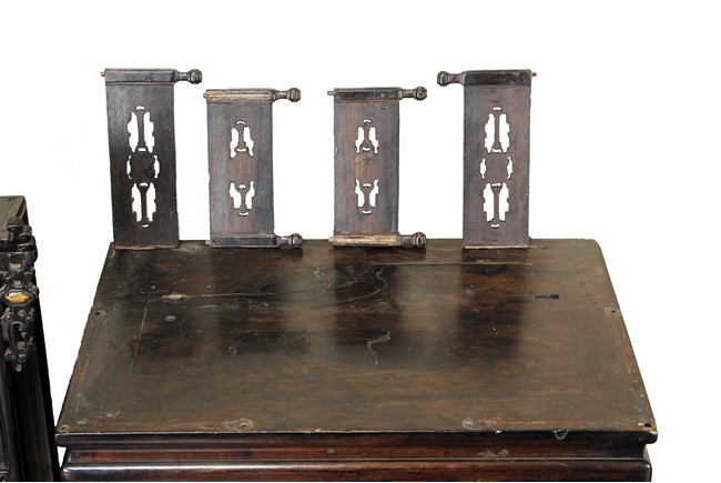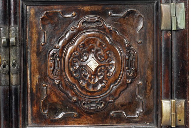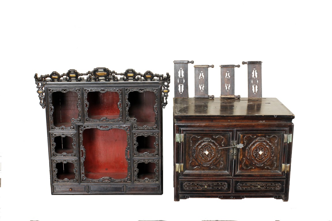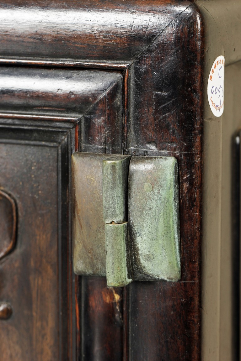Of rectangular form, the wooden altar's center is to hold and display the Buddha figure, seven smaller openings surrounds the larger center opening, each with pierce carved skirt, three small drawers right below, with rail and space reserved for offerings, additional cabinet space and drawers below, carved with flower and other stylized patterns, with bronze hinges and lock. Wood with natural color and grain, some age related wear and damage. Qing Dynasty period.