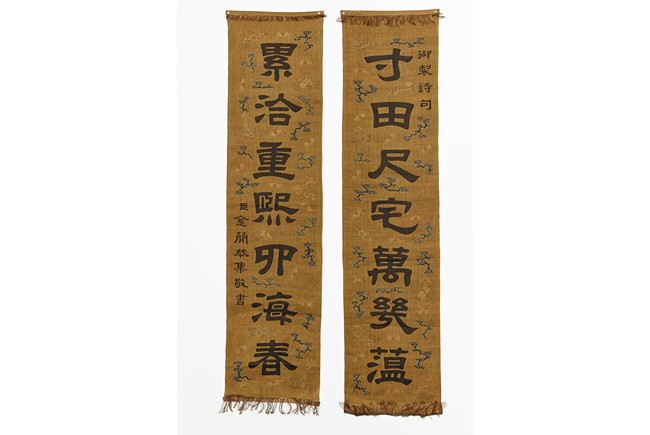 Woven with imperial poem couplet, each kesi panel with seven character, all set against gold background interspersed with lingzhi, auspicious bats, and scholar's object motifs. 19th Century