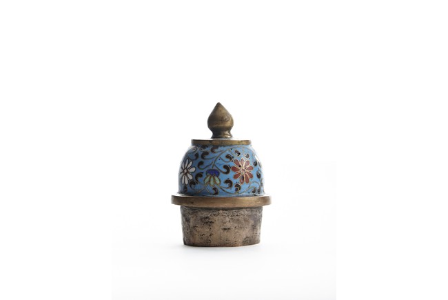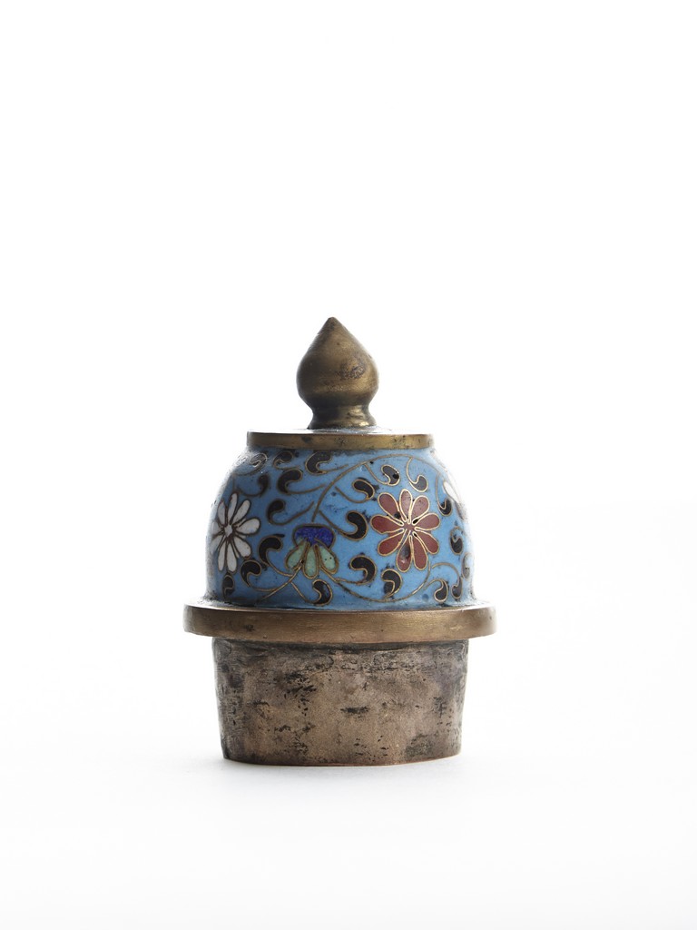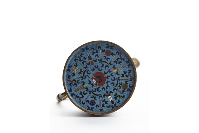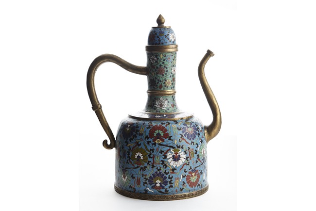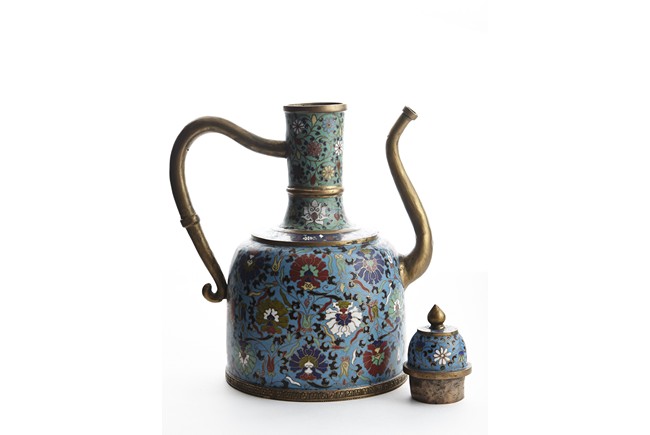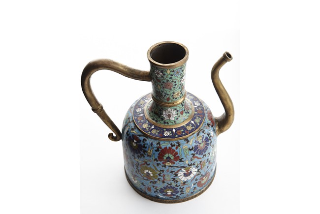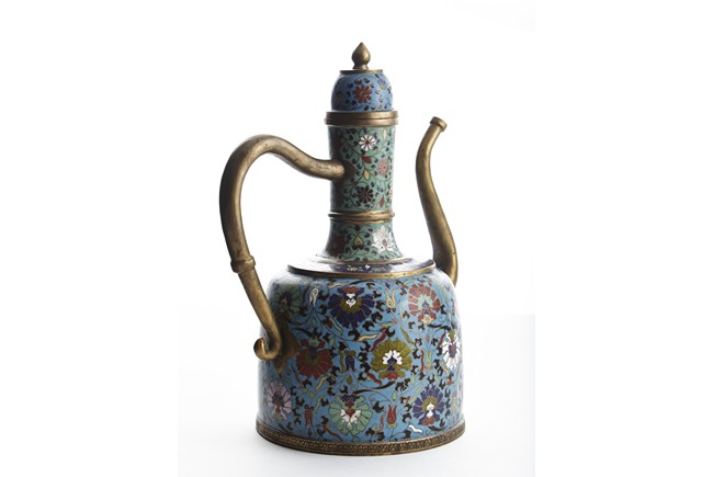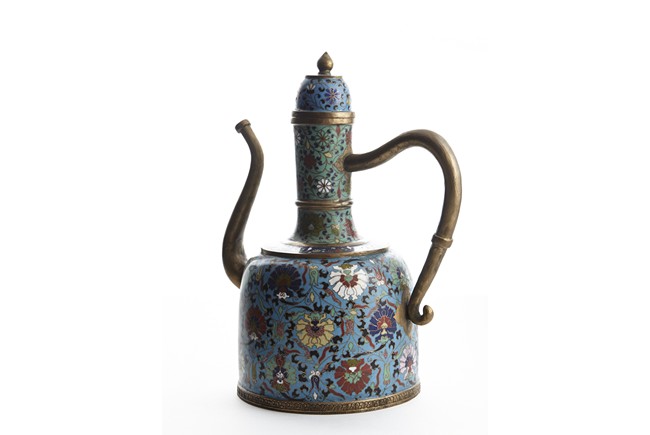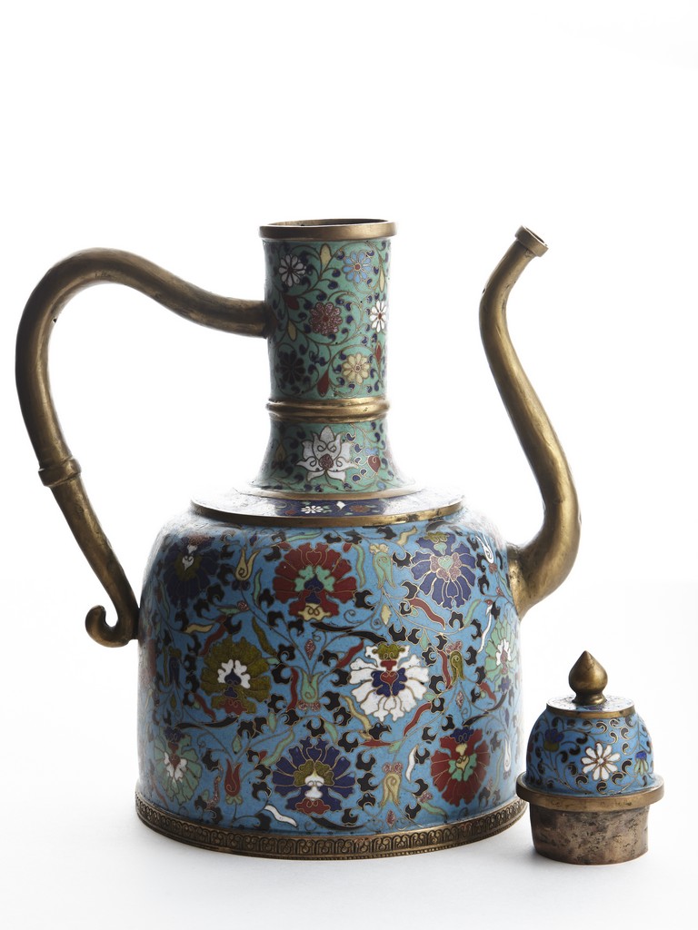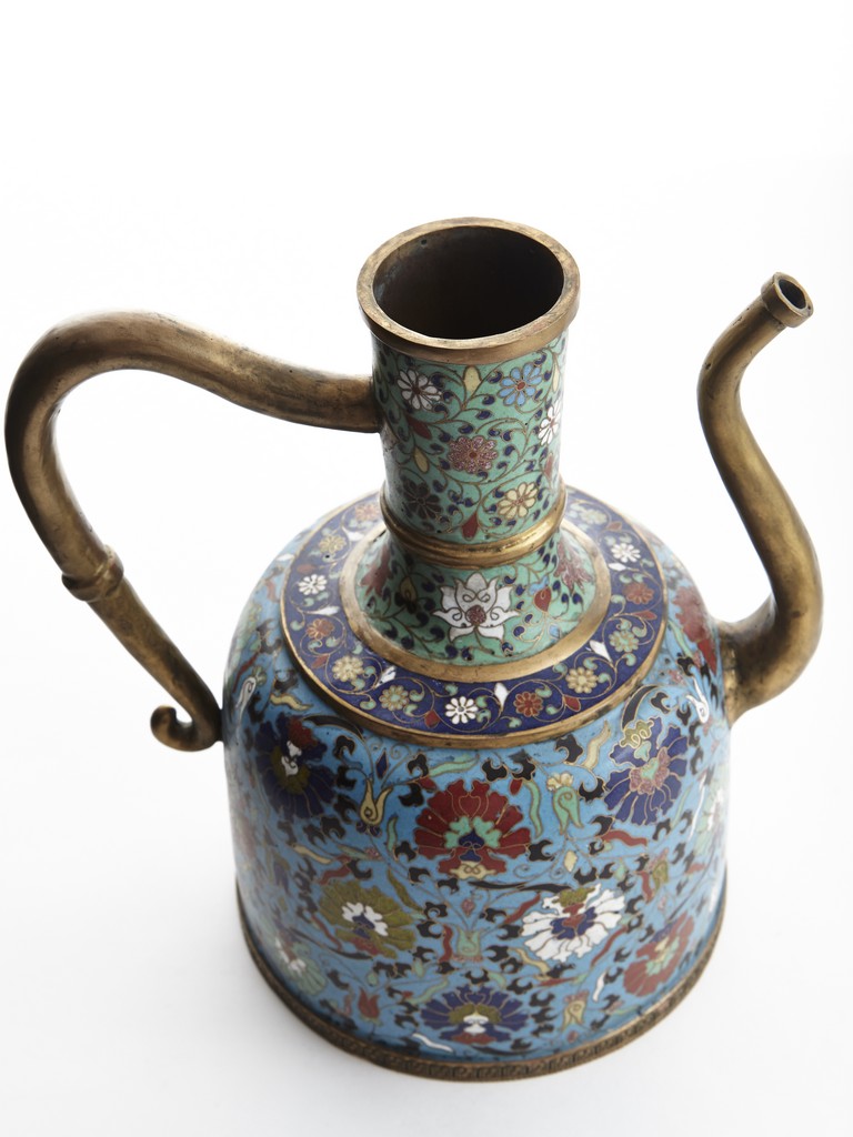 Rising from spreading foot ring to long neck, the bulbous body and neck finely enamelled against turquoise ground with stylized scrolling lotus and leaf motif, the curved handle and spout in gilt-bronze. Qing Dynasty period.