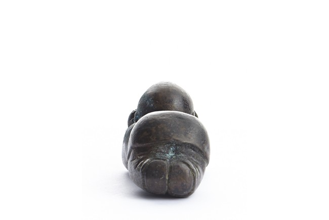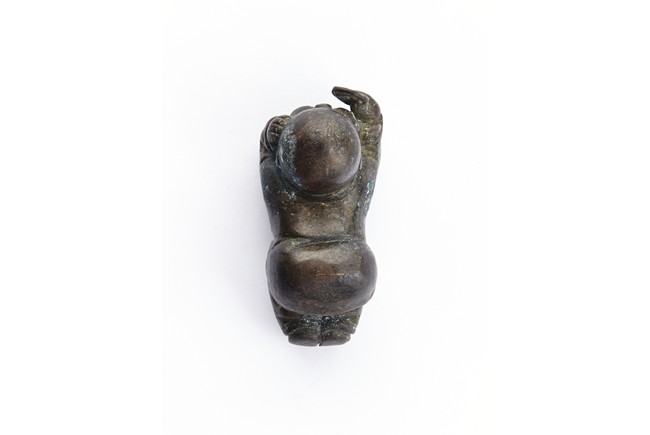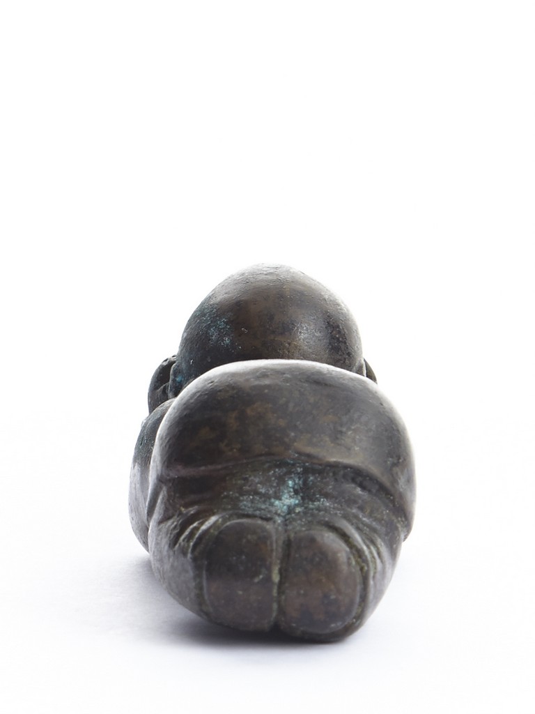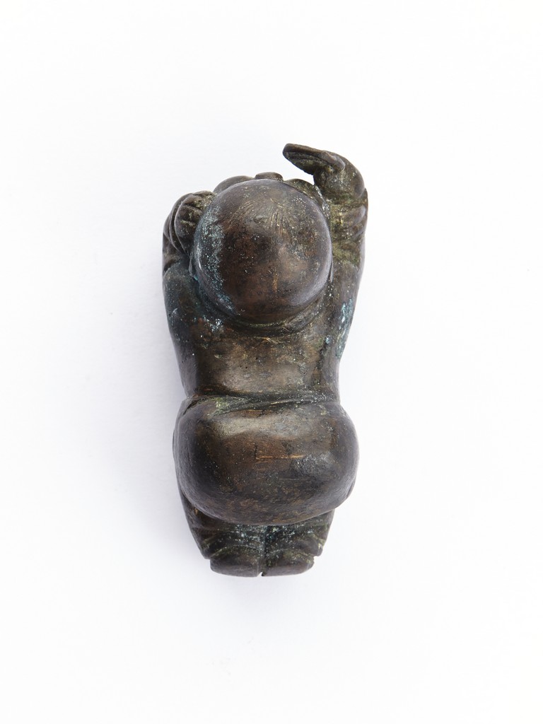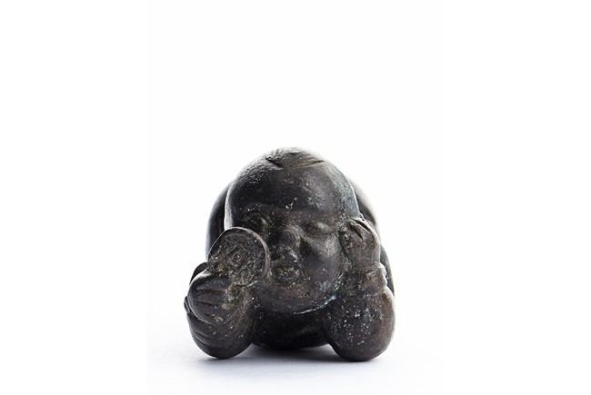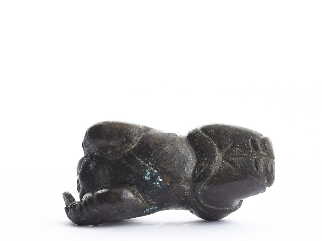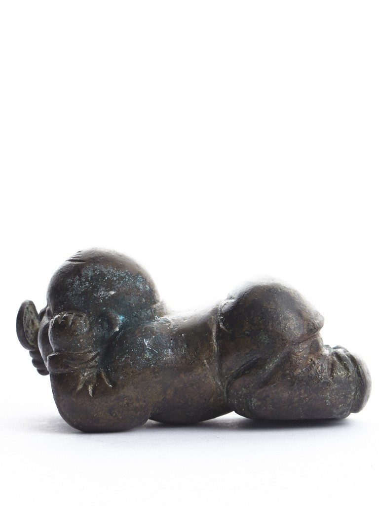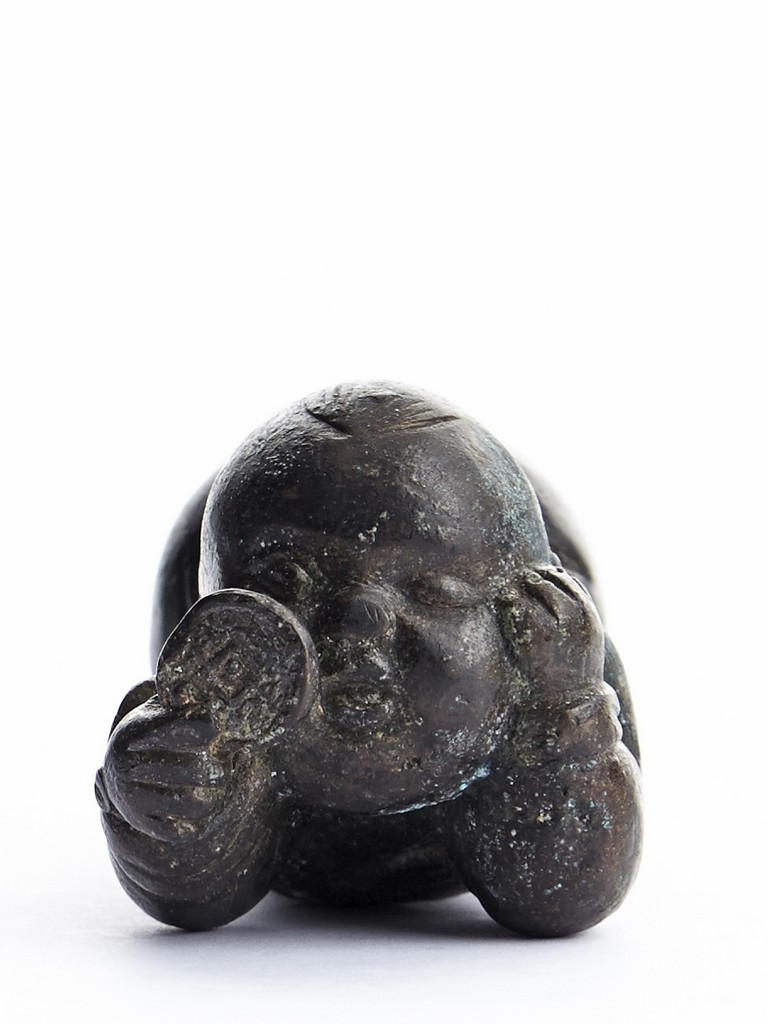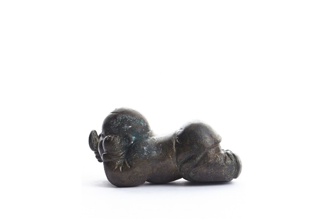 A BRONZE 'CHILD' PAPER WEIGHT 清 銅質童子持鏡鎮紙