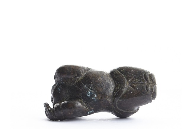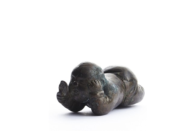 Modelled in the form of a boy lying prone looking at a mirror in his hand. Qing Dynasty period.