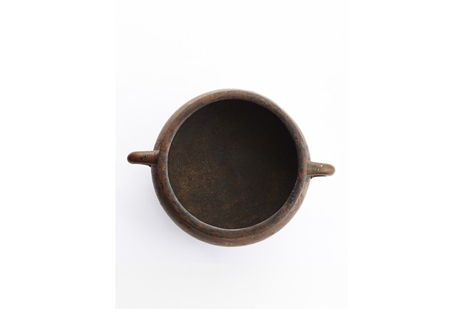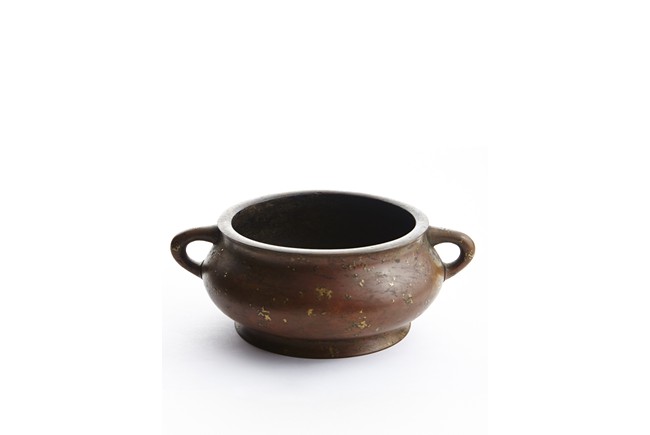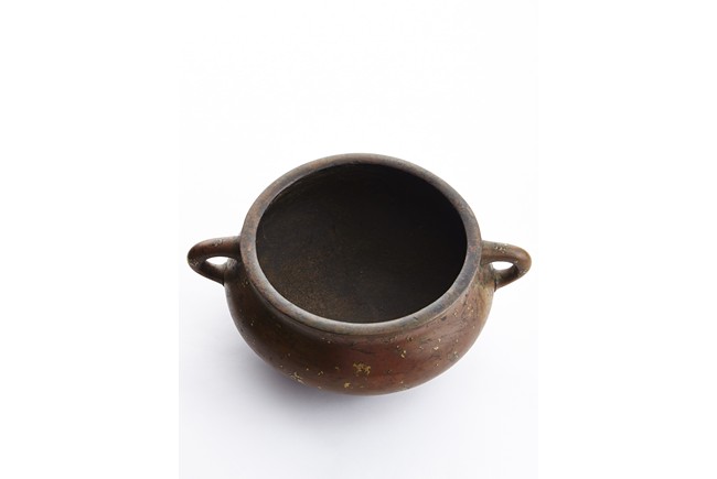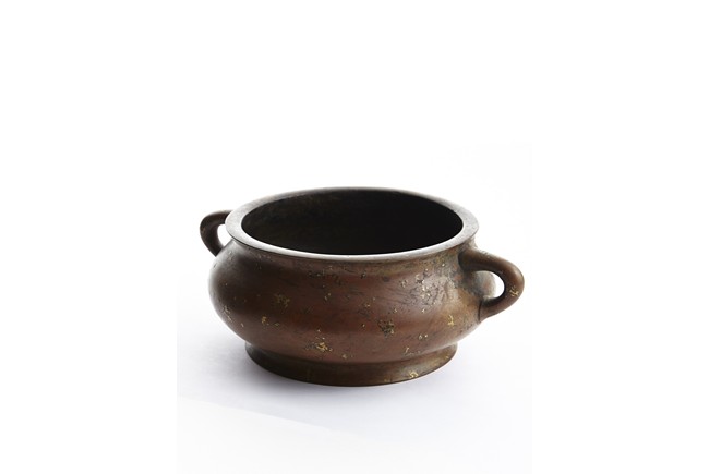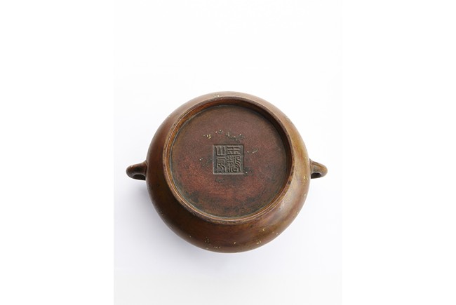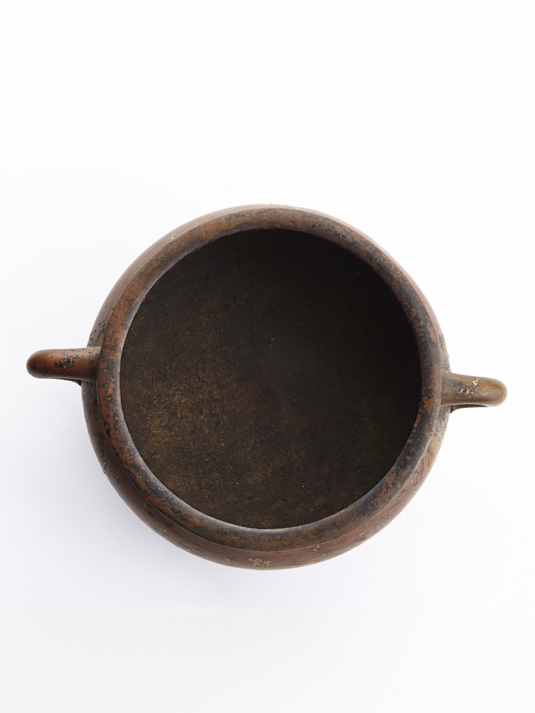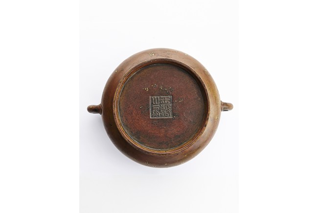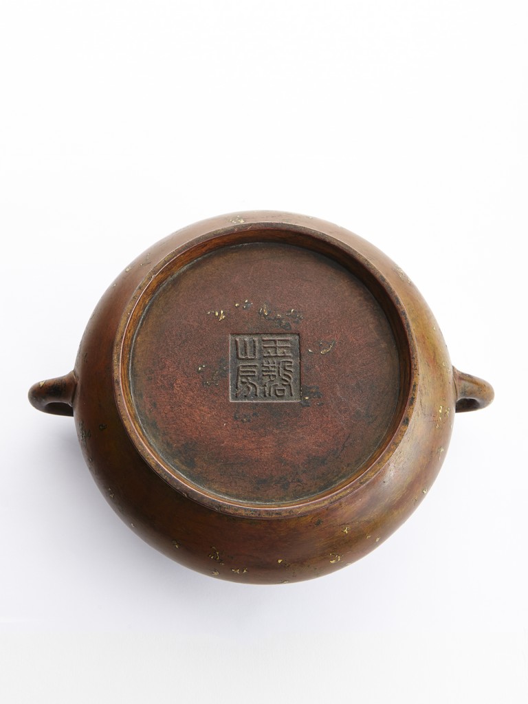Of compressed globular form with a pair of loop handles, the censer rises from flared feet, the body with irregular gold splashes. The base bears four character 'Yu Qing Shan Fang'. Qing Dynasty period.