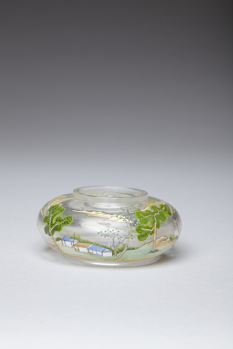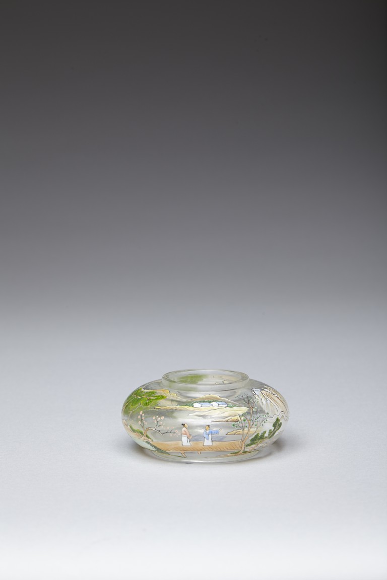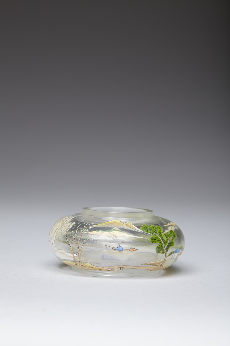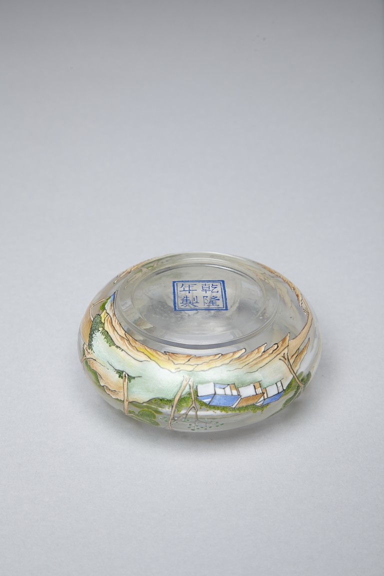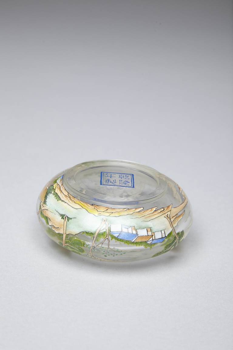 Of compressed globular form, the body finely painted in various pigments with a continous landscape scene, depicting two figures on a bridge, with dwellings on riverbank amongst tall trees and a man fishing on a boat, with hills to the far distance. The base painted with four character 'QIANLONG' mark. Qing Dynasty period.