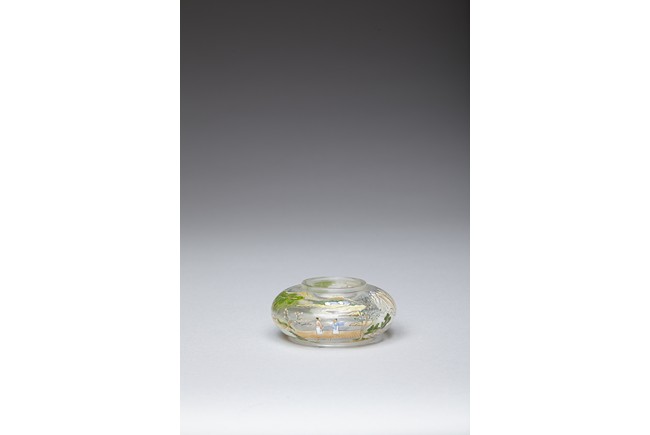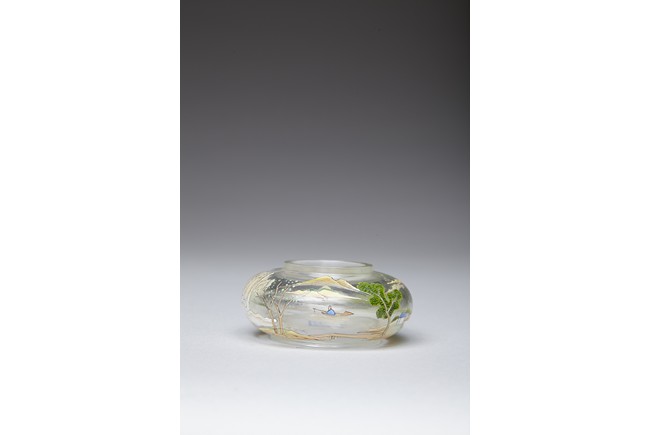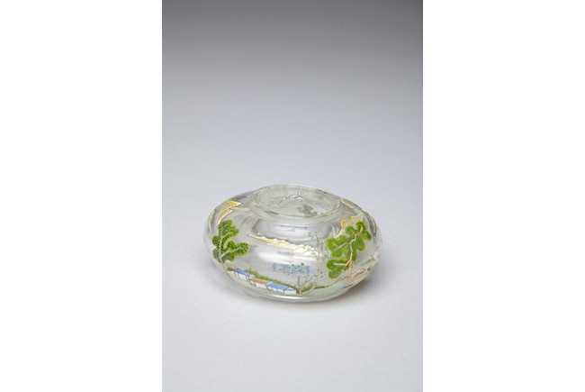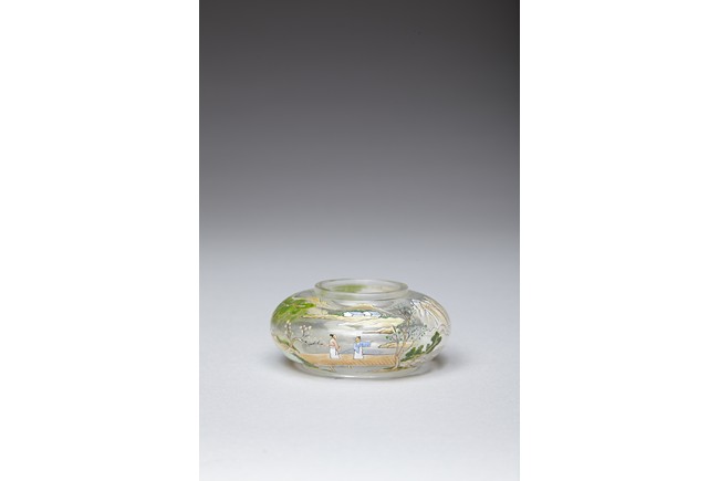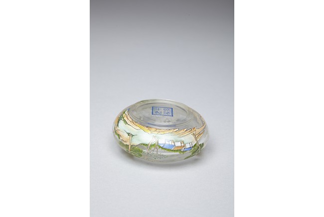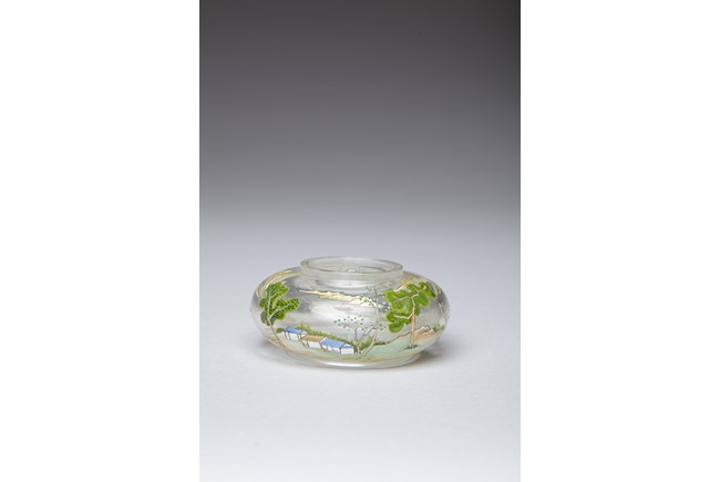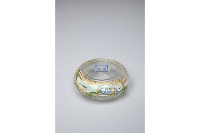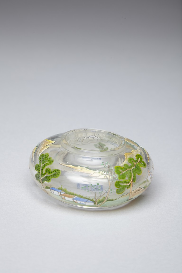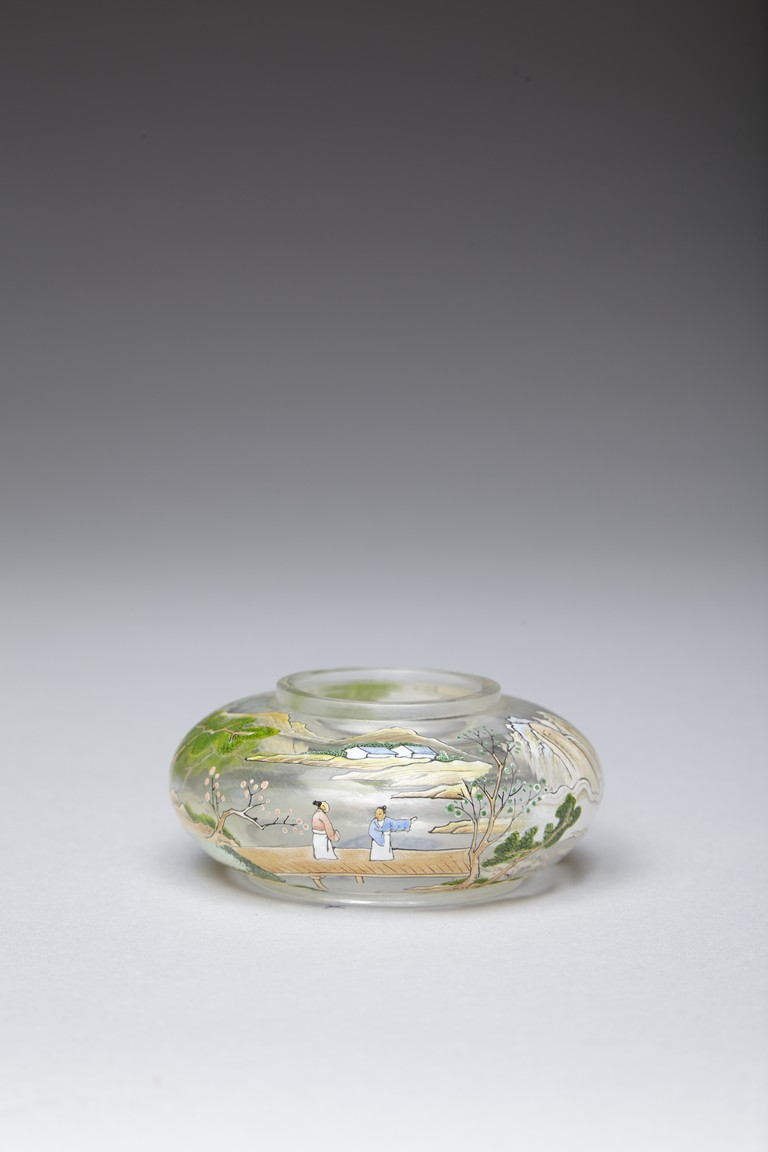 Of compressed globular form, the body finely painted in various pigments with a continous landscape scene, depicting two figures on a bridge, with dwellings on riverbank amongst tall trees and a man fishing on a boat, with hills to the far distance. The base painted with four character 'QIANLONG' mark. Qing Dynasty period.