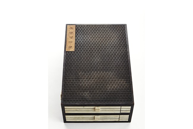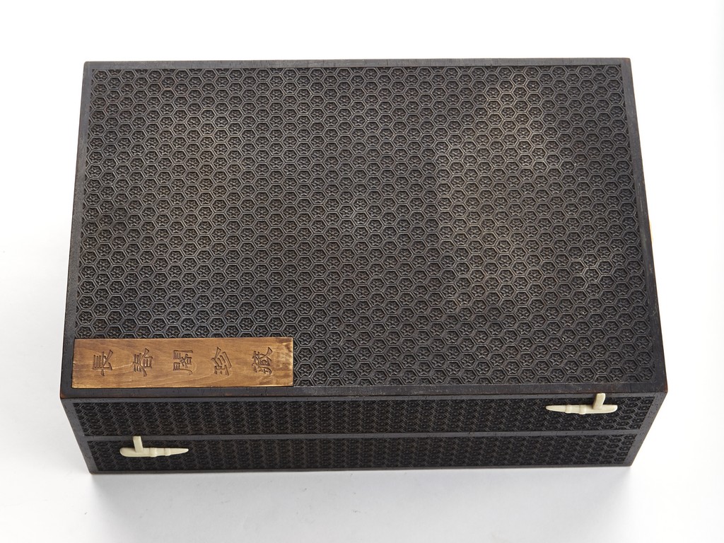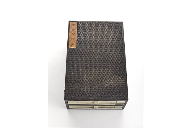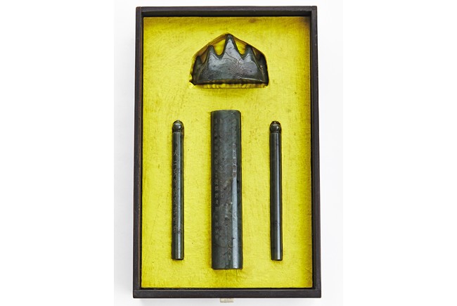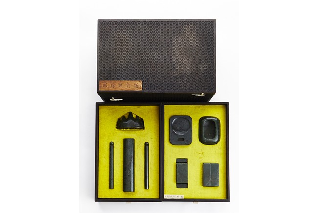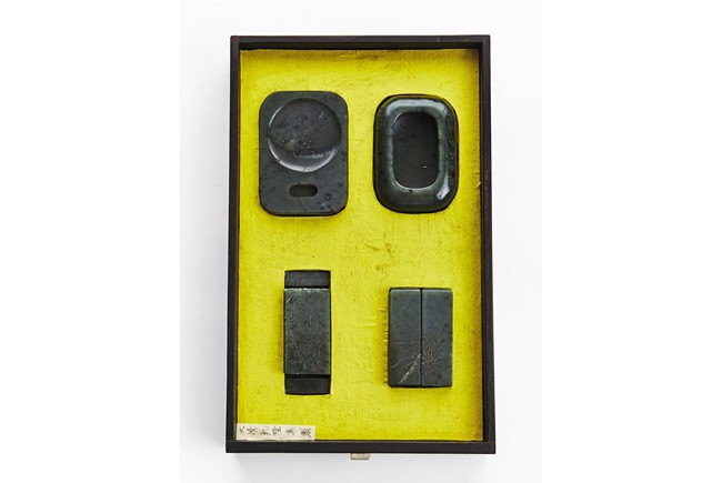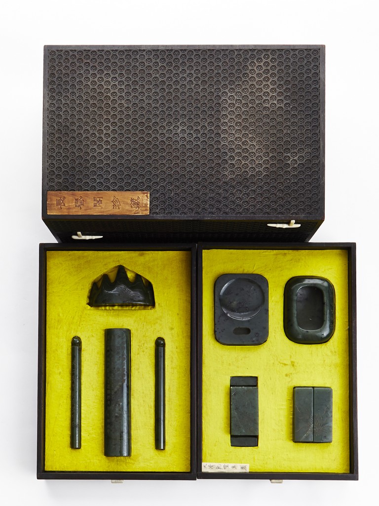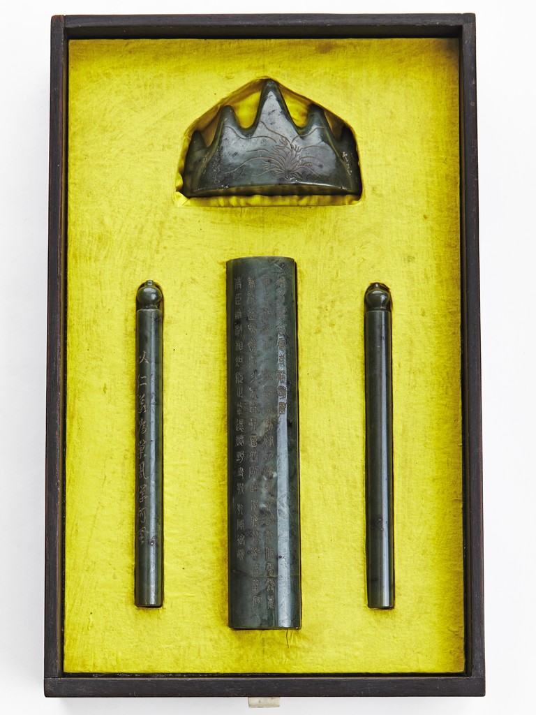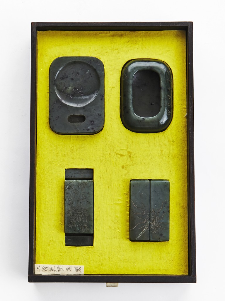 Comprising of one brush rest, one inscribed paper weight, one inkstone, one washer, all carved out of translucent rich-green spinach jade stone.