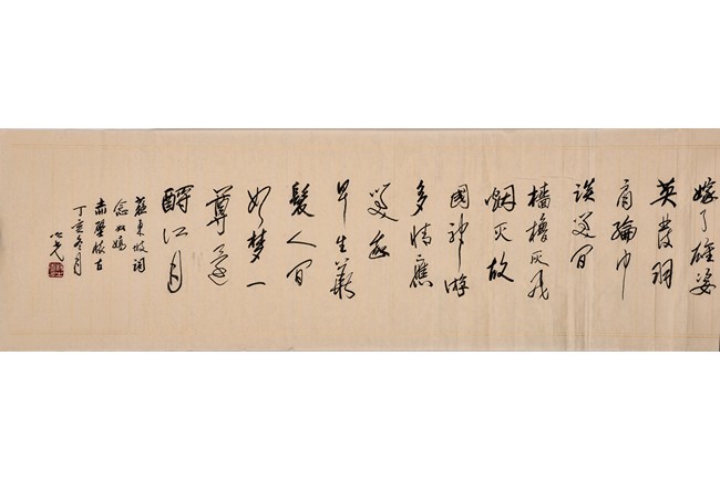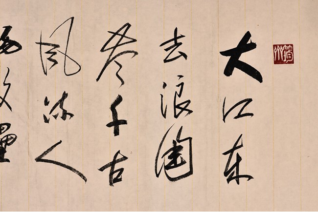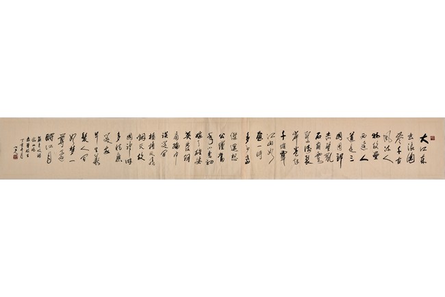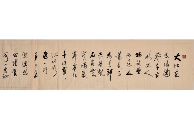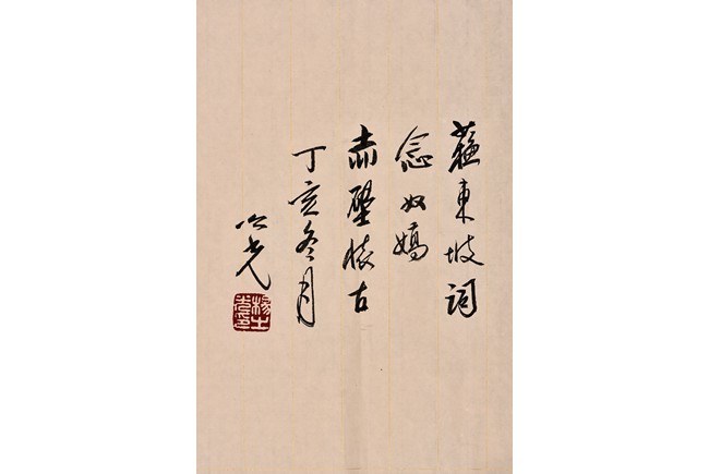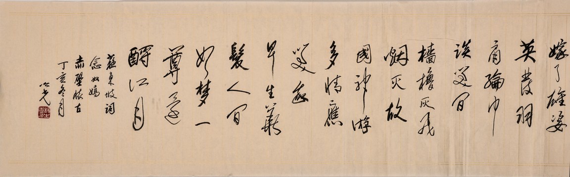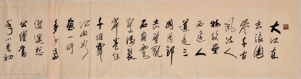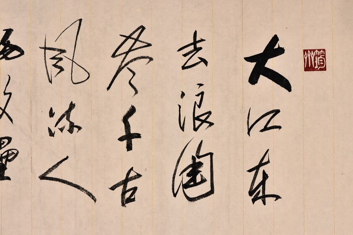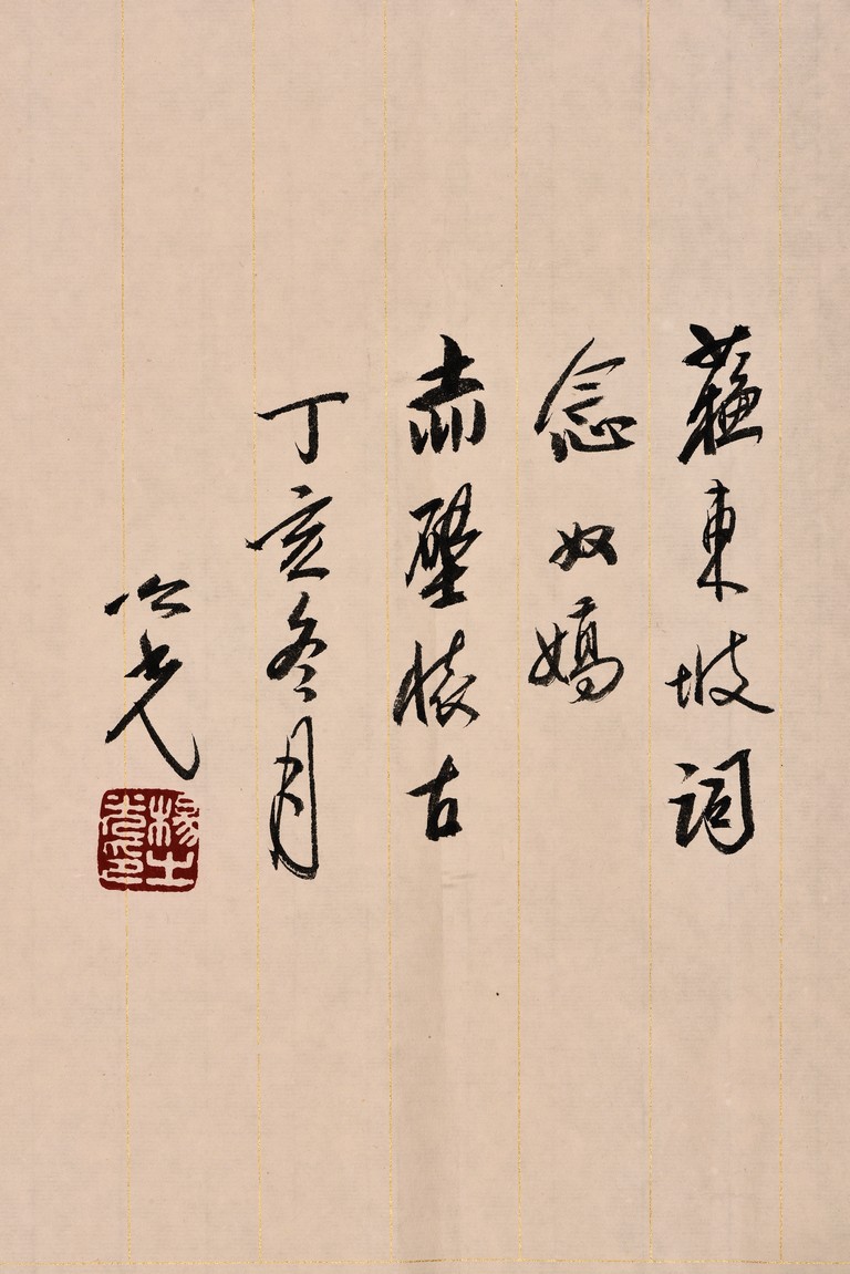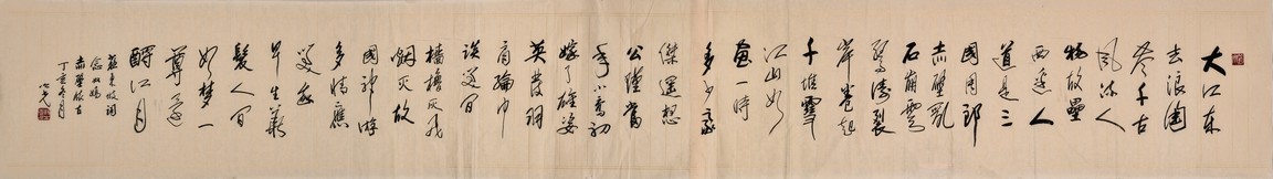 Ink on paper. Running script. Reminiscing Red Cliff (Nian Nu Jiao). With artist inscription and signature, accompanied by two seals of the artist. Dated to the winter of 2007.