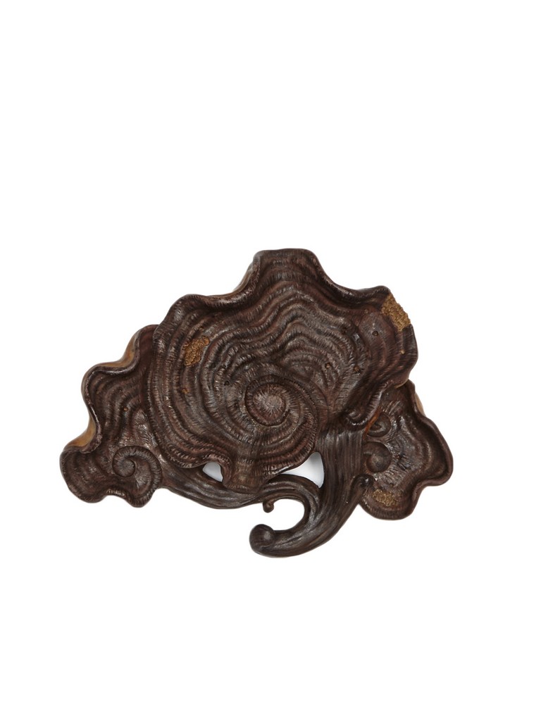 Realistically carved as three Lingzhi mushrooms heads of various sizes from a single branch, the base with two incised character 'Wo Ju'.