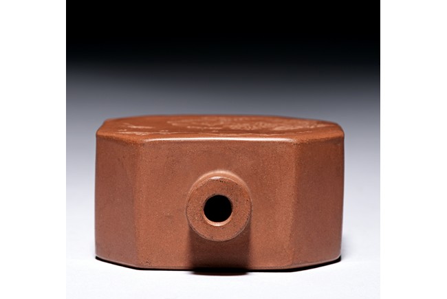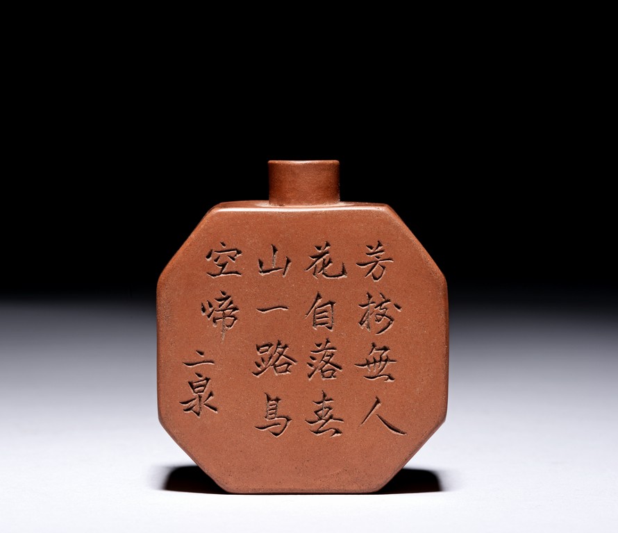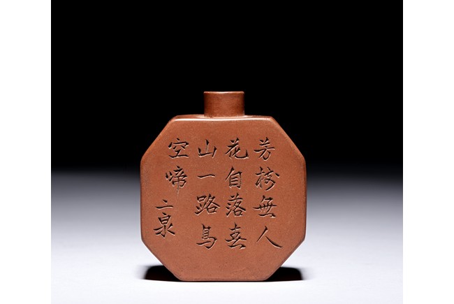 Of octagonal form, the body incised with poem and signed 'Er Quan' to the front, the reverse with landscape, the bottom with impressed mark. Qing Dynasty period.