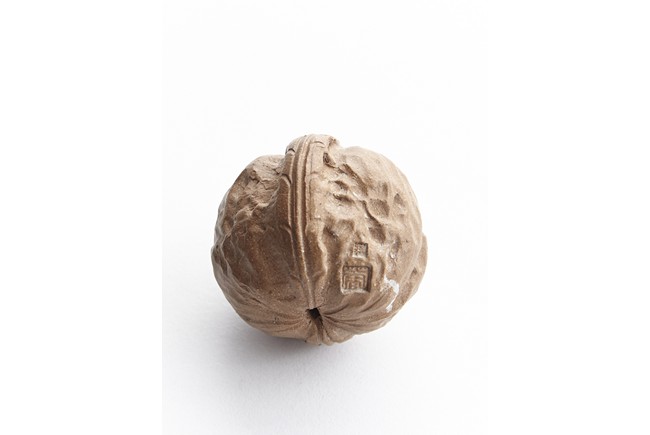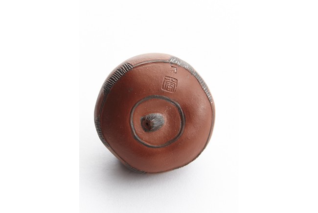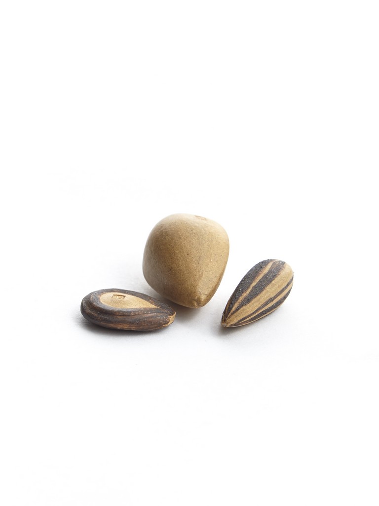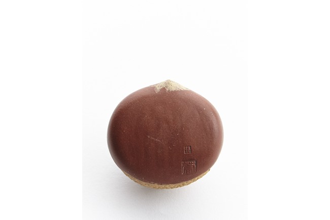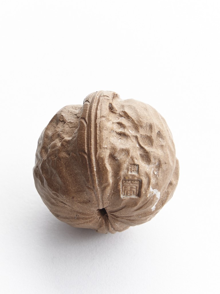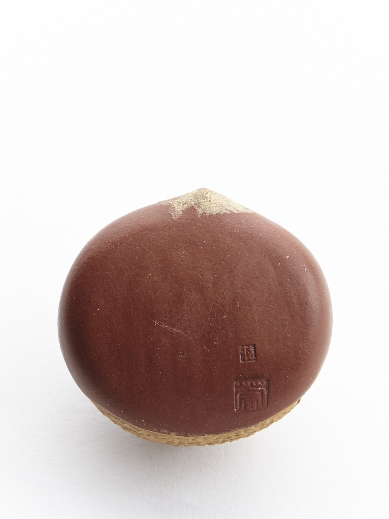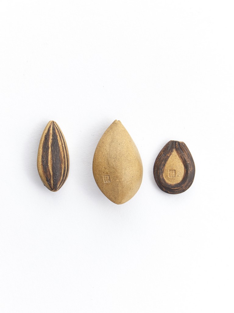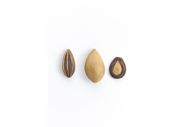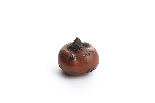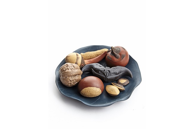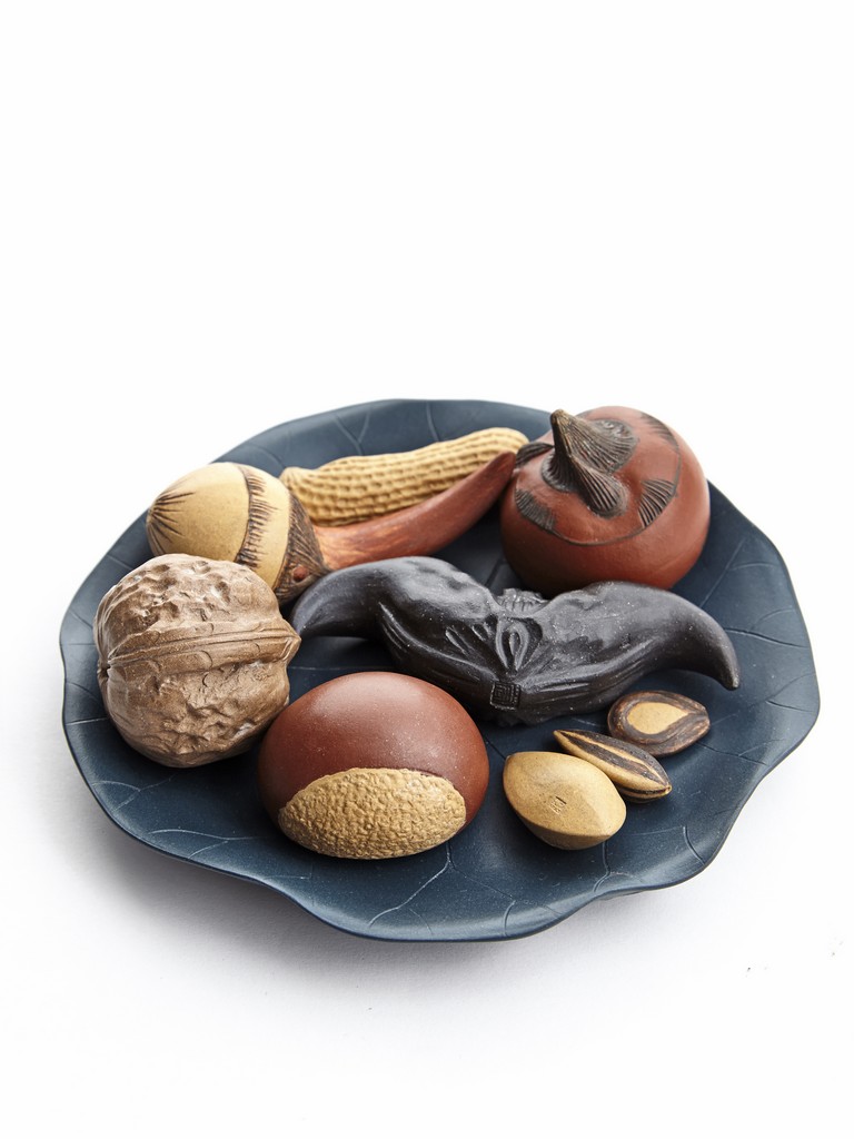 The present Yixing zishaware set comprises of water chestnut, water caltrop, chestnut, walnut, Chinese walnut, Sagittaria, ginkgo nut, watermelon seed, sunflower seed, and lotus, utilizing different tones of clays to imitate the actual objects.